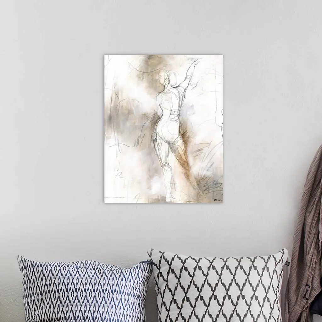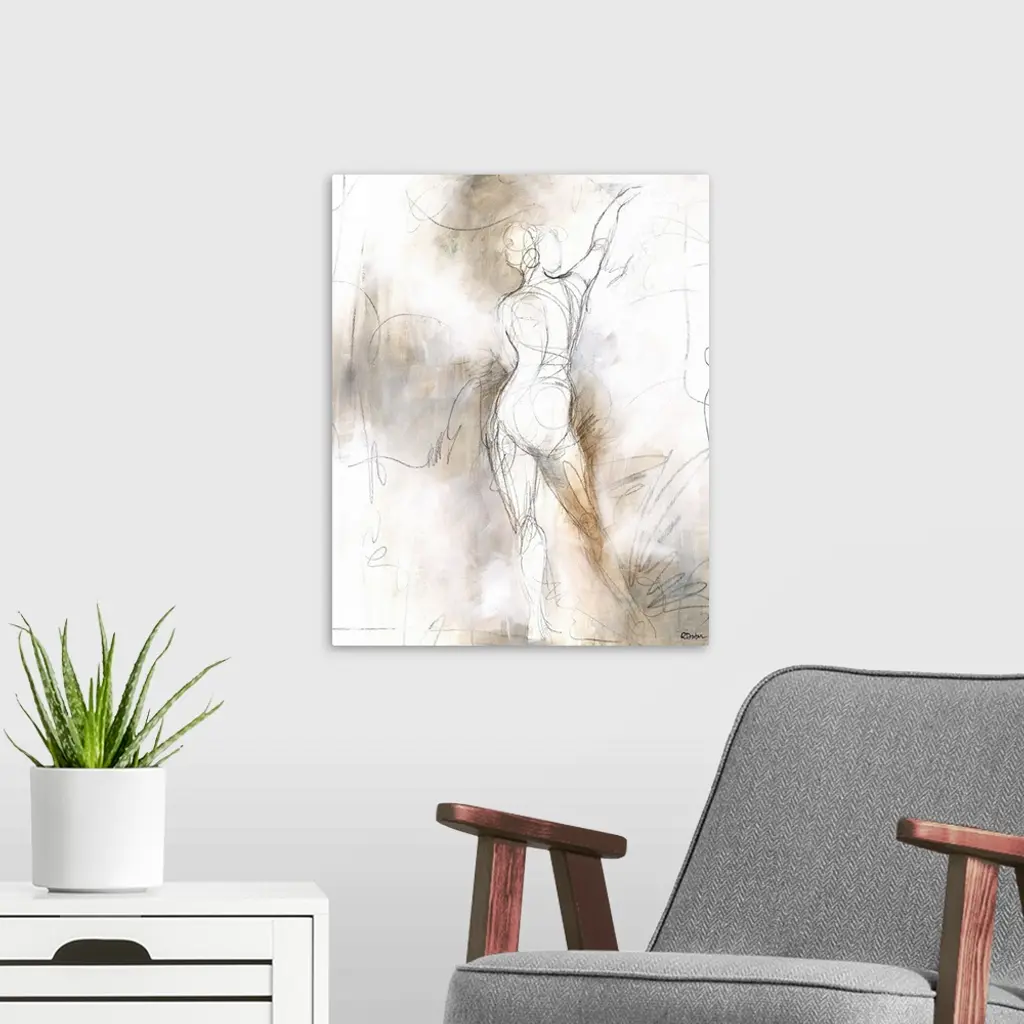 Contemporary abstract painting using neutral tones surrounding a sketch lined female form.