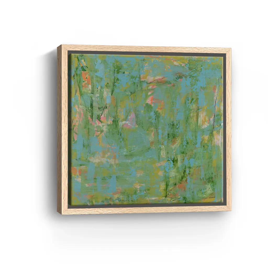 A harmonious blend of turquoise, sage, and blush tones evokes the serenity of a sunlit woodland, abstracted through layered, expressive brushwork. This ethereal composition brings a dreamy, painterly calm to any space with its lush color palette and organic movement. Our Gallery Wrap Canvas Prints are proudly assembled with high quality materials in California, USA. Each piece is printed on a thick, archival grade canvas using Giclee technology. It is then hand-stretched by our experienced artisans over solid wood bars, which will not warp over time. The final product is a piece personally crafted for you to confidently display on your wall. Care and Assembly: Ensure that the location of your piece has little to no exposure to heat, sunlight, and moisture. Wipe clean, only if needed. Each piece includes hanging hardware to hang on your wall horizontally.