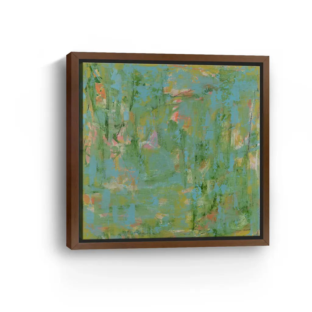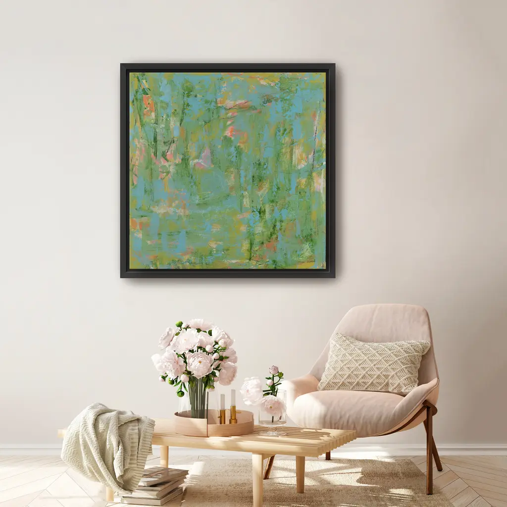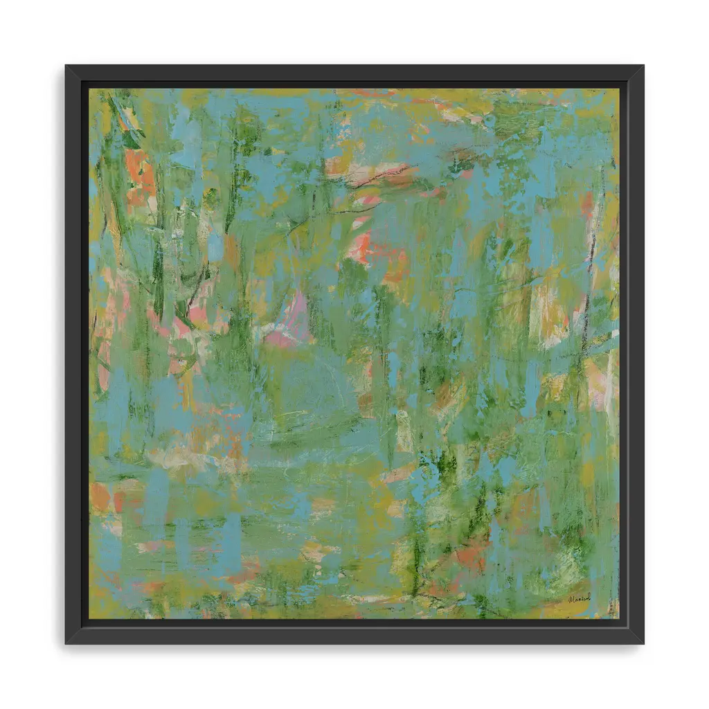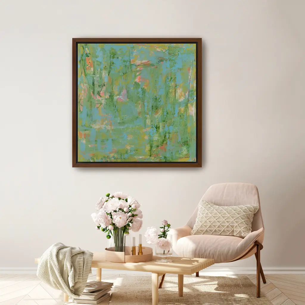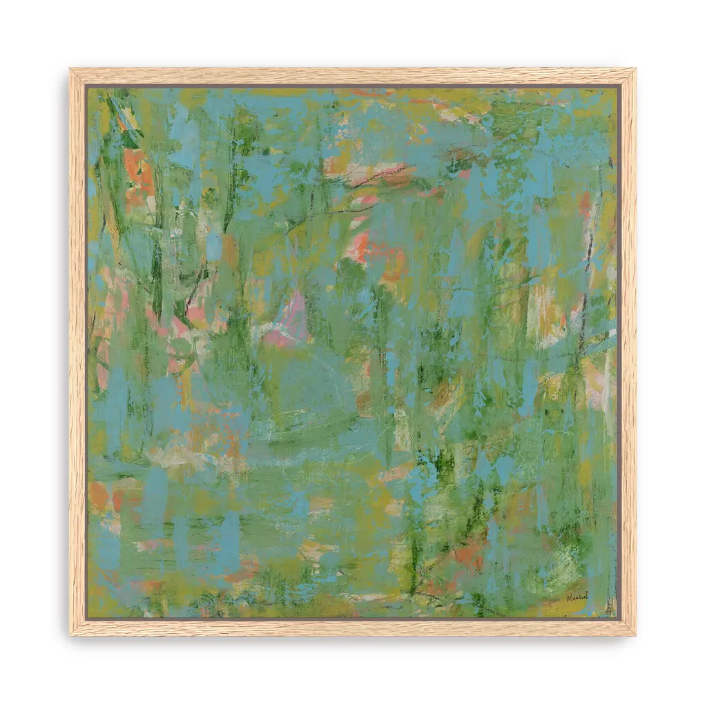 A harmonious blend of turquoise, sage, and blush tones evokes the serenity of a sunlit woodland, abstracted through layered, expressive brushwork. This ethereal composition brings a dreamy, painterly calm to any space with its lush color palette and organic movement. Our Gallery Wrap Canvas Prints are proudly assembled with high quality materials in California, USA. Each piece is printed on a thick, archival grade canvas using Giclee technology. It is then hand-stretched by our experienced artisans over solid wood bars, which will not warp over time. The final product is a piece personally crafted for you to confidently display on your wall. Care and Assembly: Ensure that the location of your piece has little to no exposure to heat, sunlight, and moisture. Wipe clean, only if needed. Each piece includes hanging hardware to hang on your wall horizontally.