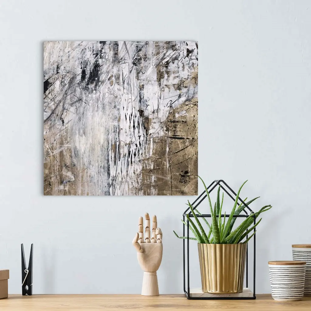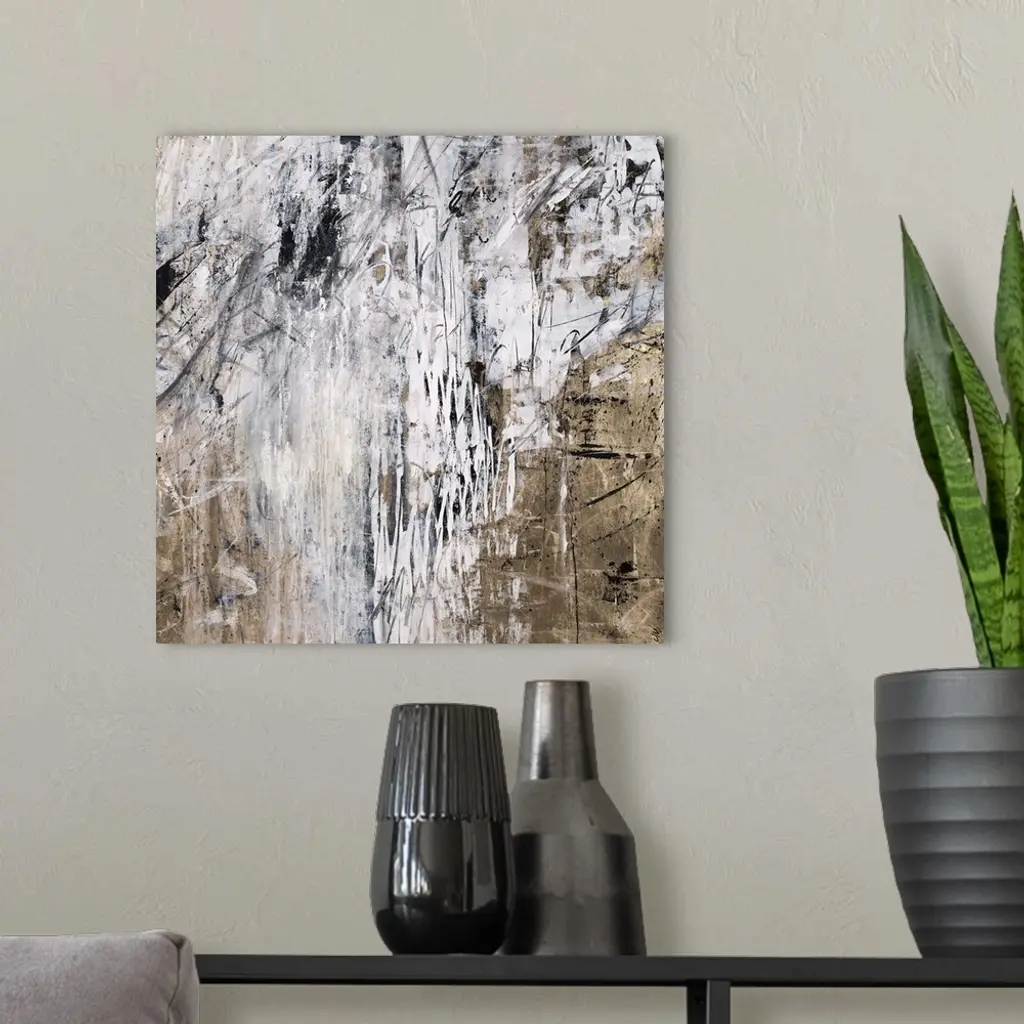 Abstract painting using washed out light colors dripping over earth textured looking earth tones.