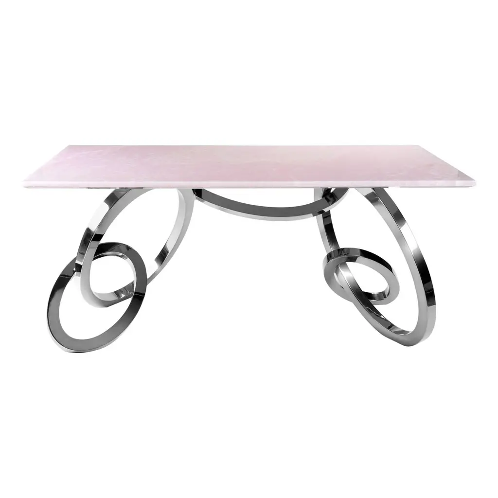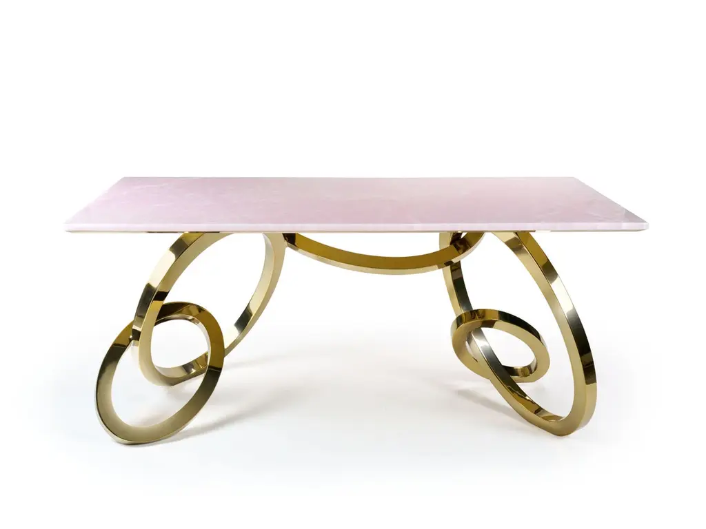 Gold Bangles Desk by Barberini & GunnellLimited Edition of 15Dimensions: D 87 x W 180 x H 76 cm.Materials: Pink Onyx, mirror polished stainless steel, gold varnish.Limited Edition, signed and numbered by the artists, comes with a Certificate of Authenticity.Barberini & Gunnell, founded in 2009 in Ancona, Italy by architects Francesco Barberini and Nina A. Gunnell, is the result of a philosophy, thinking of design and architecture as a work of art. The architectural and interior design activity carried out by ‘The Studio’ complements the creations of ‘The Atelier’, which are the result of an artistic playground and highly skilled craftsmanship, a place where artworks and sculptures come to life.The Studio Barberini & Gunnell designs high-end residential and retail spaces that are out of the ordinary and beyond fashion. Barberini & Gunnell creates refined, timeless, and harmonious environments by inserting collectible design, “talking pieces” that create unique and bespoke homes according to the client’s eclectic and aesthetic desires.The Atelier Barberini & Gunnell creates artworks and collectible designs, one-off pieces, and limited editions for a small niche of high-end projects; bespoke solutions for luxury and ultra-luxury projects all over the world.The choice of the most precious materials, the maniacal cure for detail is the basis of our modus operandi aiming to create timeless pieces, using marine grade stainless steel, brass, cast bronze, precious wood essences, marbles, onyxes, semi-precious gemstones, crystal glass, together with the most sophisticated technologies and quality craftsmanship.This allows us to work for clients like Four Seasons Hotels, The Ritz Carlton, Regent Seven Seas Cruises, Louis Vuitton, Cartier, Dior, Paramount Pictures, Peter Marino Architects, Sotheby’s, Bonhams, Foundation of Maestro Andrea Bocelli, Ridley Scott (House of Gucci) besides our private collectors and clients.Values such as sustainability, the use of natural materials, the rediscovery of eco-sustainable craftsmanship, and the protection of refined and ancient techniques that are increasingly being lost are the basis of the design.Barberini & Gunnell’s signature works are exhibited at international art fairs such as Art Basel Design//Miami, Art Miami, Art Basel Switzerland, PAD London, PAD Genève, PAD Paris, PAD Monaco, Salon Art+Design New York…