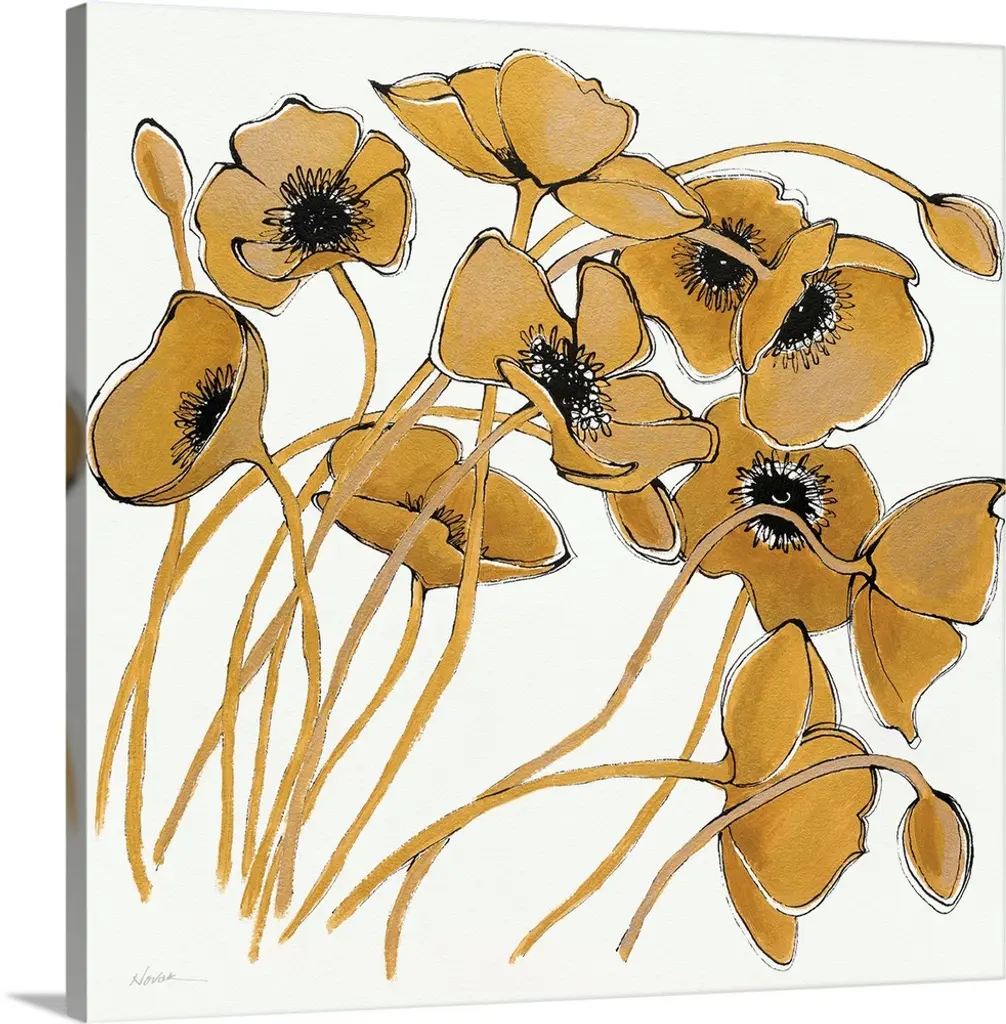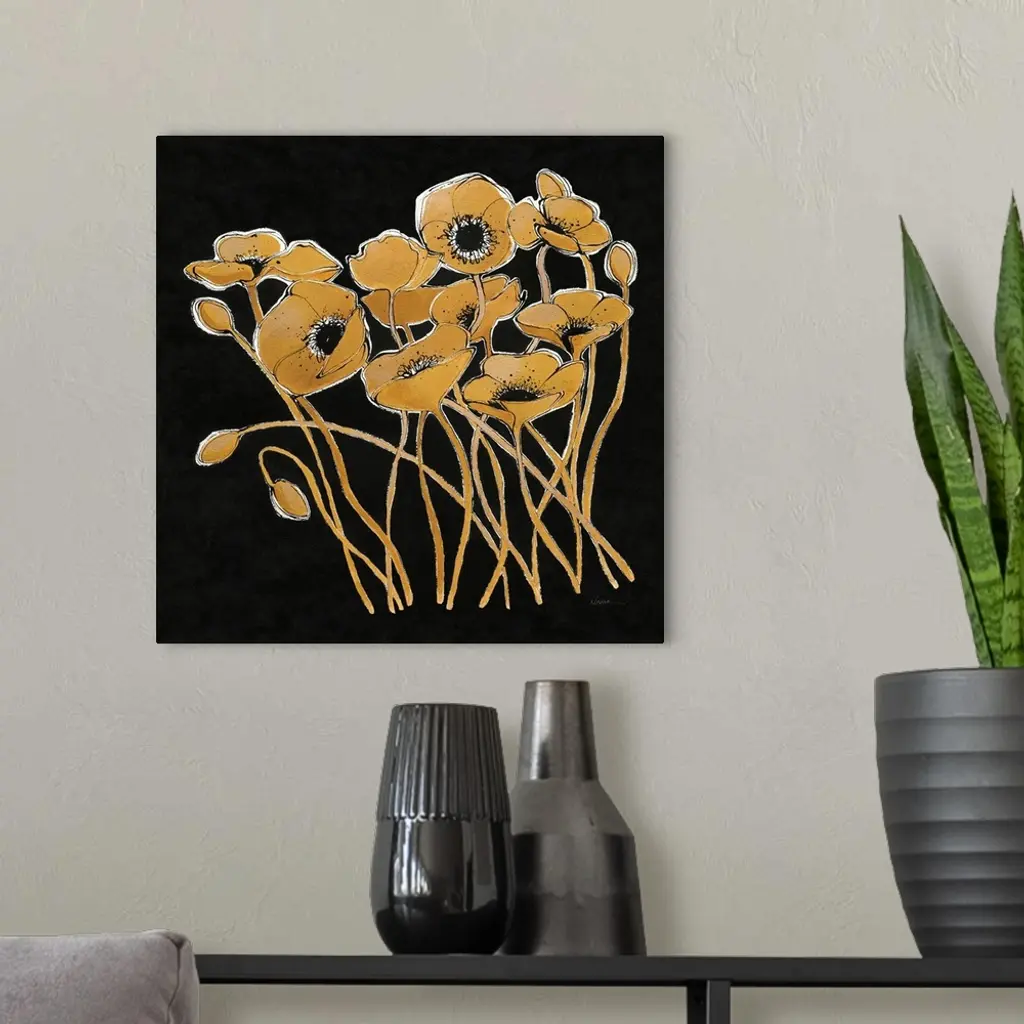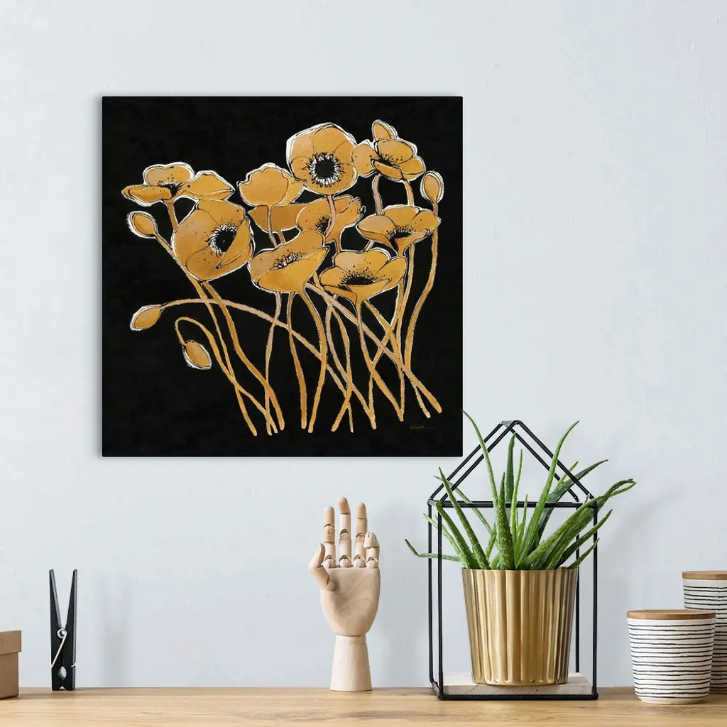 Square painting of metallic gold poppy flowers with black centers on a solid black background.
