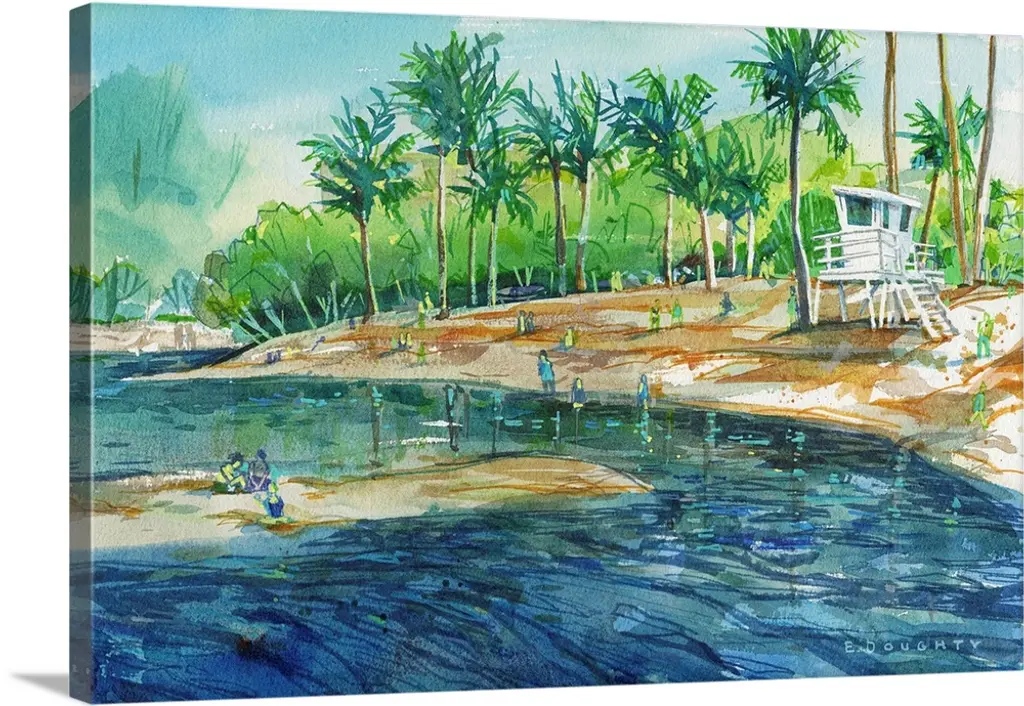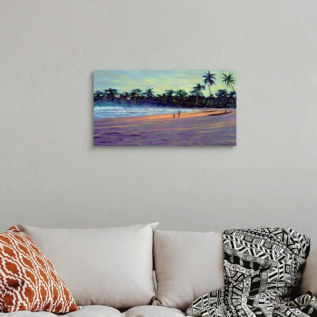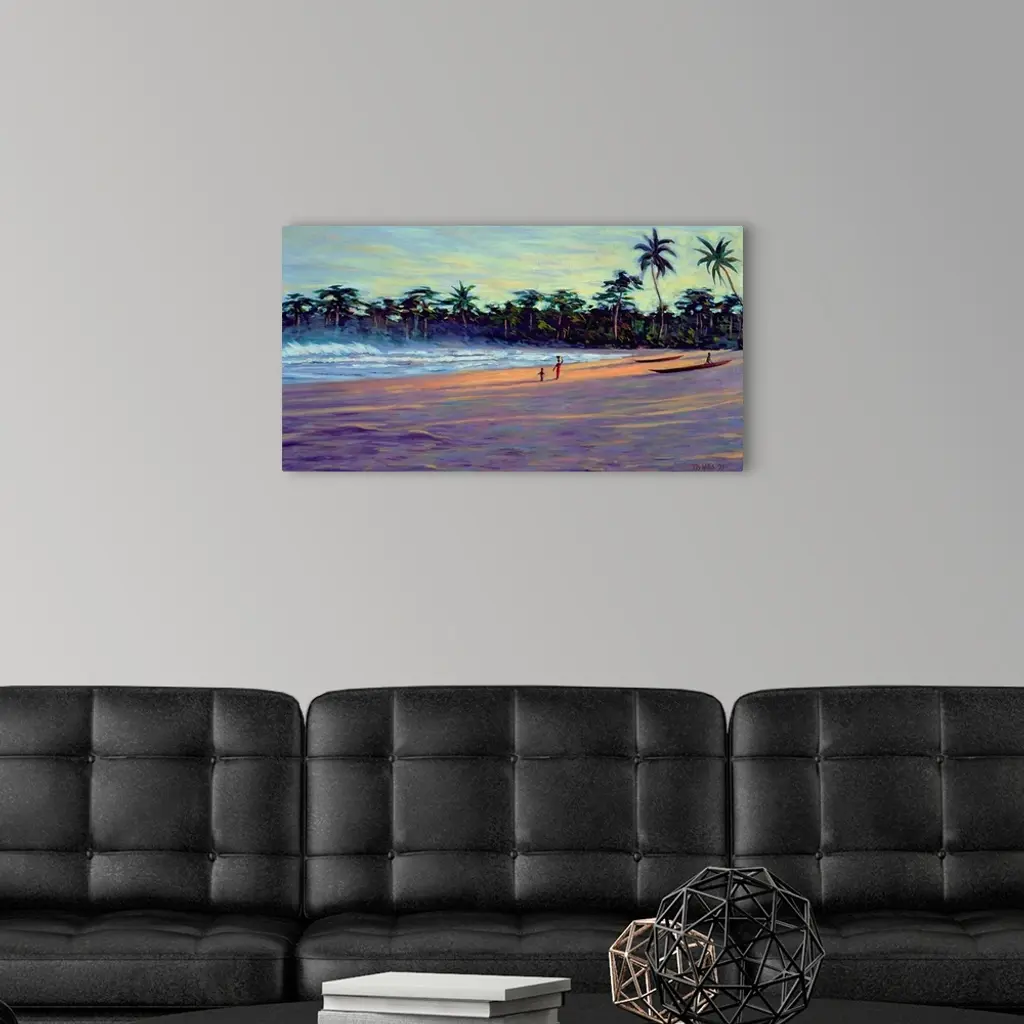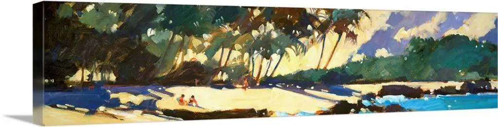 Painting of beach shore with waves rolling in and Palm trees in the distance. There are canoes on the sand and people walking on the seaside.
