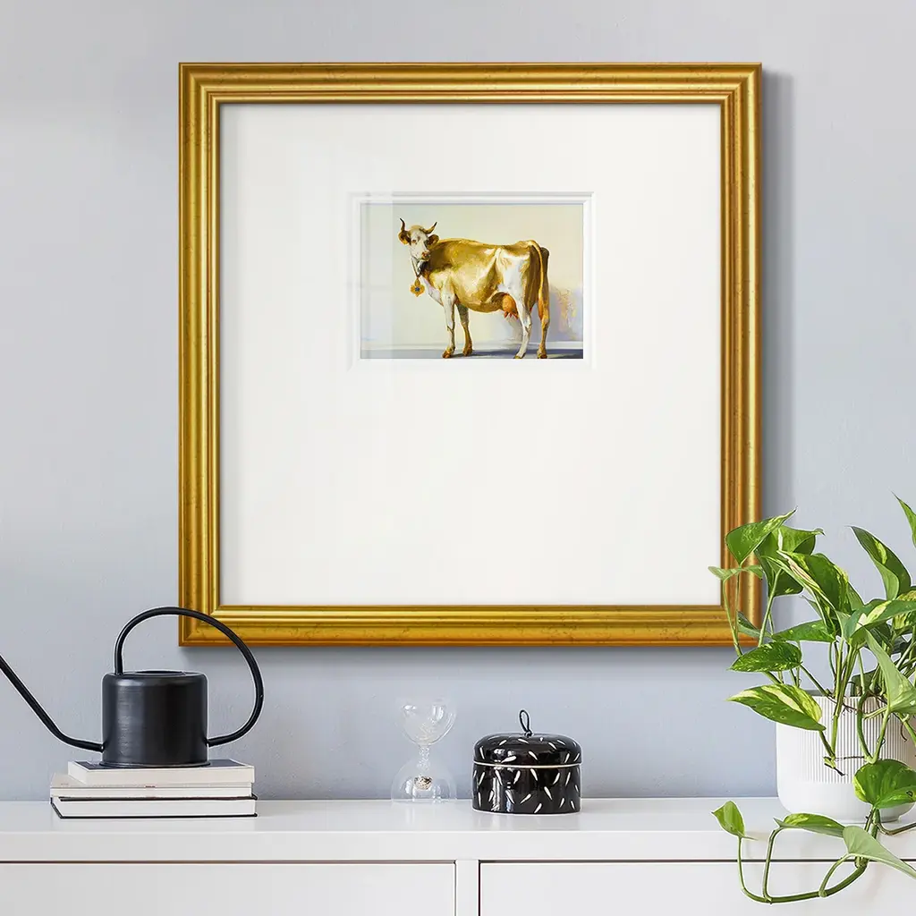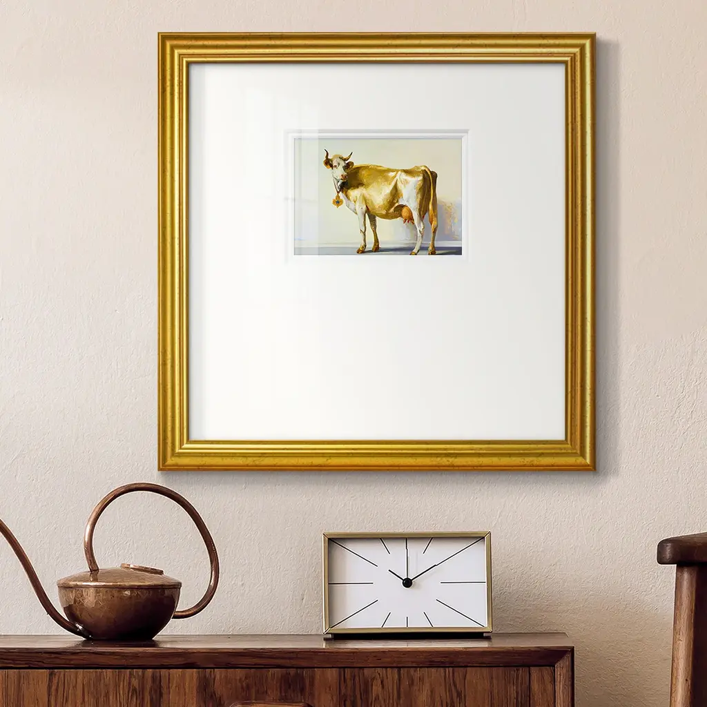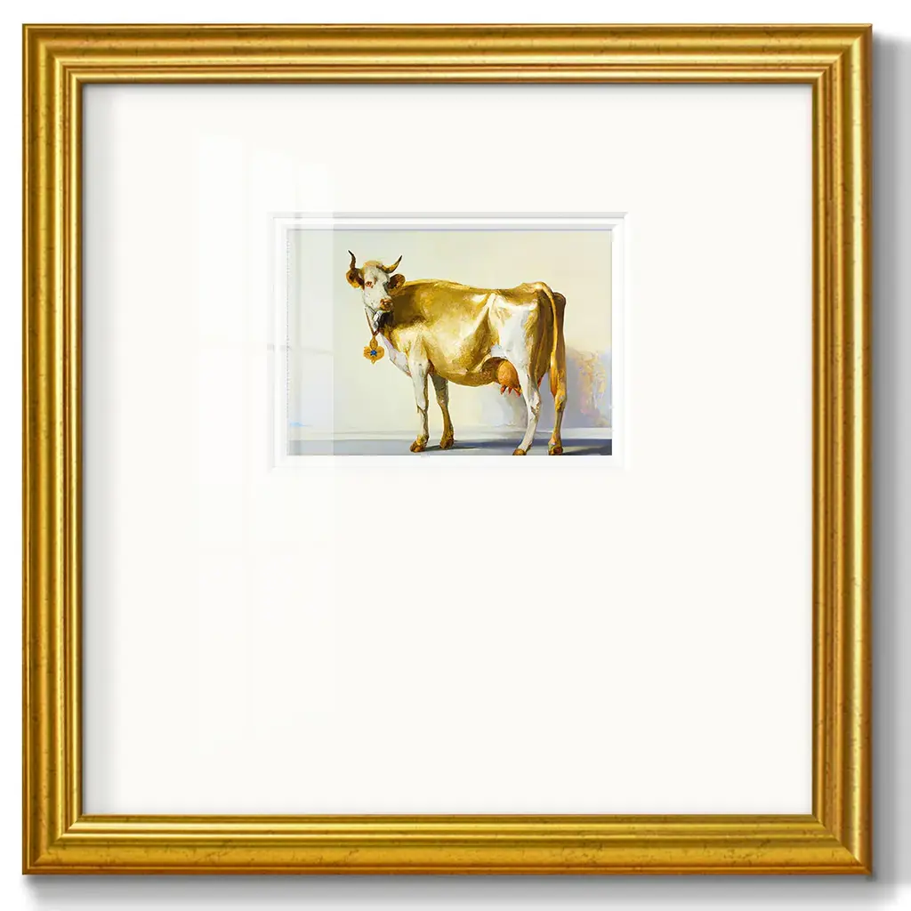 Gold CowPremium Framed Print A framed cold pressed paper print featuring superior double matting and quality frame. 2 SIZES AVAILABLE 16''X16''' - Overall Size 20''X20''' - Overall Size Each piece is made to order. Each piece comes with hanging hardware. Made in the USA Ready to Hang Giclee Paper Print Plexiglass Beveled Matt Board Double Matte Board