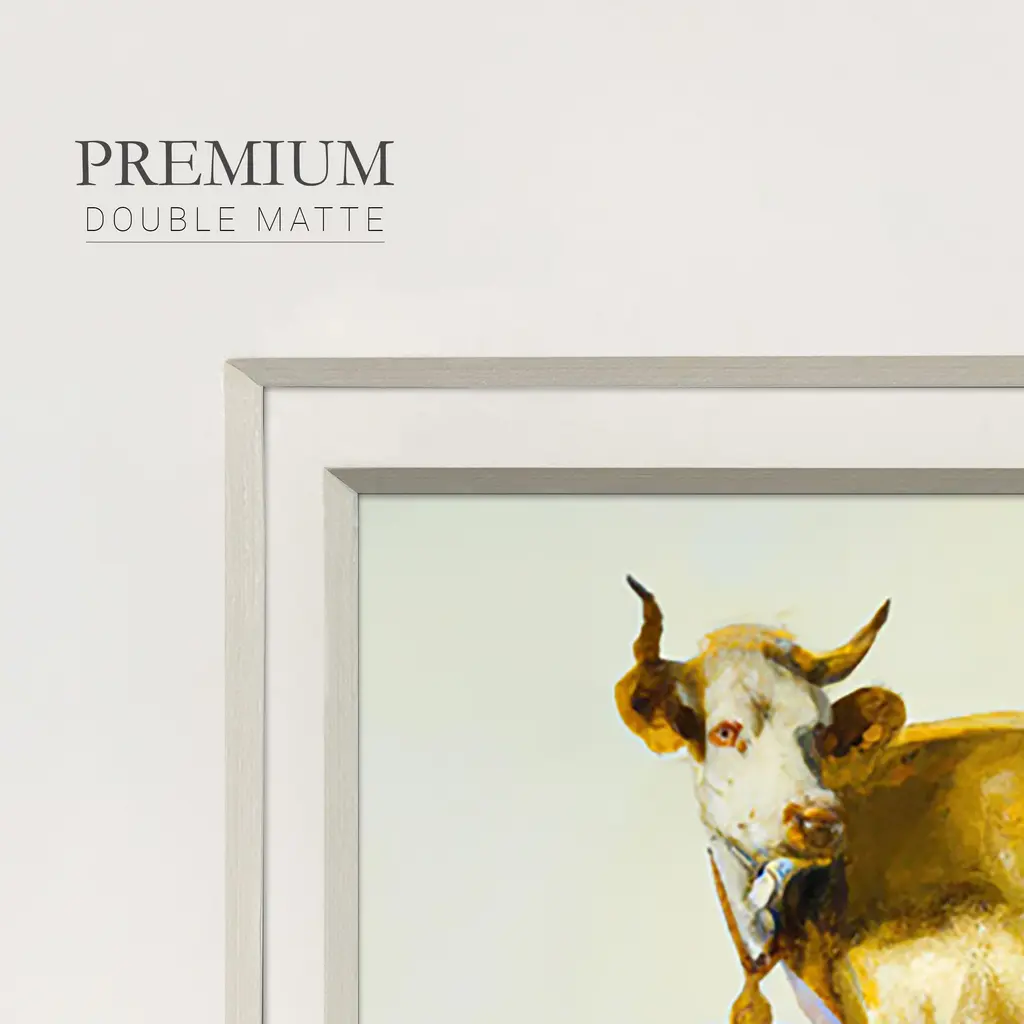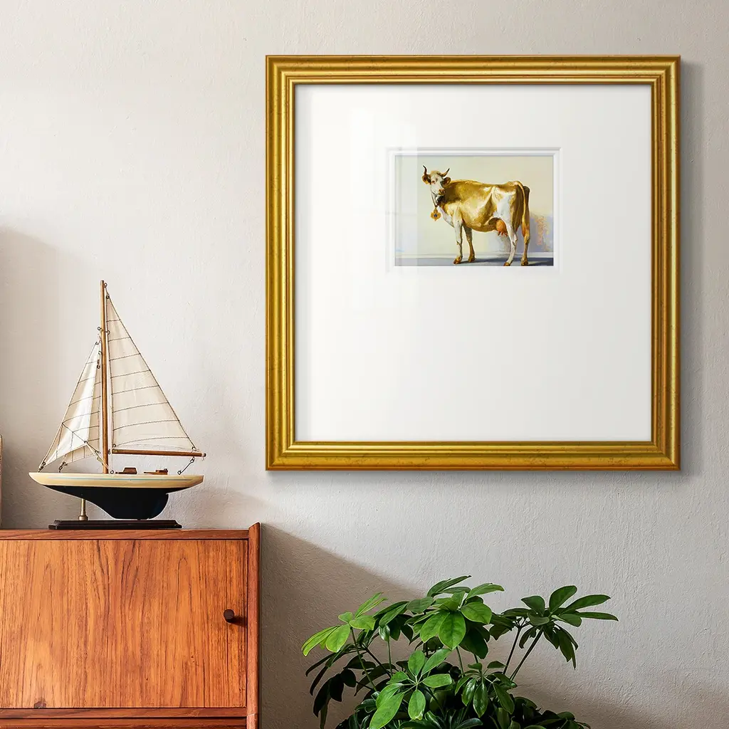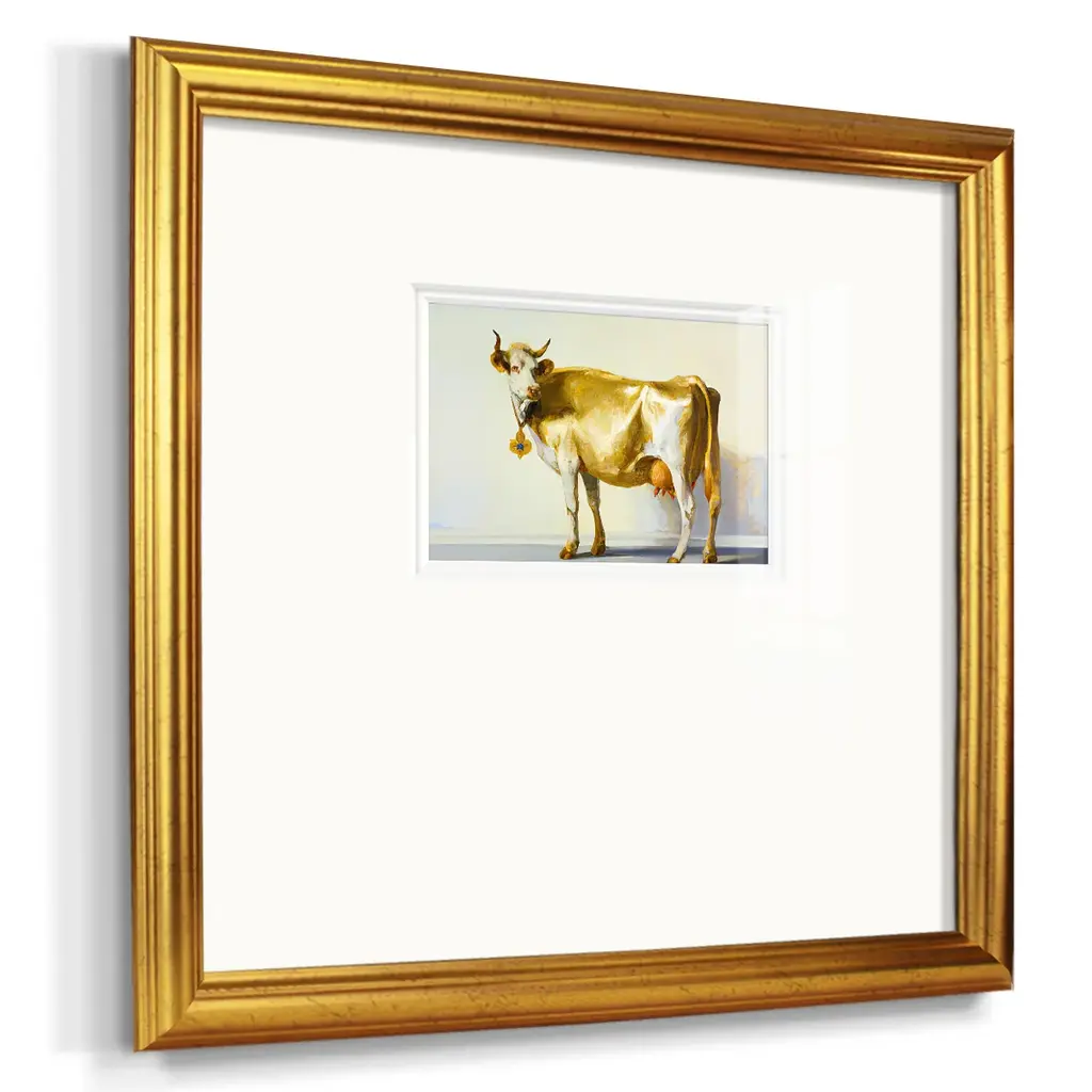 Gold CowPremium Framed Print A framed cold pressed paper print featuring superior double matting and quality frame. 2 SIZES AVAILABLE 16''X16''' - Overall Size 20''X20''' - Overall Size Each piece is made to order. Each piece comes with hanging hardware. Made in the USA Ready to Hang Giclee Paper Print Plexiglass Beveled Matt Board Double Matte Board