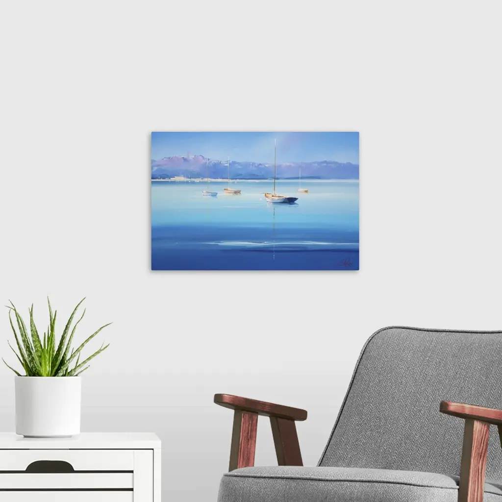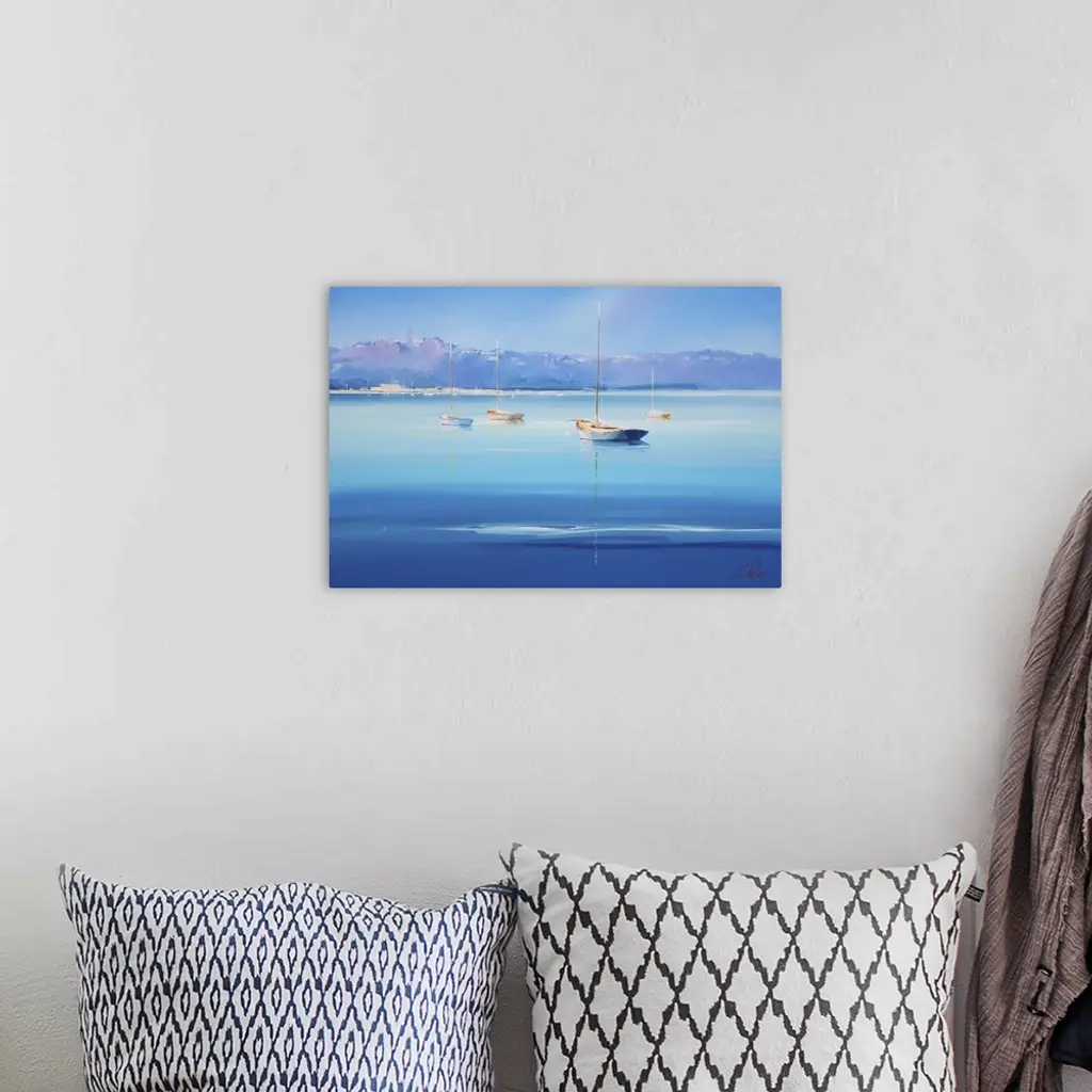 Contemporary artwork of sailboats on deep blue water off the Italian coast.