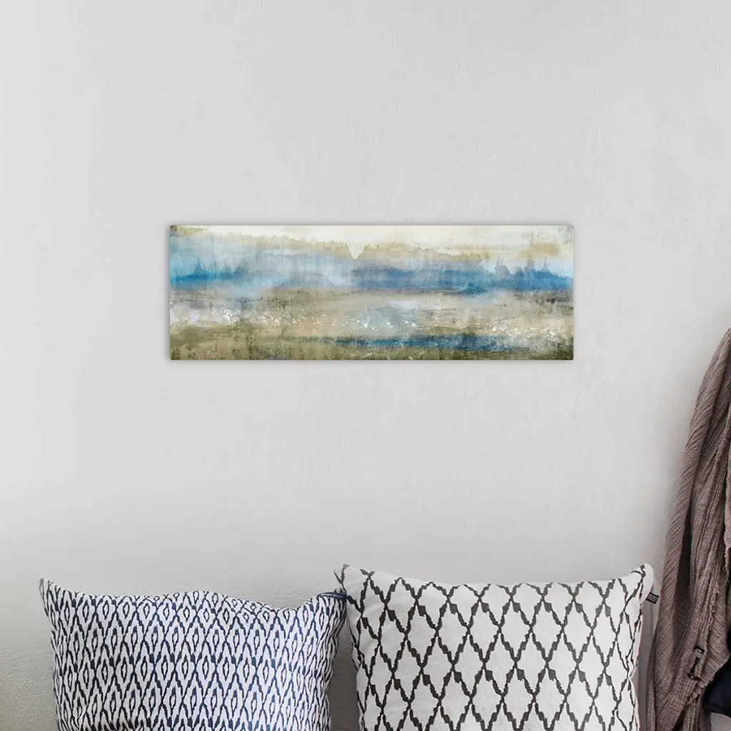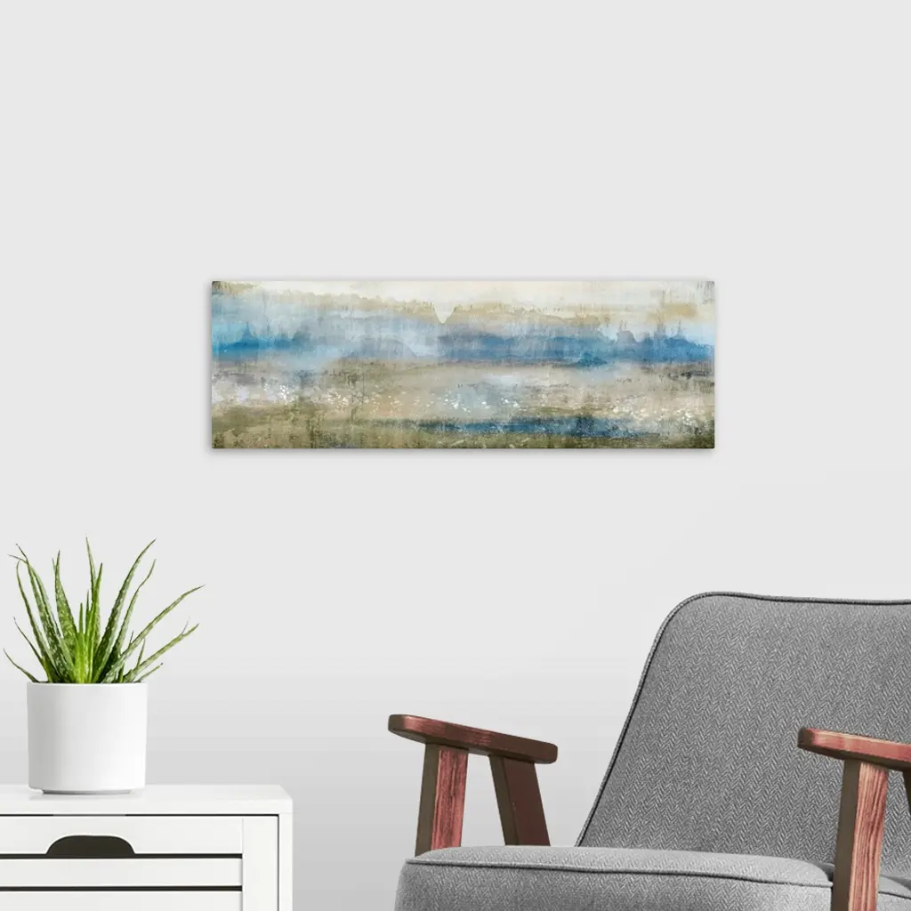 Abstract contemporary painting in muted blue shades and earth tones.