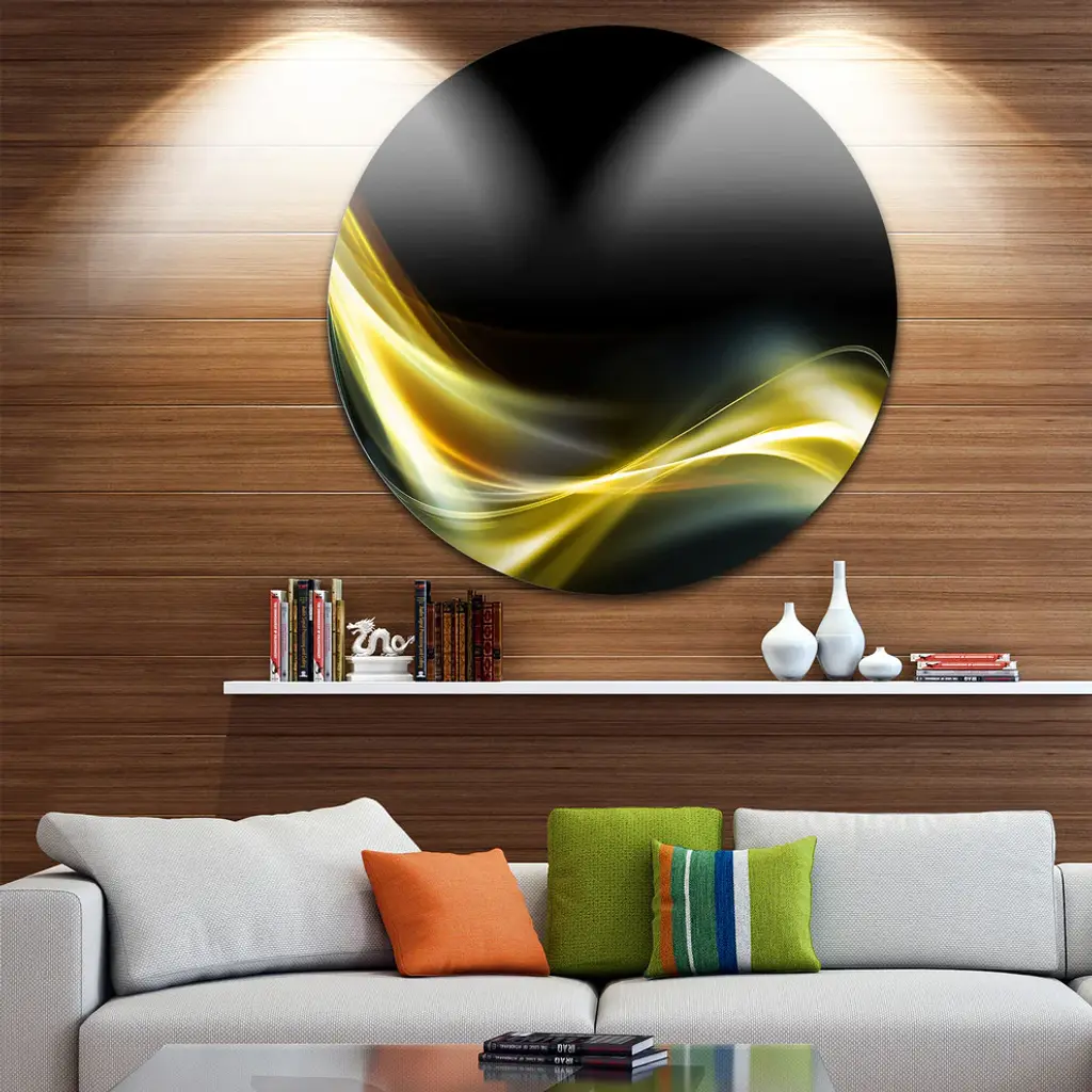 Bring Contemporary Abstraction to your home with this large Circle Metal wall art. This Gold in Black Upward Lines Metal Artwork makes it the focal point of any room or office. - White Gloss Coating ensures colors are extra vibrant with light reflection.- Aluminum grade Sheet Metal with 1 inch mounting frame on the back giving the illusion that the artwork is floating on the wall..- Mounting Brackets are included along with instructions.- High Quality Digital images are created directly into a glossy aluminum panel producing a stunning and captivating print into the glossy finish of the metal.- Water, Fire and Scratch resistant HD Aluminum panels.- Looks better than any photo paper and guaranteed to last at least 20 years- Easy to clean with a microfiber cloth. Colors are far superior to regular Canvas Art. - Easy to Hang