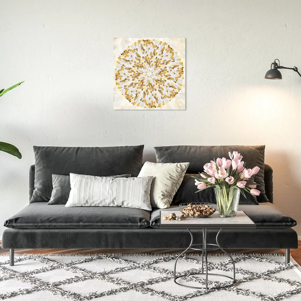 This mesmerizing image depicts a spiraling mosaic of golden flakes upon a textured purple background. Ideal for adding a pop of color to your scheme, both on its own or tiled in a line of three. Printed onto smooth plexiglass this artwork has a sleek, glossy finish and is part of our curated collaboration with Cobra Art.Download Specification Sheet
