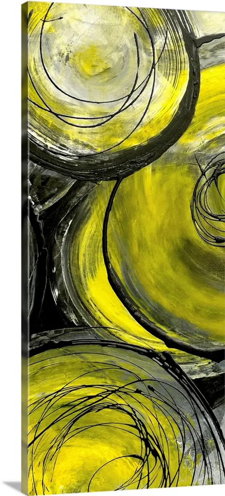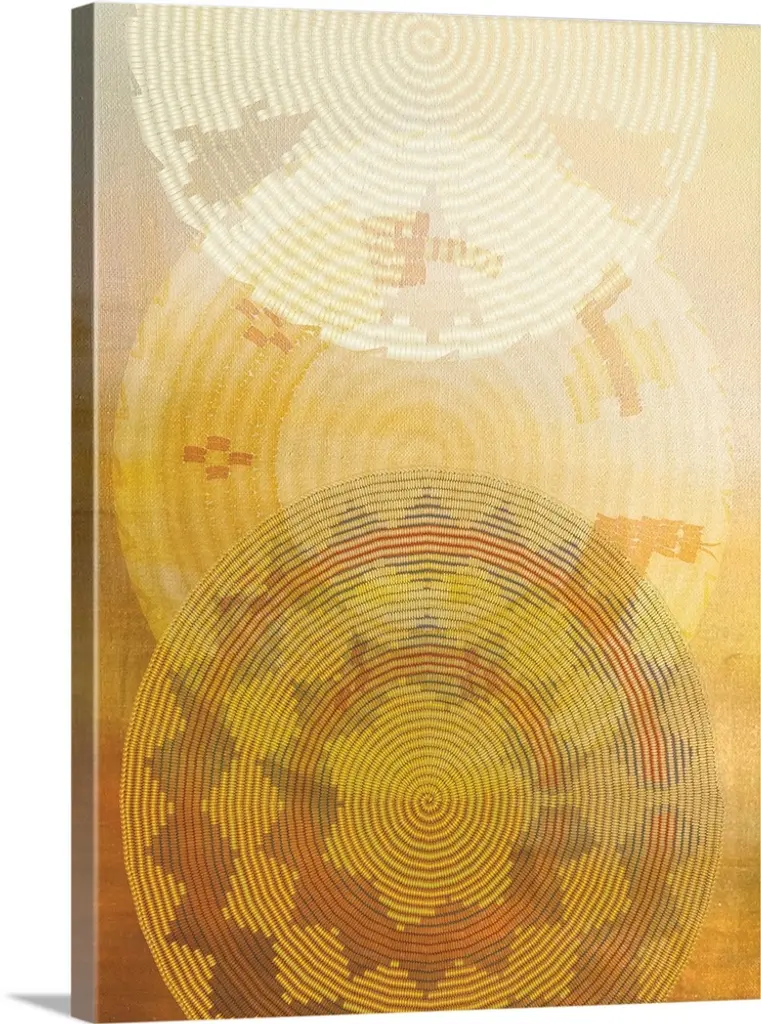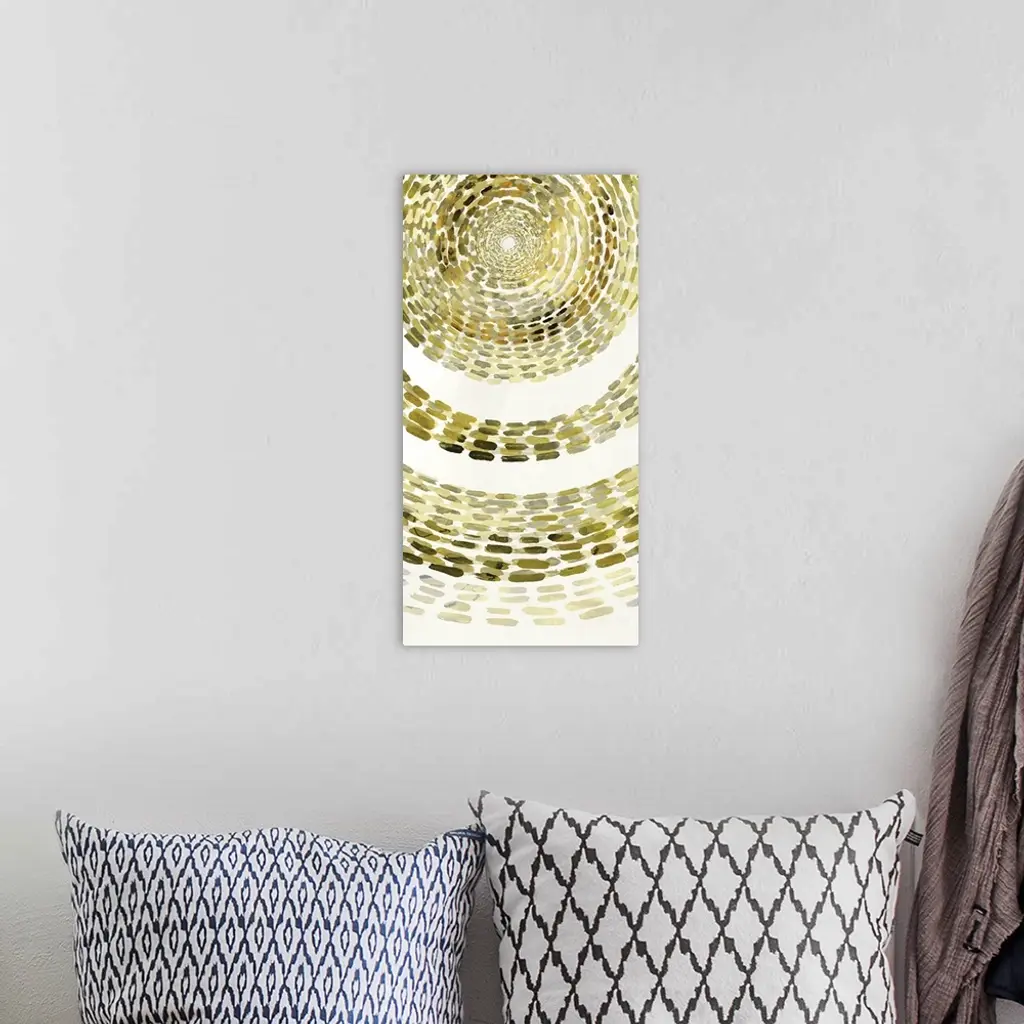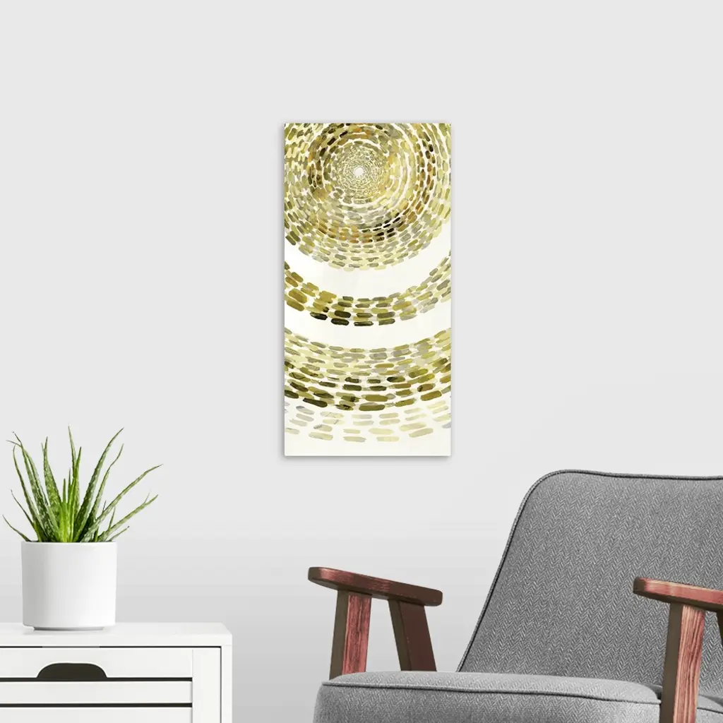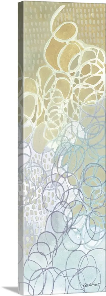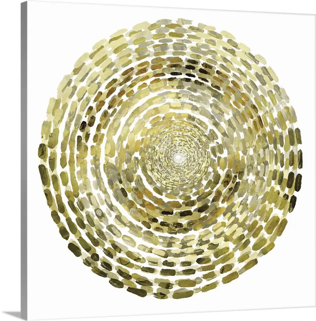 Abstract painting of golden dashes in curved and circular patterns on cream.