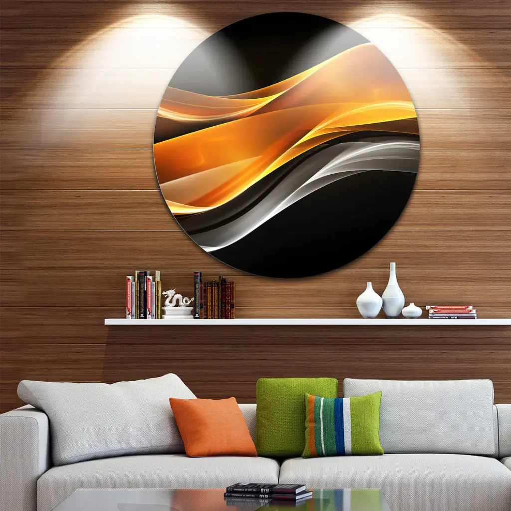 Bring Contemporary Abstraction to your home with this large Circle Metal wall art. This Gold Pink Inward Waves Metal Artwork makes it the focal point of any room or office. - White Gloss Coating ensures colors are extra vibrant with light reflection.- Aluminum grade Sheet Metal with 1 inch mounting frame on the back giving the illusion that the artwork is floating on the wall..- Mounting Brackets are included along with instructions.- High Quality Digital images are created directly into a glossy aluminum panel producing a stunning and captivating print into the glossy finish of the metal.- Water, Fire and Scratch resistant HD Aluminum panels.- Looks better than any photo paper and guaranteed to last at least 20 years- Easy to clean with a microfiber cloth. Colors are far superior to regular Canvas Art. - Easy to Hang
