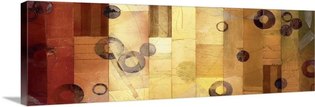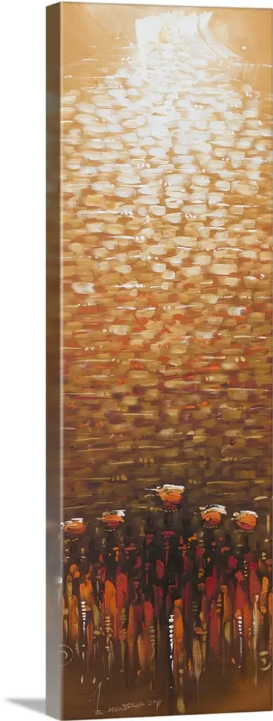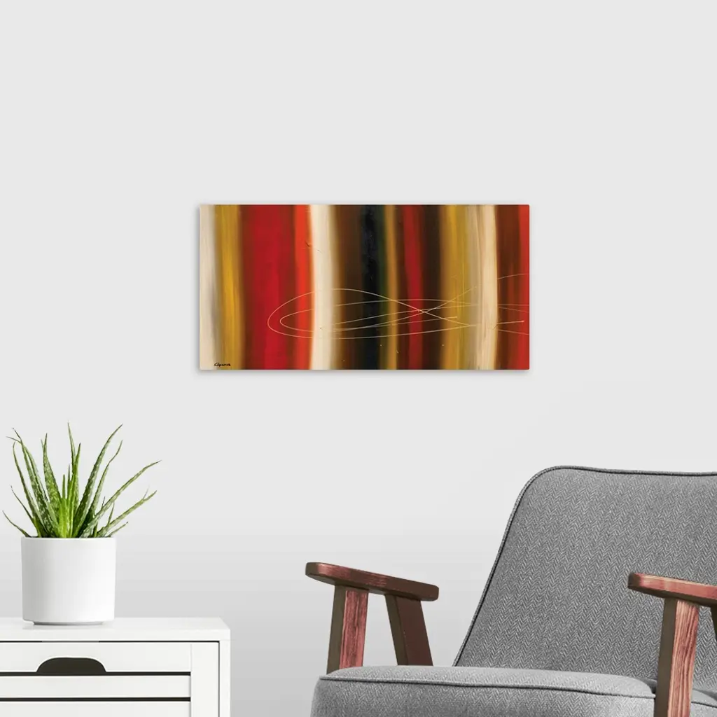 Large abstract painting with vertical brushstroke lines in shades of red, white, brown, gold, yellow, and green with a thin gold lined design on the right side.