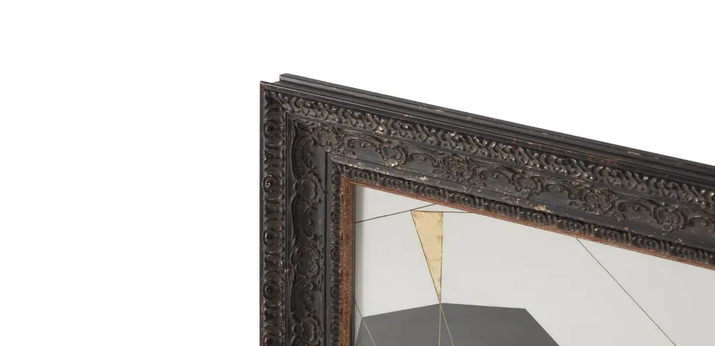 In this unique modern artwork series, the artist explores the contrast between rich black shapes, a soft ivory background, and hand-applied gold leaf accents. The artist juxtaposed each expressionist piece with an elaborately carved, antique-style frame in a distressed slate hue. Hung in a set of three, the complete set creates a sense of balance.