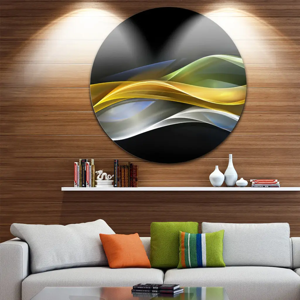 Bring Contemporary Abstraction to your home with this large Circle Metal wall art. This Gold Silver Straight Yellow Lines Metal Artwork makes it the focal point of any room or office. - White Gloss Coating ensures colors are extra vibrant with light reflection.- Aluminum grade Sheet Metal with 1 inch mounting frame on the back giving the illusion that the artwork is floating on the wall..- Mounting Brackets are included along with instructions.- High Quality Digital images are created directly into a glossy aluminum panel producing a stunning and captivating print into the glossy finish of the metal.- Water, Fire and Scratch resistant HD Aluminum panels.- Looks better than any photo paper and guaranteed to last at least 20 years- Easy to clean with a microfiber cloth. Colors are far superior to regular Canvas Art. - Easy to Hang
