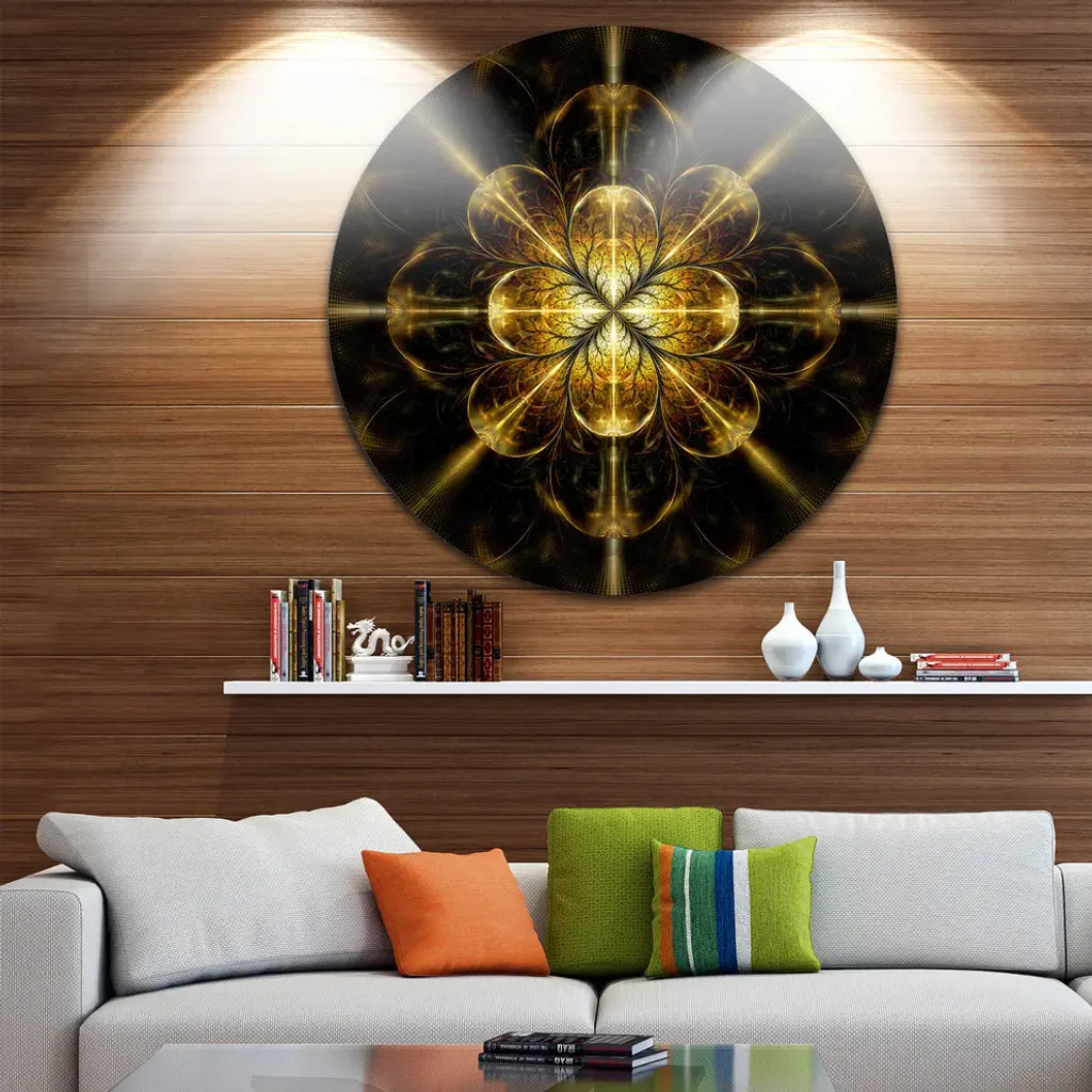 Bring Contemporary Abstraction to your home with this large Circle Metal wall art. This Gold Symmetrical Large Fractal Flower Metal Artwork makes it the focal point of any room or office. - White Gloss Coating ensures colors are extra vibrant with light reflection.- Aluminum grade Sheet Metal with 1 inch mounting frame on the back giving the illusion that the artwork is floating on the wall..- Mounting Brackets are included along with instructions.- High Quality Digital images are created directly into a glossy aluminum panel producing a stunning and captivating print into the glossy finish of the metal.- Water, Fire and Scratch resistant HD Aluminum panels.- Looks better than any photo paper and guaranteed to last at least 20 years- Easy to clean with a microfiber cloth. Colors are far superior to regular Canvas Art. - Easy to Hang