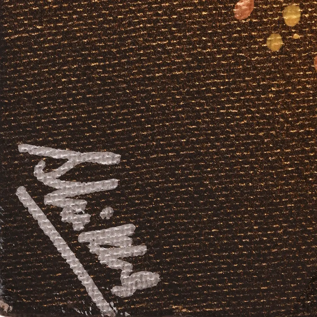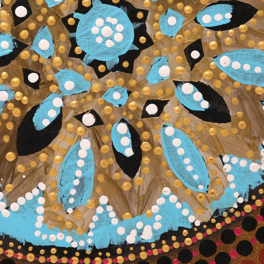 By Indian artist Shikha Kaistha, this abstract painting depicts a golden chrysanthemum flower design that centers a circle of sky blue. The artist works with mixed media, painting acrylics over paper and glue that create a relief texture. Intricate dot patterns surround the lovely design.