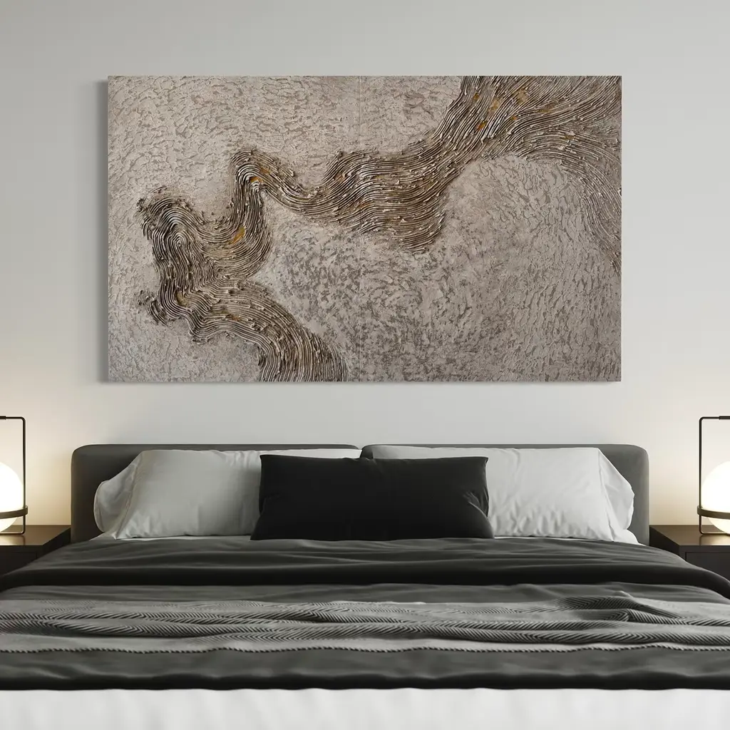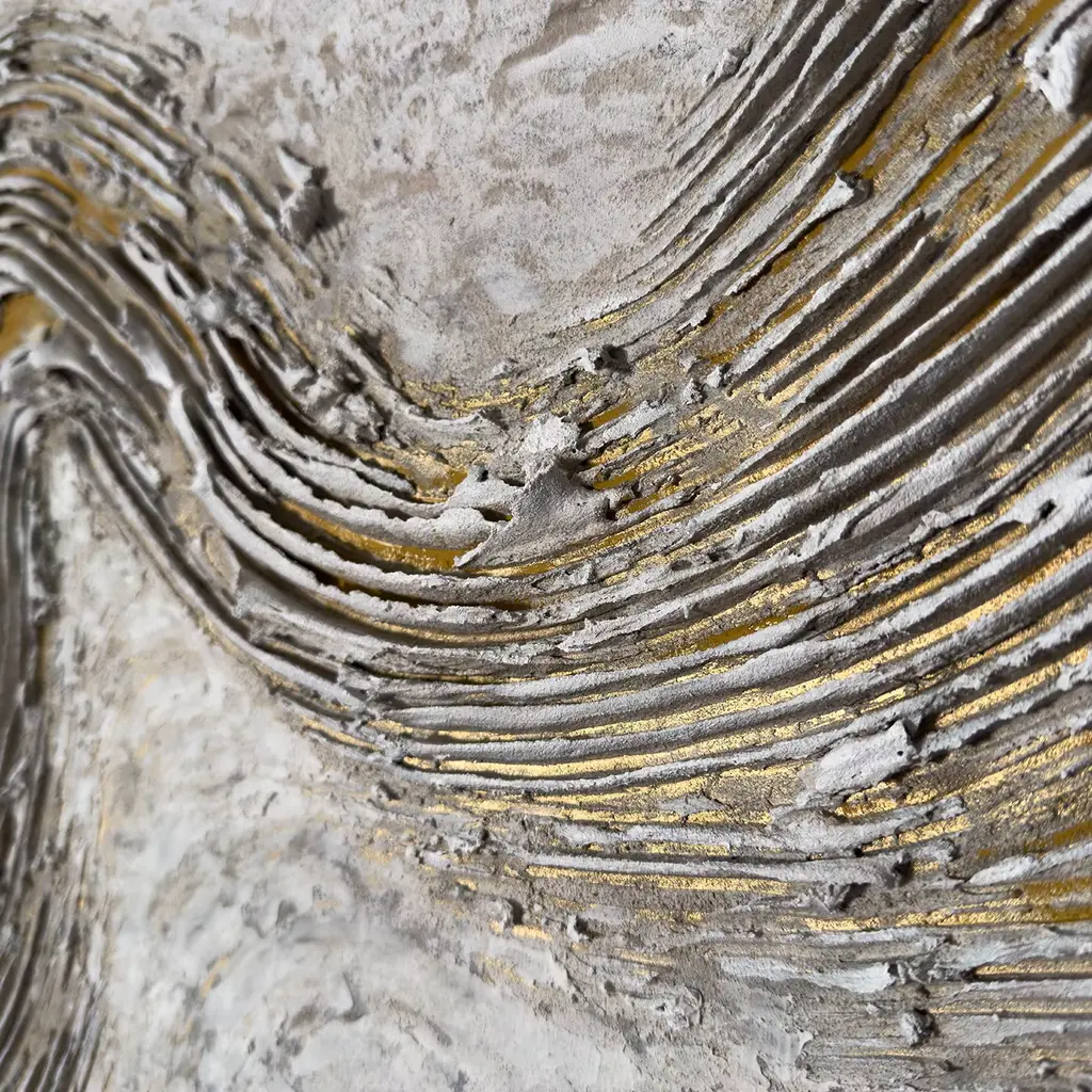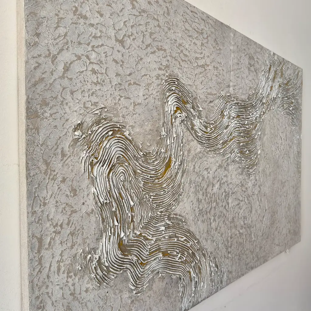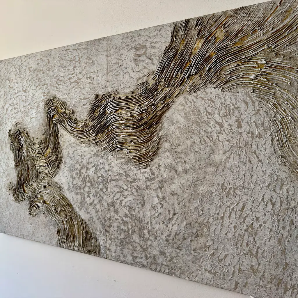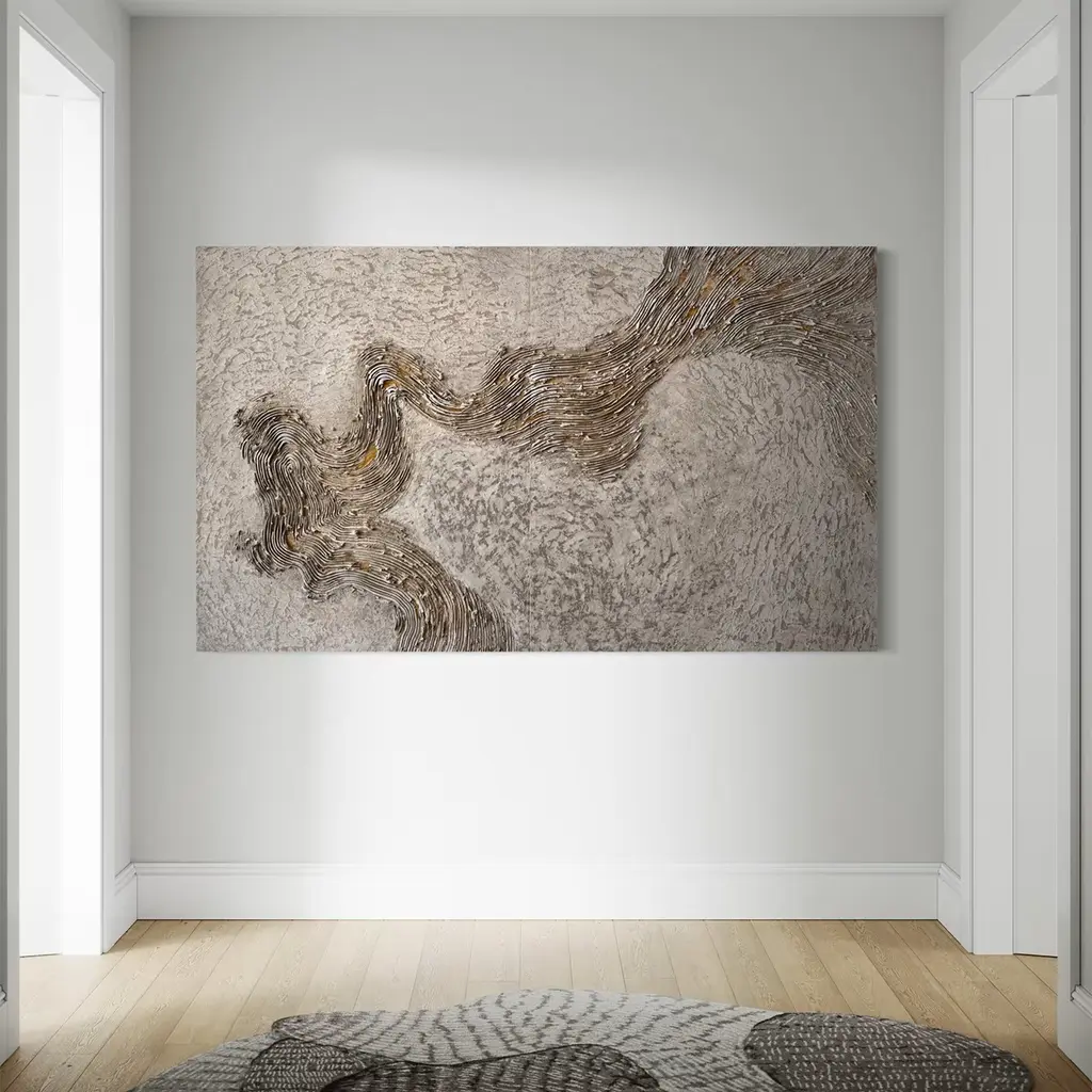 Experience the captivating allure of the Gold Vein diptych. This exquisite piece invites viewers into a realm where the raw power of nature intertwines with artistic creativity. Crafted to evoke the depths of the Earth, it showcases a rich texture and dynamic movement that draws the eye across its surface. With a masterful application of mixed materials, including white, ivory, beige, gold, and yellow ochre pigments, light dances upon the artwork, revealing subtle variations and depth. The flowing lines and intricate detailing create a mesmerizing visual that transforms any space into a reflection of nature's treasures. Ideal for those seeking to enhance their environment with a statement piece, this diptych artwork serves as a unique addition to contemporary decor. One-of-a-kind piece.