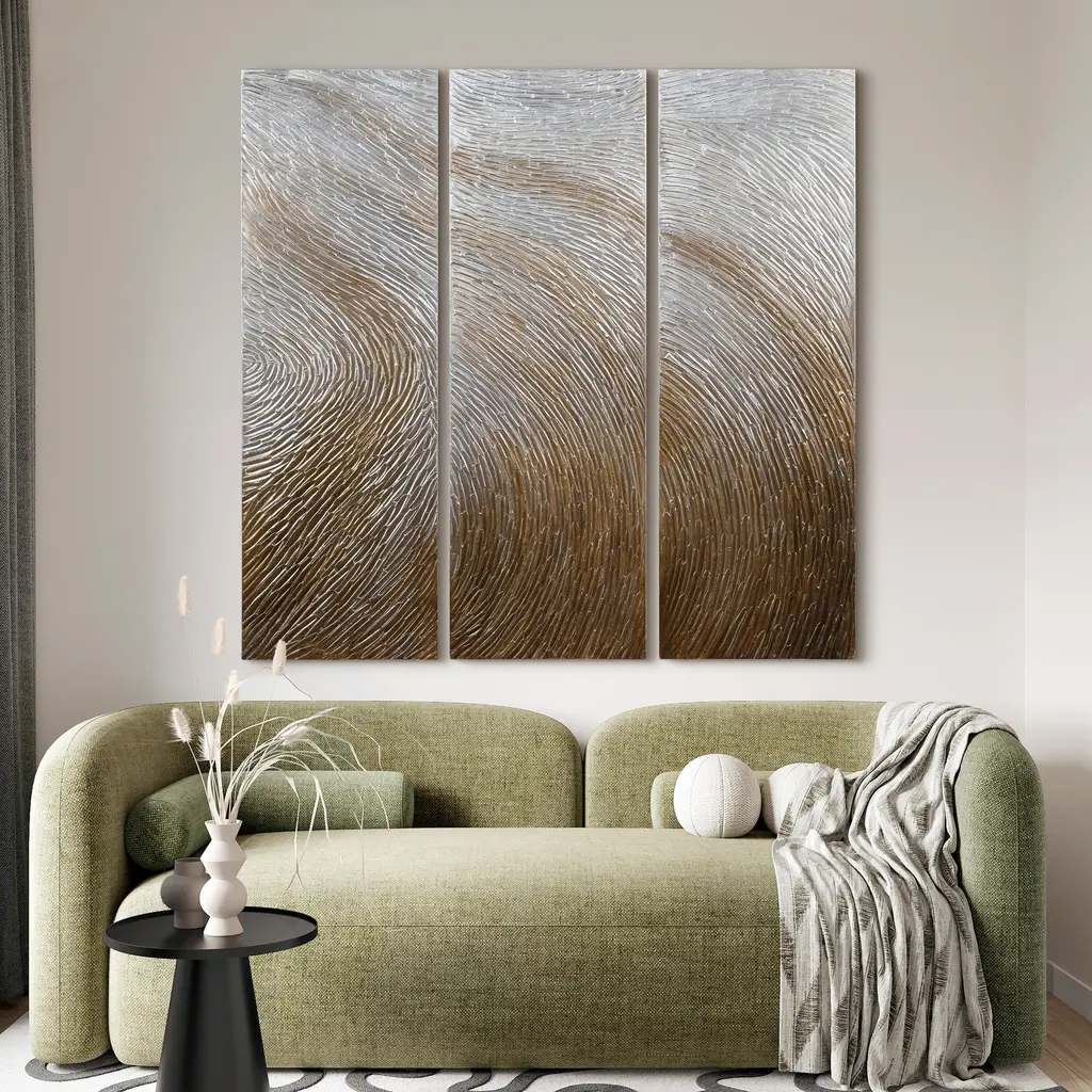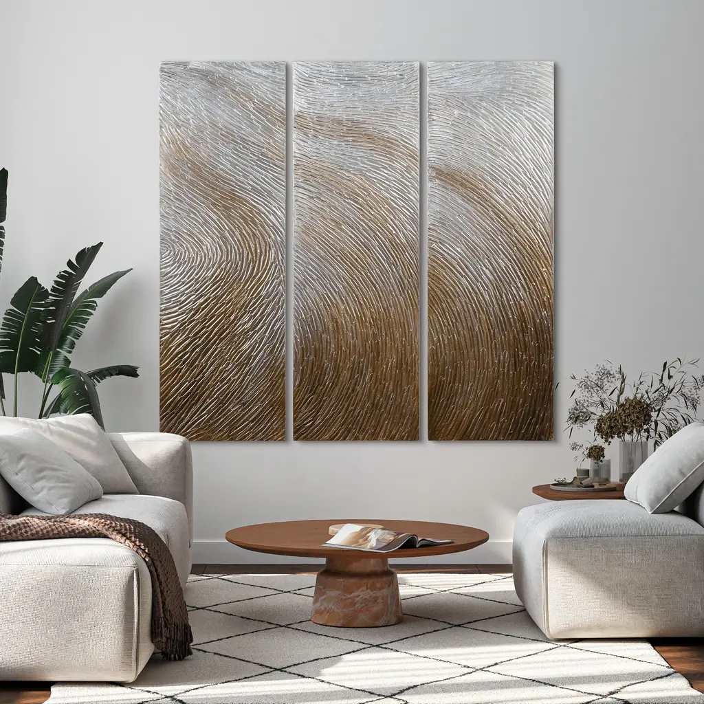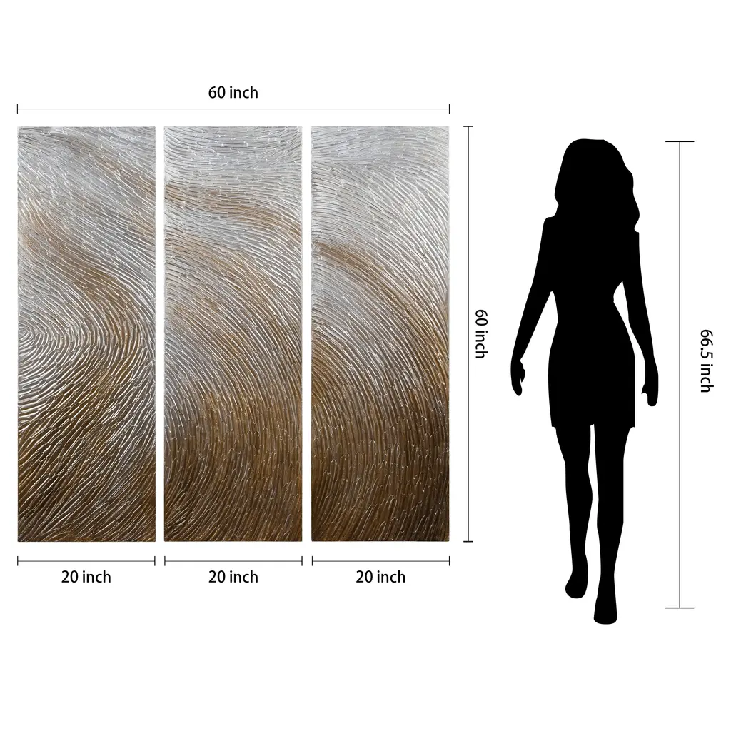 Are bare walls getting the better of you? Brighten up that stuffy study or lifeless living room with a piece of wall art that contributes to your home's decor and shows off your personal style, like this piece! A bold accent on any wall, this hand-painted, three-panel piece showcases an undulating wave pattern with a deep gold and silver color pattern, as well as lines that add a gleaming touch of texture to your home. Each panel of this triptych measures 60'' H x 20'' W x 2'' D and is crafted from canvas wrapped around a wood frame. 2 D-rings are affixed to the back of each piece so it is ready to hang in a vertical orientation!