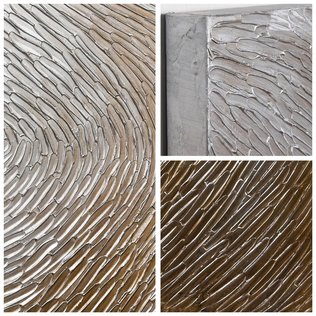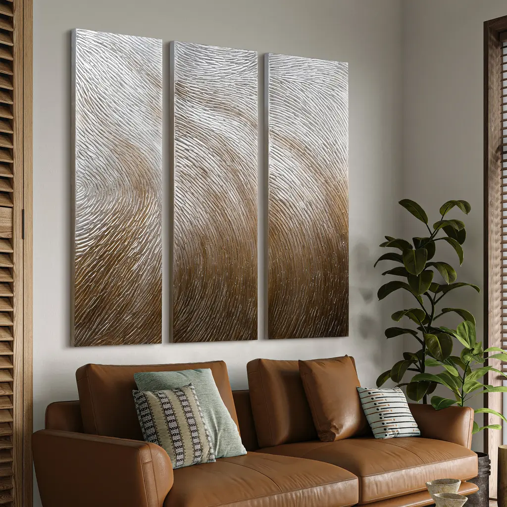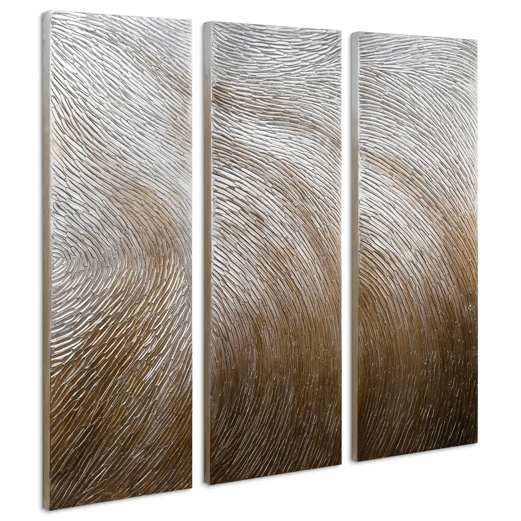 Are bare walls getting the better of you? Brighten up that stuffy study or lifeless living room with a piece of wall art that contributes to your home's decor and shows off your personal style, like this piece! A bold accent on any wall, this hand-painted, three-panel piece showcases an undulating wave pattern with a deep gold and silver color pattern, as well as lines that add a gleaming touch of texture to your home. Each panel of this triptych measures 60'' H x 20'' W x 2'' D and is crafted from canvas wrapped around a wood frame. 2 D-rings are affixed to the back of each piece so it is ready to hang in a vertical orientation!