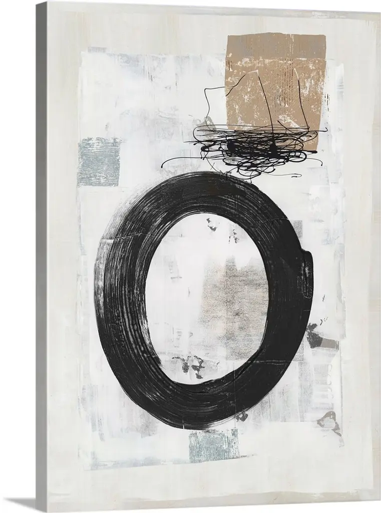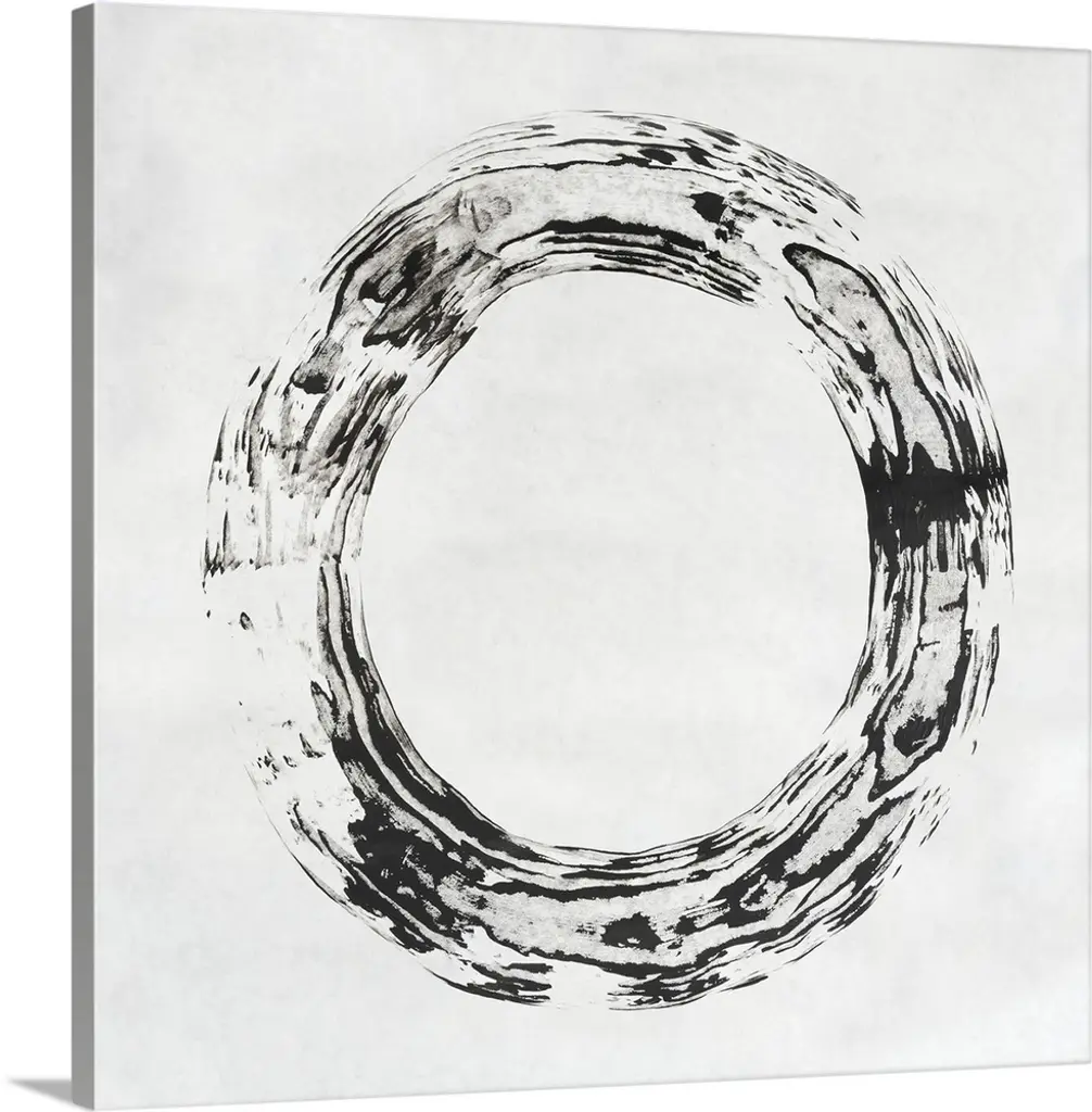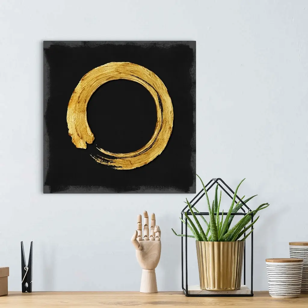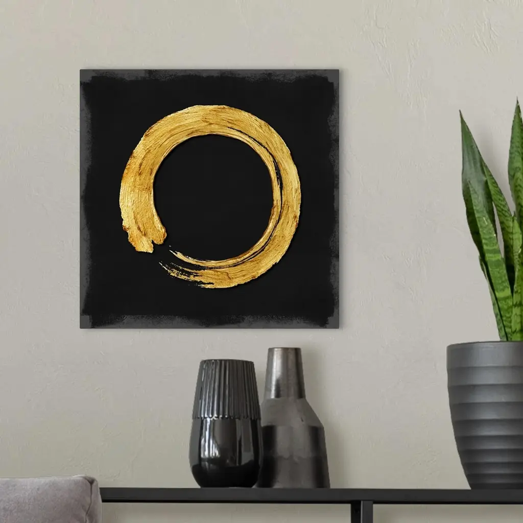 This Zen artwork features a sweeping circular brush stroke in gold over a black background with mottled gray edging.