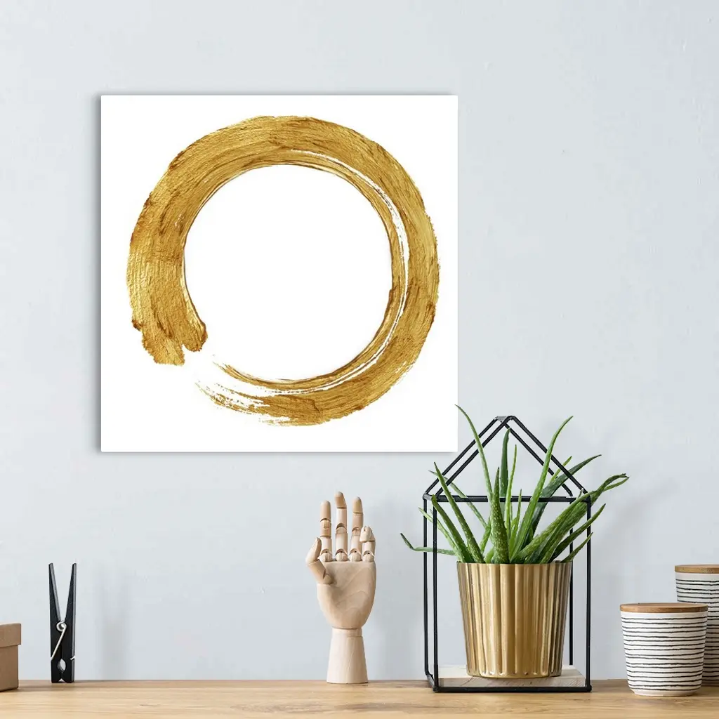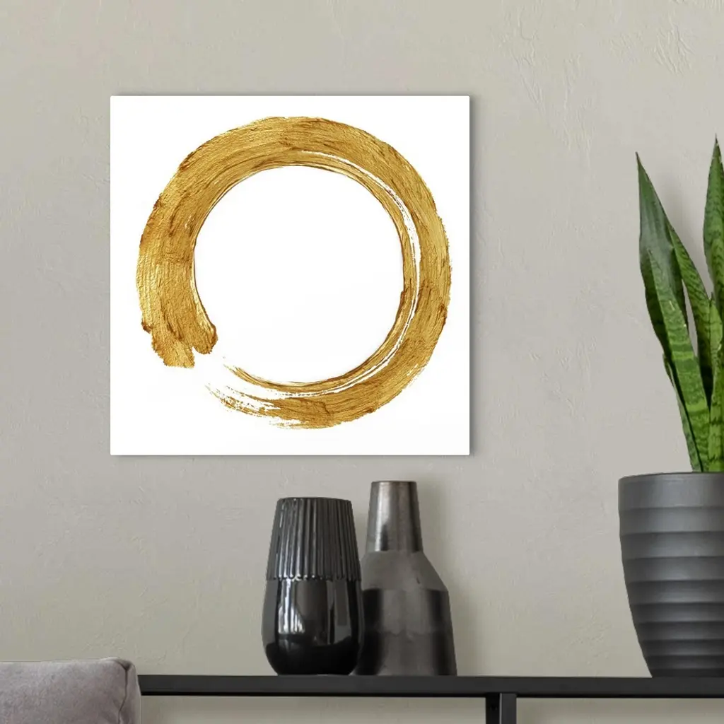This Zen artwork features a sweeping circular brush stroke in gold over a white background.