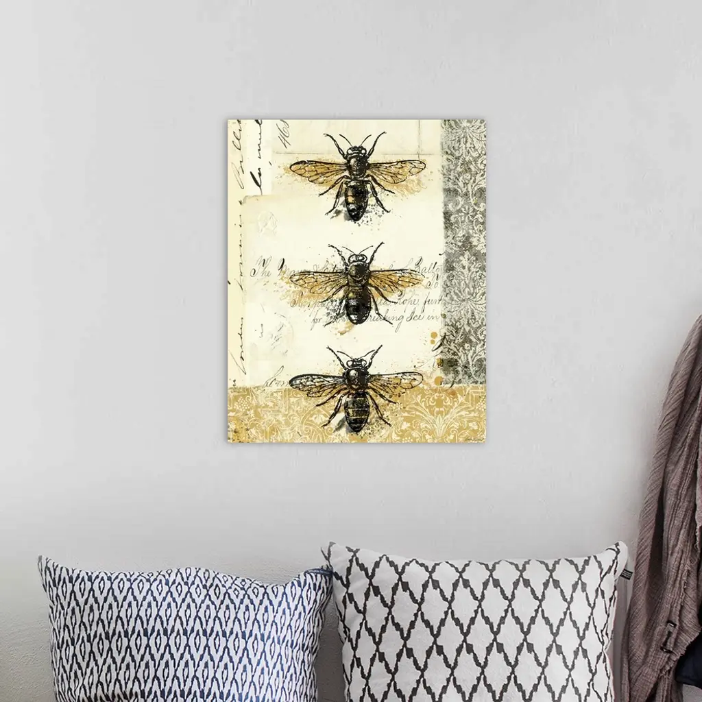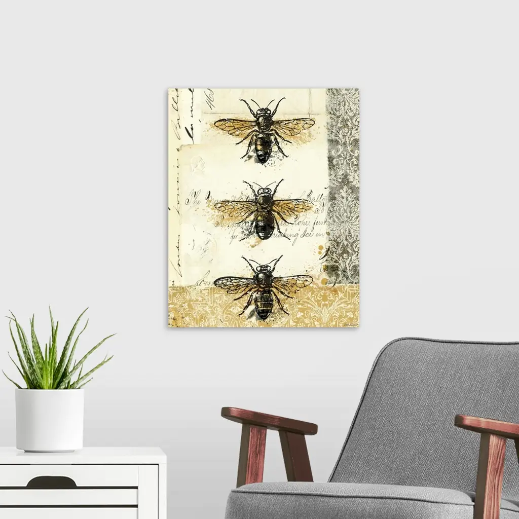 Contemporary artwork of three insects lined from top to bottom, on golden and weathered looking background.