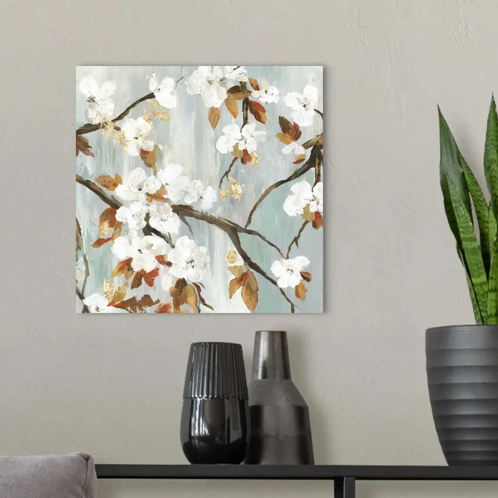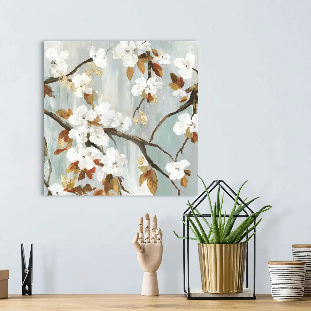 A contemporary painting of white flower blooms on leaf covered branches against a neutral textured backdrop.