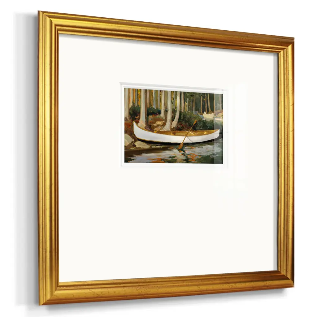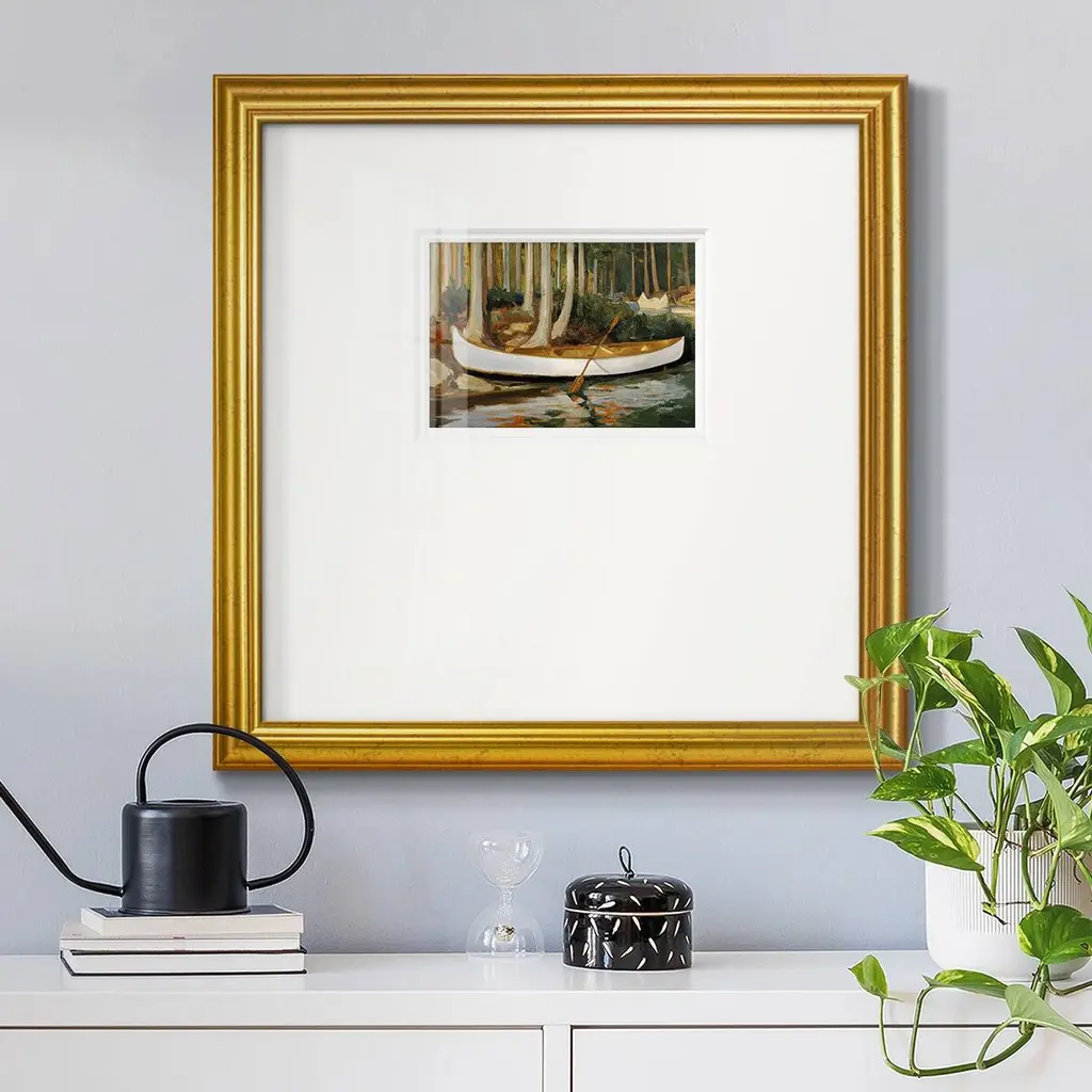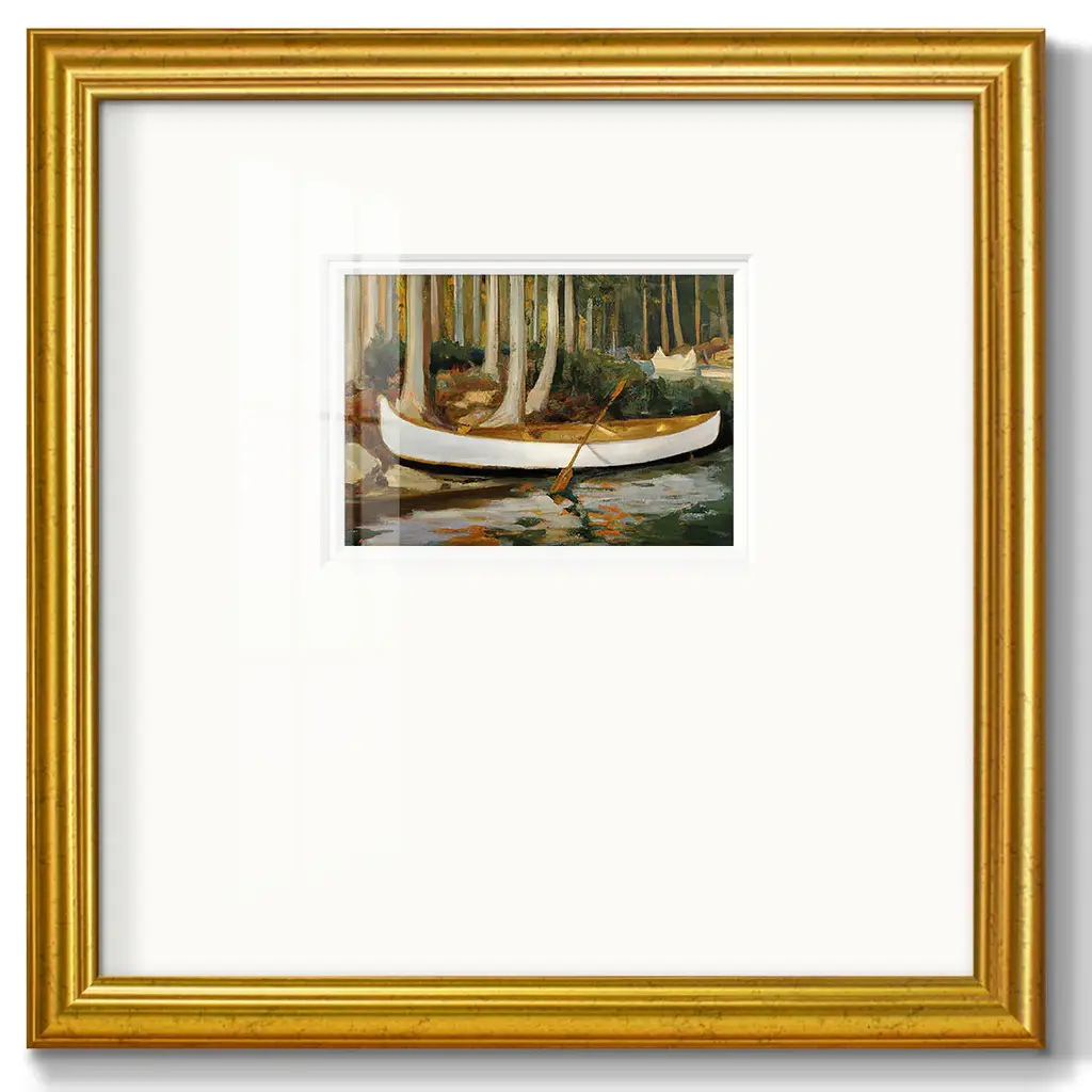 Golden CanoePremium Framed Print A framed cold pressed paper print featuring superior double matting and quality frame. 2 SIZES AVAILABLE 16''X16''' - Overall Size 20''X20''' - Overall Size Each piece is made to order. Each piece comes with hanging hardware. Made in the USA Ready to Hang Giclee Paper Print Plexiglass Beveled Matt Board Double Matte Board