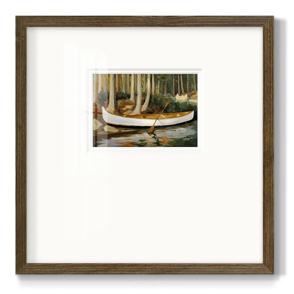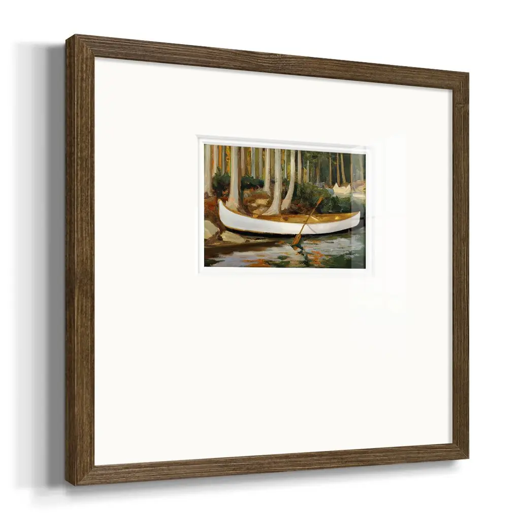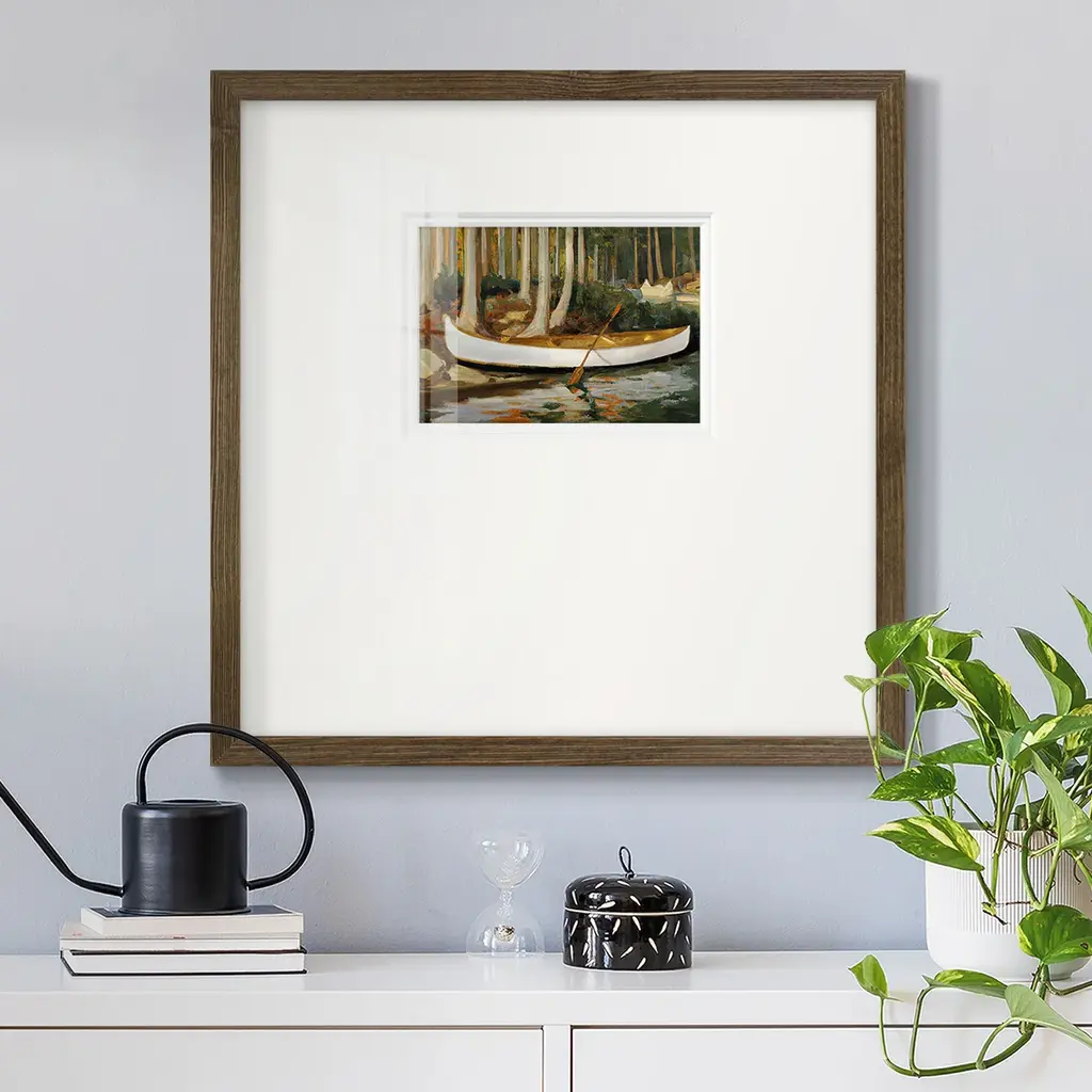 Golden CanoePremium Framed Print A framed cold pressed paper print featuring superior double matting and quality frame. 2 SIZES AVAILABLE 16''X16''' - Overall Size 20''X20''' - Overall Size Each piece is made to order. Each piece comes with hanging hardware. Made in the USA Ready to Hang Giclee Paper Print Plexiglass Beveled Matt Board Double Matte Board