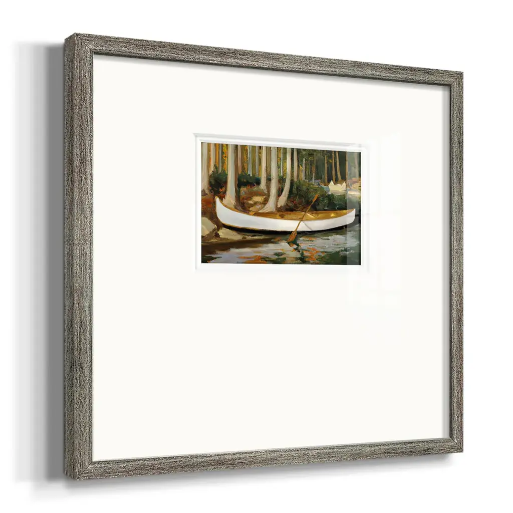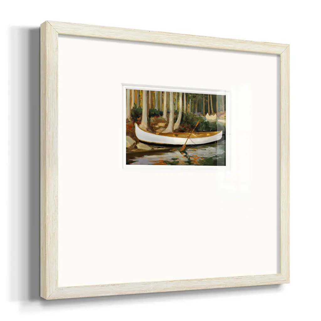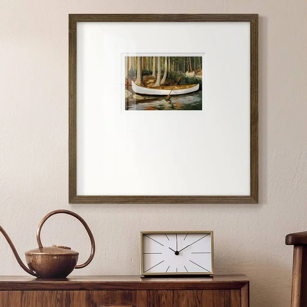 Golden CanoePremium Framed Print A framed cold pressed paper print featuring superior double matting and quality frame. 2 SIZES AVAILABLE 16''X16''' - Overall Size 20''X20''' - Overall Size Each piece is made to order. Each piece comes with hanging hardware. Made in the USA Ready to Hang Giclee Paper Print Plexiglass Beveled Matt Board Double Matte Board
