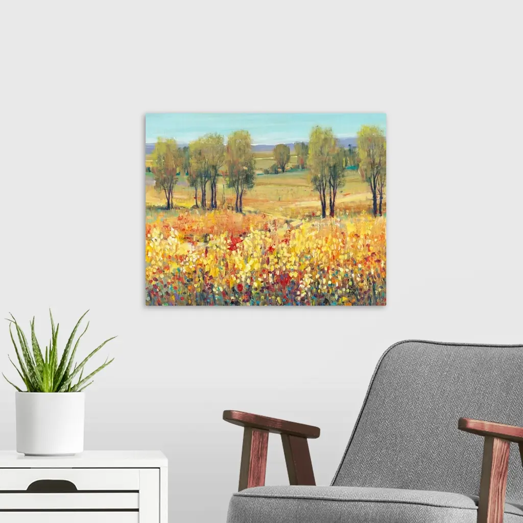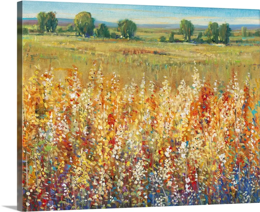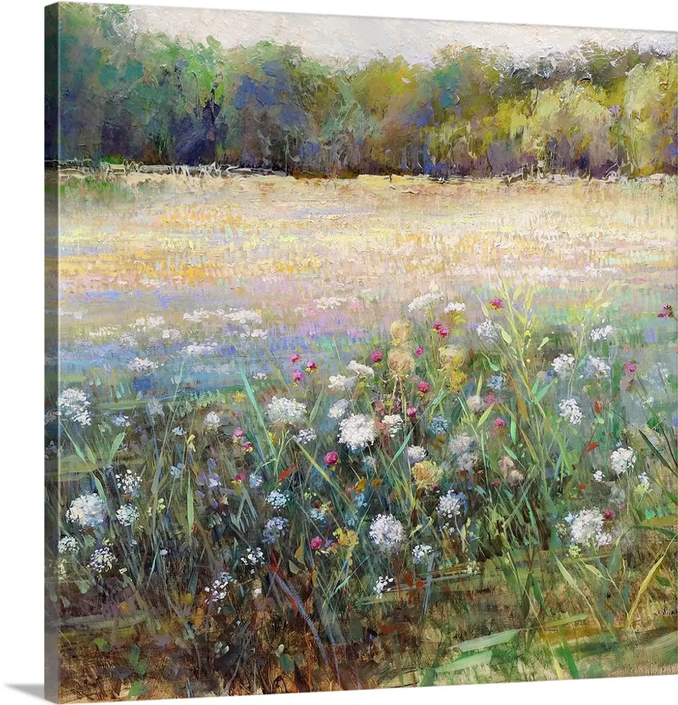 Contemporary landscape painting containing bright colors in crosshatched brush strokes with dots of color to illustrate flowers.