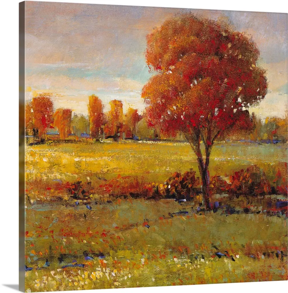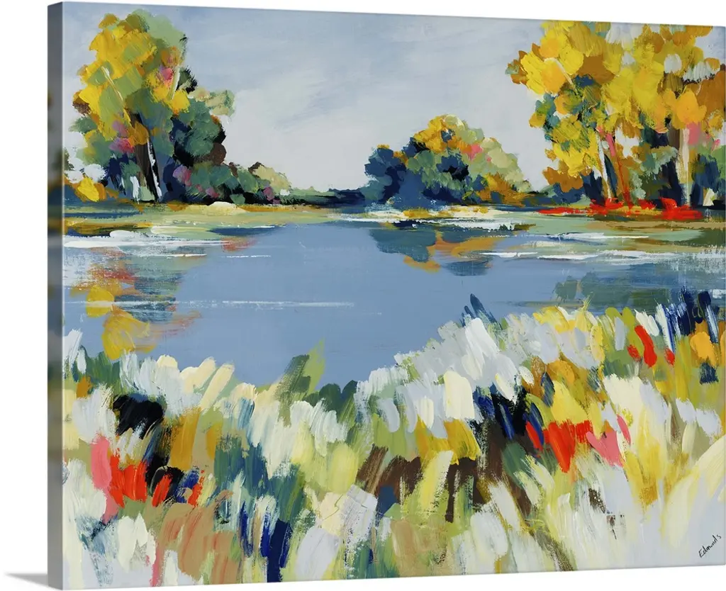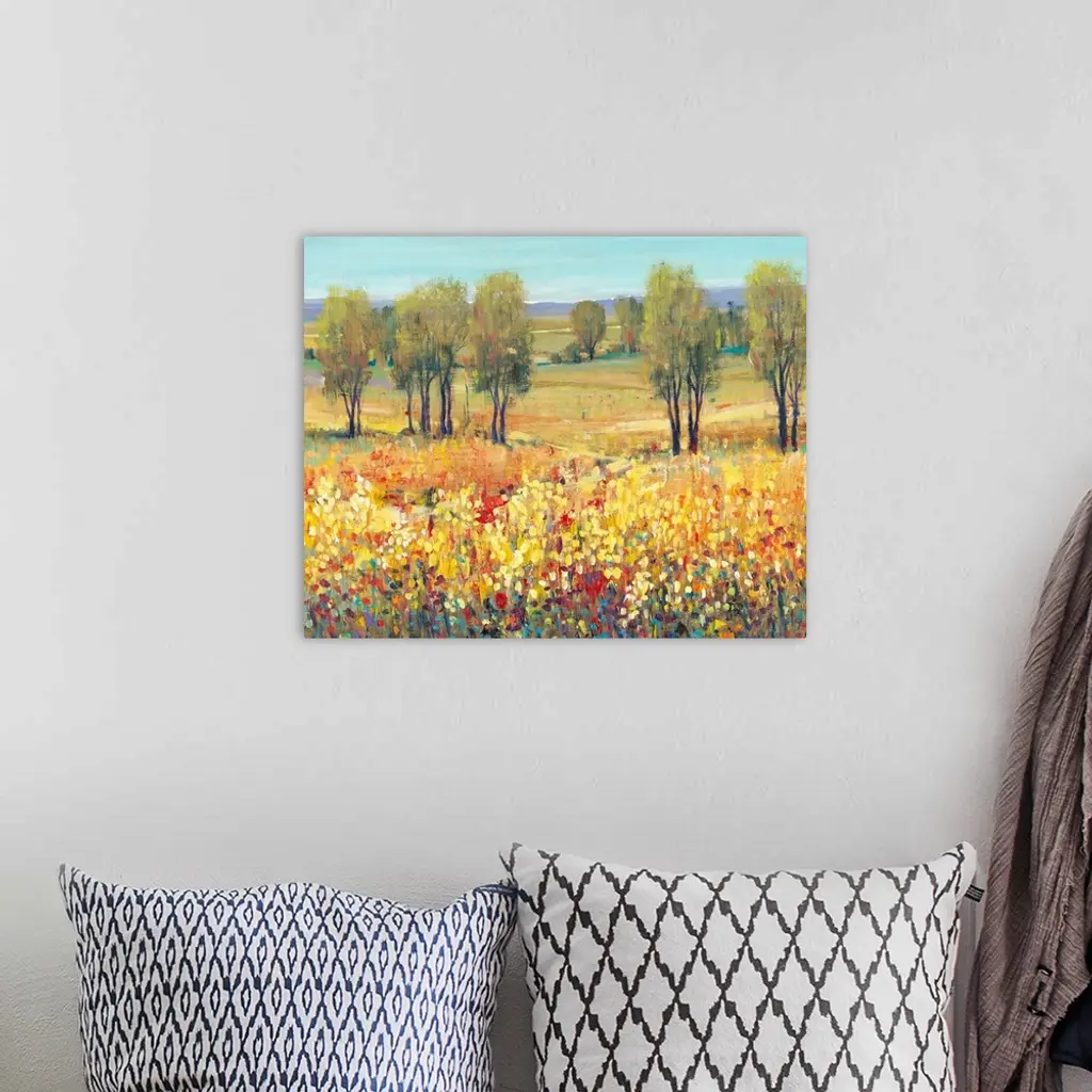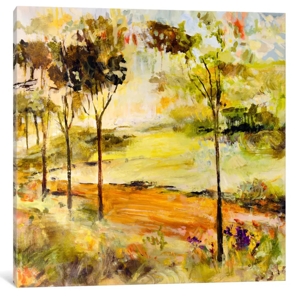 Contemporary landscape painting containing bright colors in crosshatched brush strokes with dots of color to illustrate flowers.