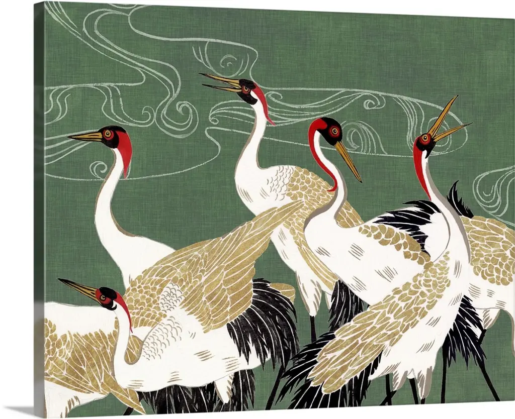 A striking artwork, this hand-applied piece features tall, eye-catching birds on a gold leaf background. Its distressed black and gold frame further elevates its tasteful design. Style in a bedroom, above a sofa, or in a hallway for a captivating addition.