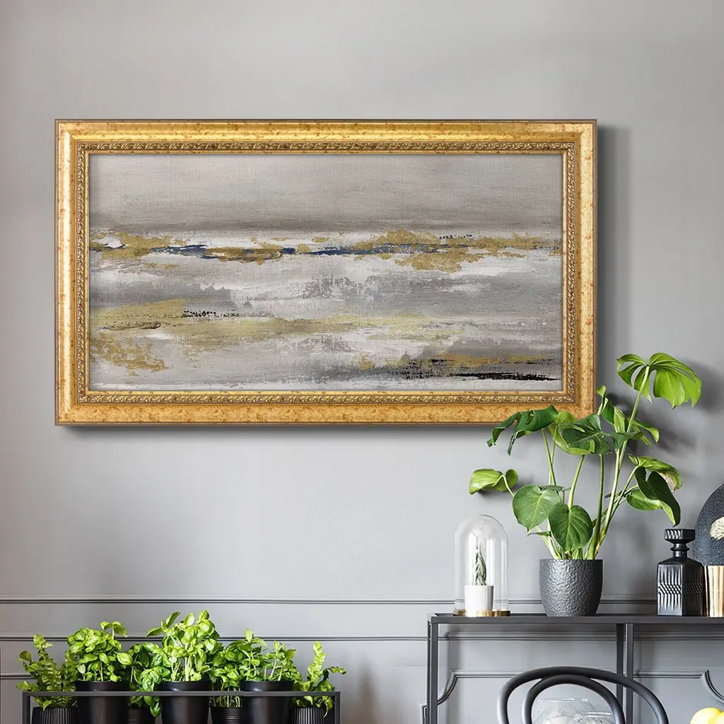 Golden Fog Premium Framed Canvas- Ready to Hang A Premium Framed Canvas created to last. Framed in distressed wood and available in an array of sizes and colors Featuring a beveled a solid wood stretcher bar, each piece comes ready to hand 3 SIZES AVAILABLE 21''X37'' - Overall Size 25''X45'' - Overall Size 29''x53'' - Overall Size Each piece is made to order. Each piece comes with hanging hardware. Made in the USA Ready to Hang Giclee Paper Print Acrylic Glass Beveled Matt Board