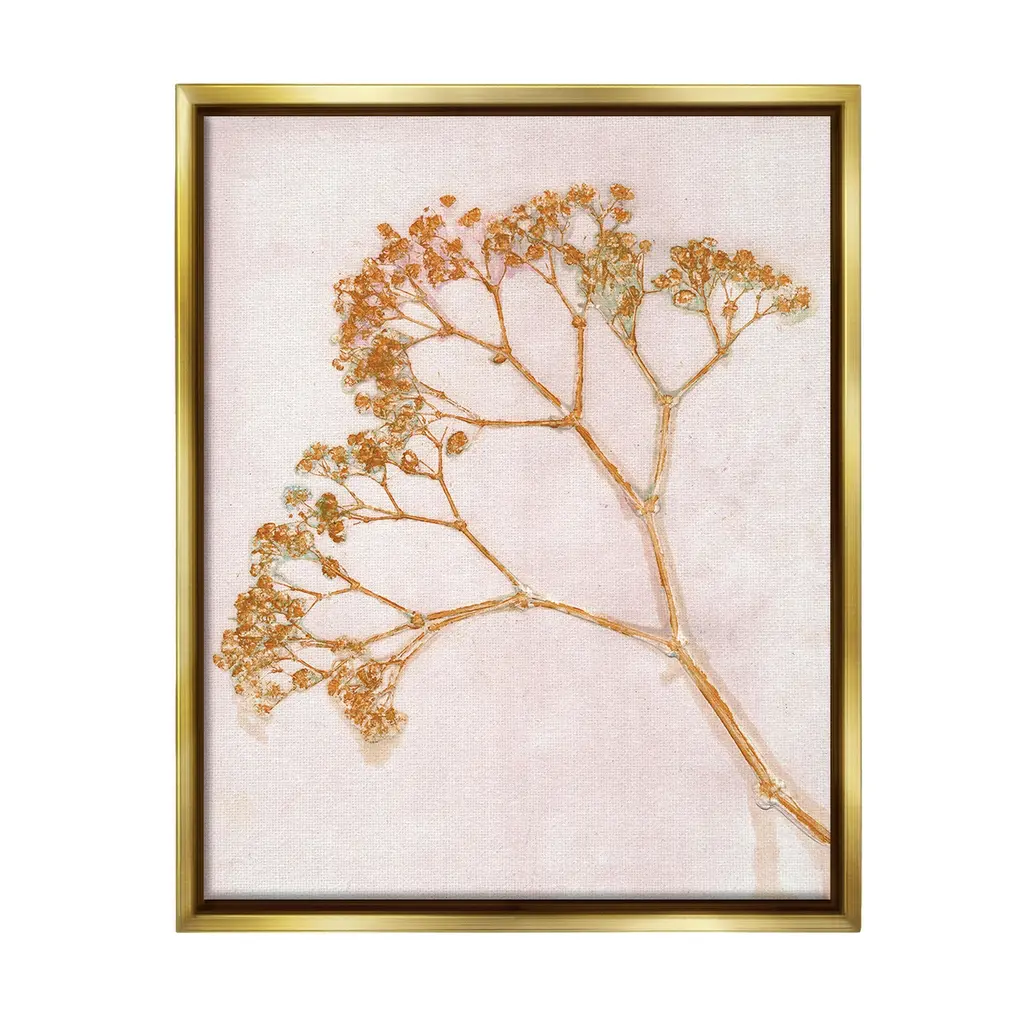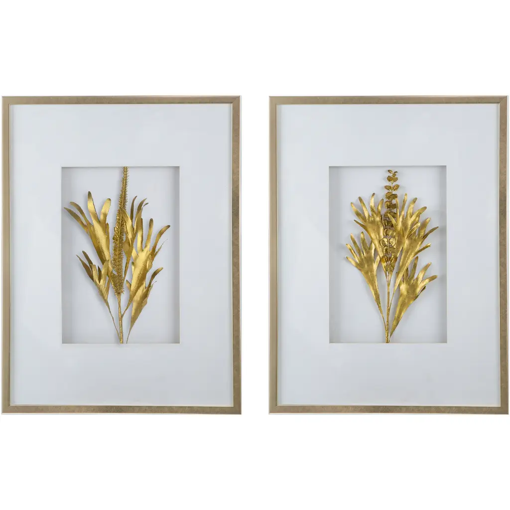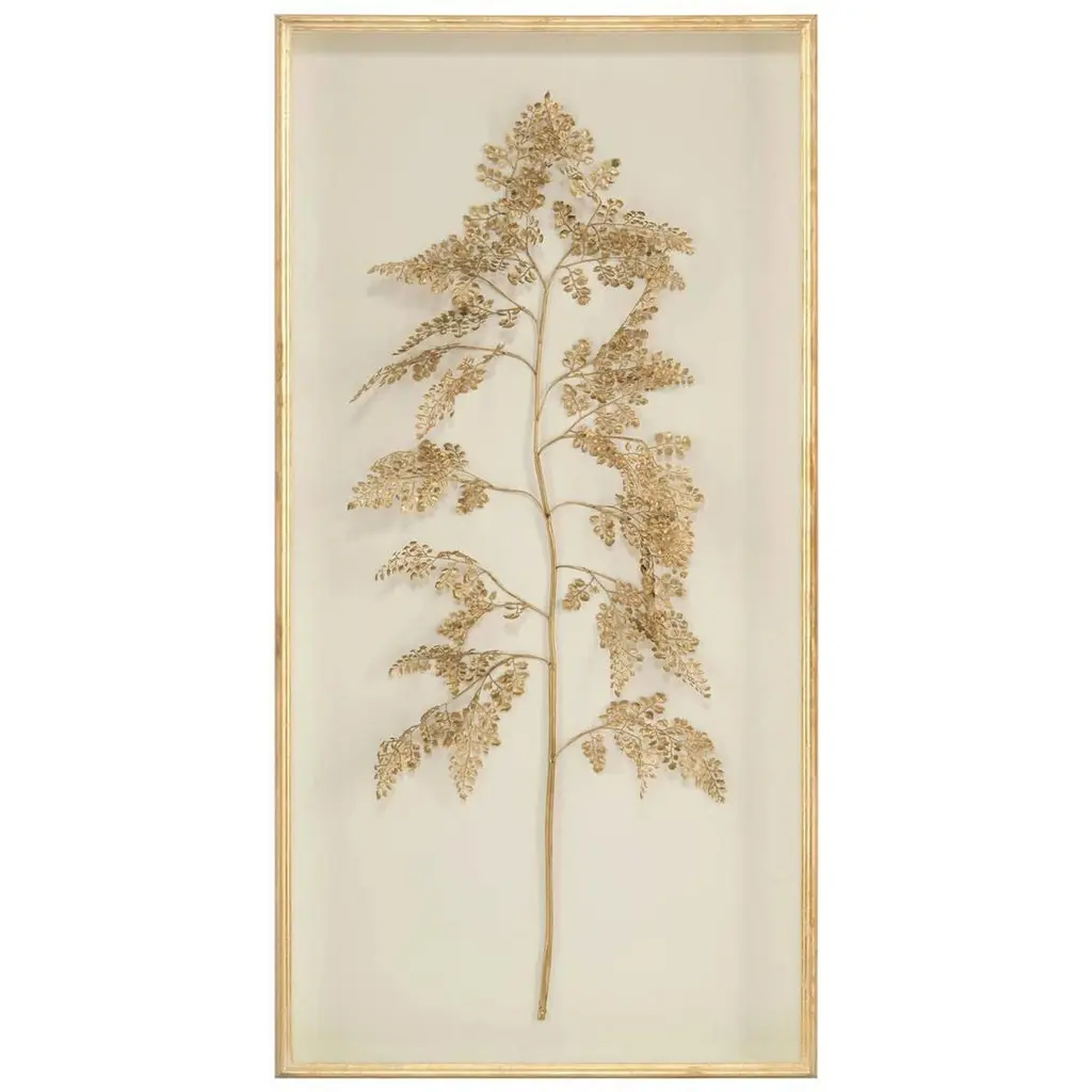 26.75"W X 52.75"H X 3"D A high-gloss golden fern frond dances on top of an ivory background. The piece is surrounded by a deep wood molding with a hand-applied finish of gold leaf. Disclaimer: The nature of the hand-applied gold leaf is delicate and b