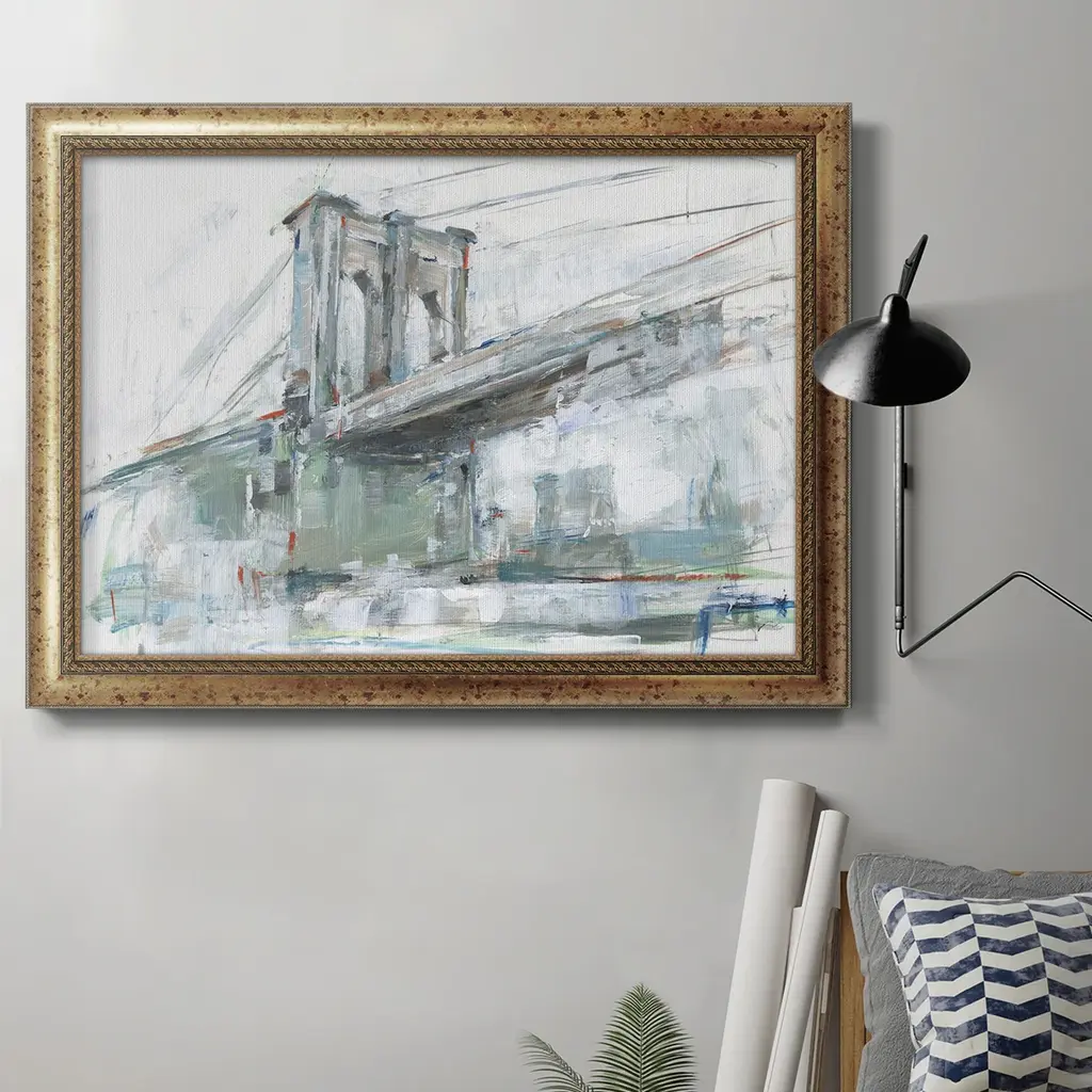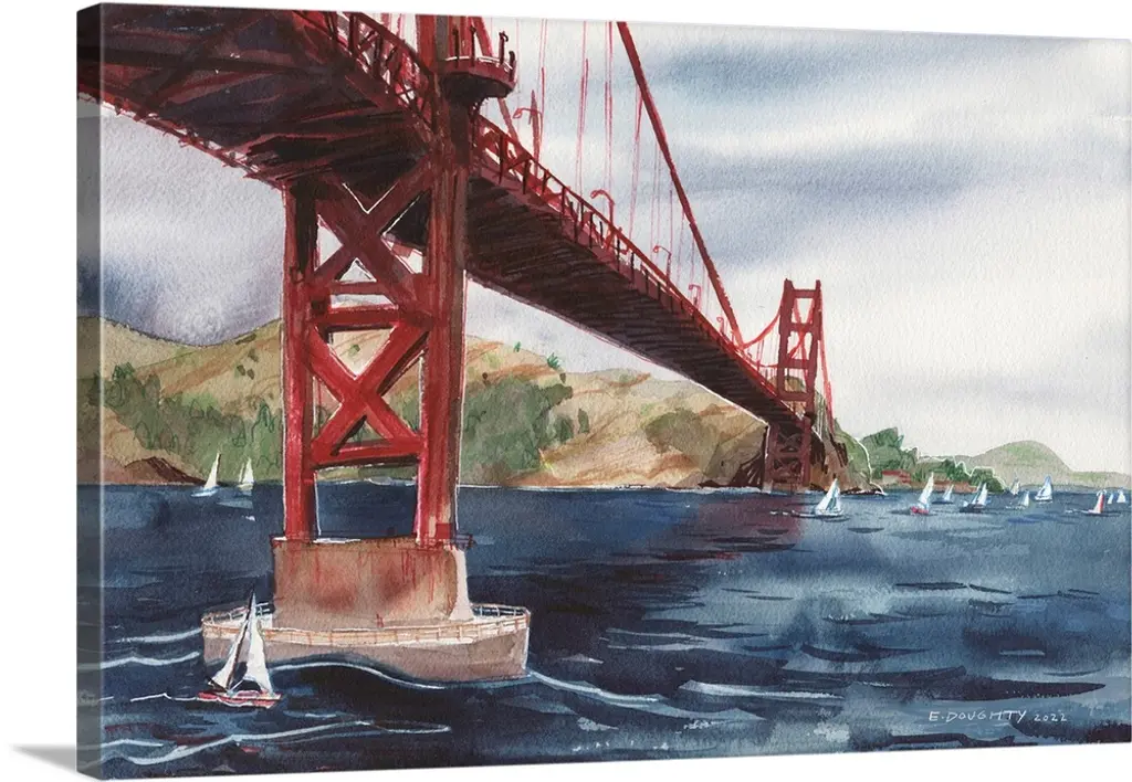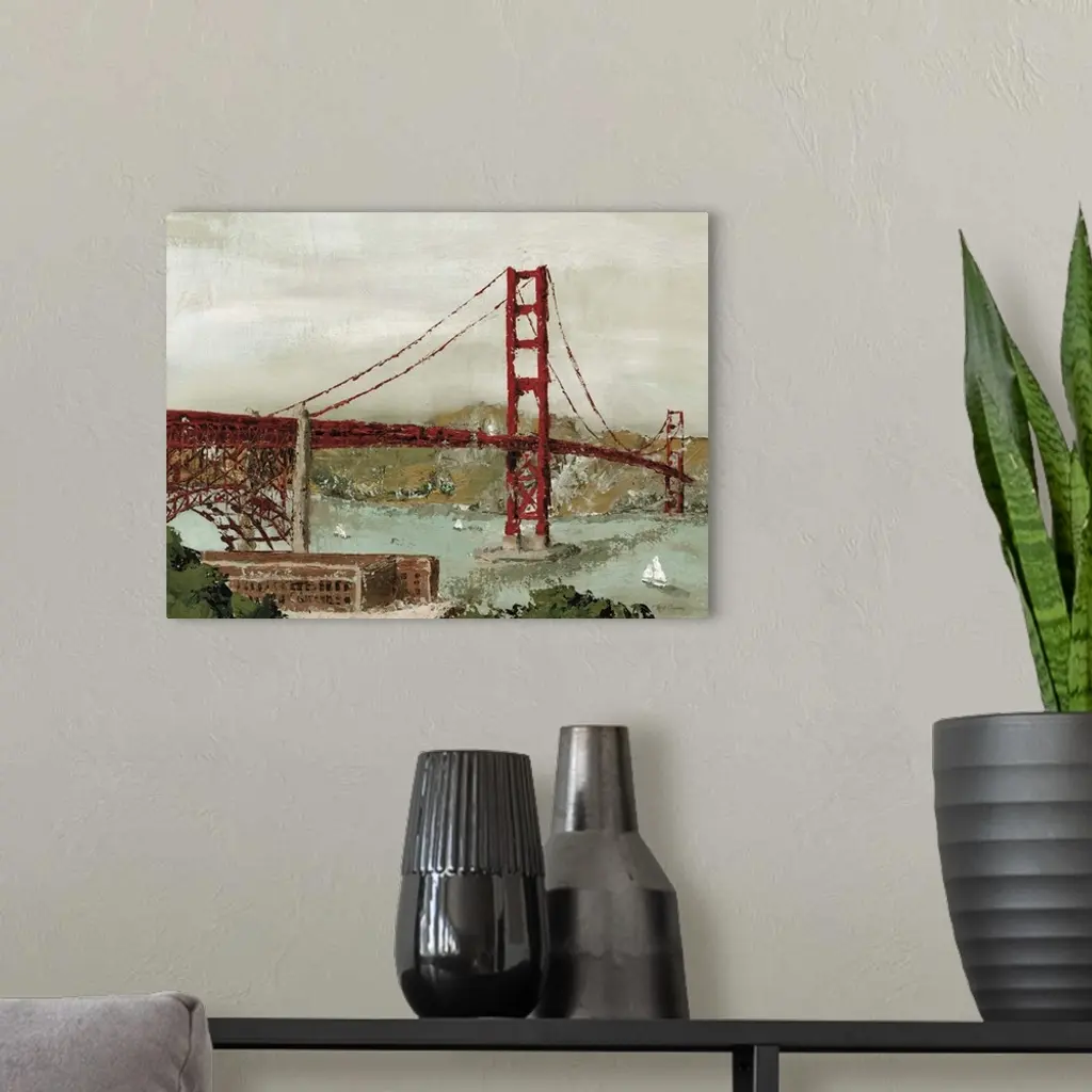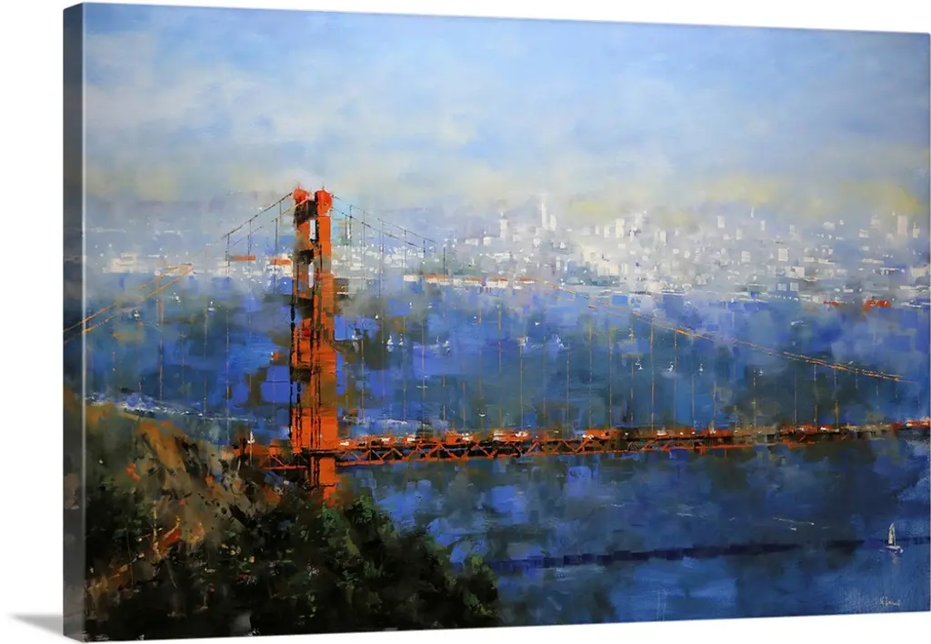 Contemporary painting of the Golden Gate Bridge in textured, subdue tones.