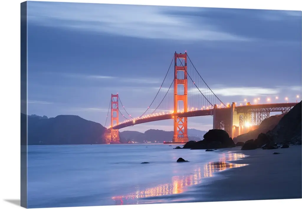The Golden Gate in Blue Background canvas art print is sure to make an impression on anyone who sees it. This artwork is gallery wrapped around a 1-inch solid wood frame and arrives carefully packaged and entirely ready to hang on the wall. Design Art only uses the highest resolution and pigments to ensure a crisp colorful print that is never faded or pixelated. This artwork is sure to be a conversation starter in any home or office.