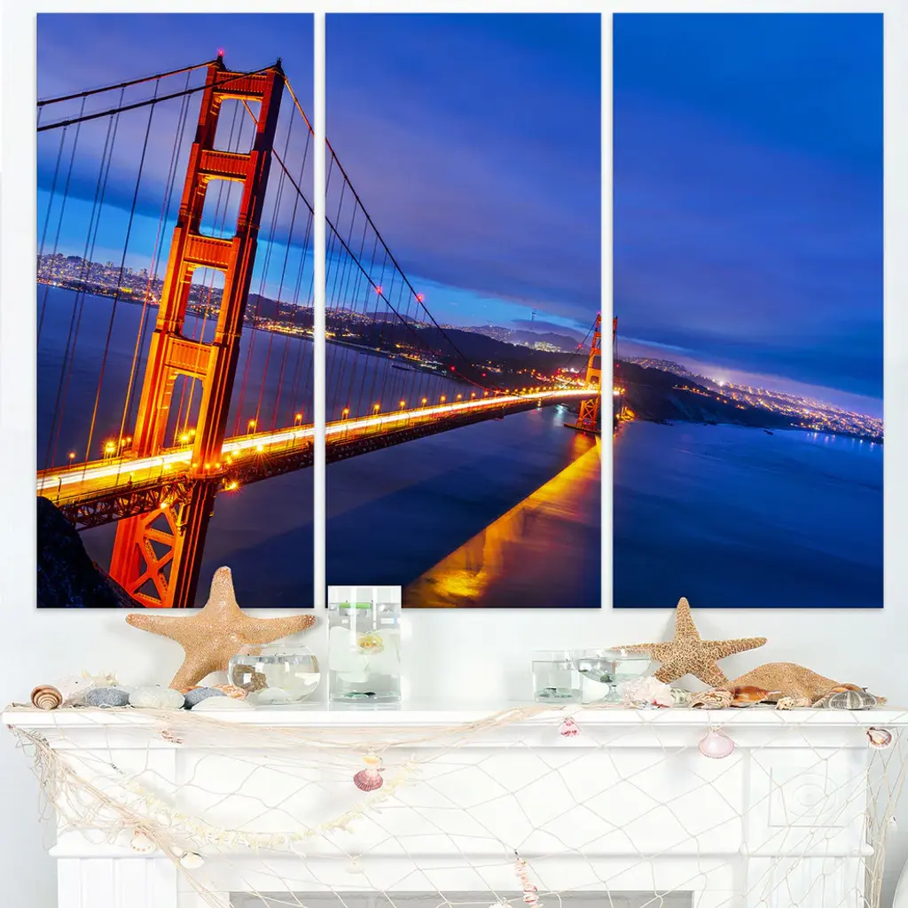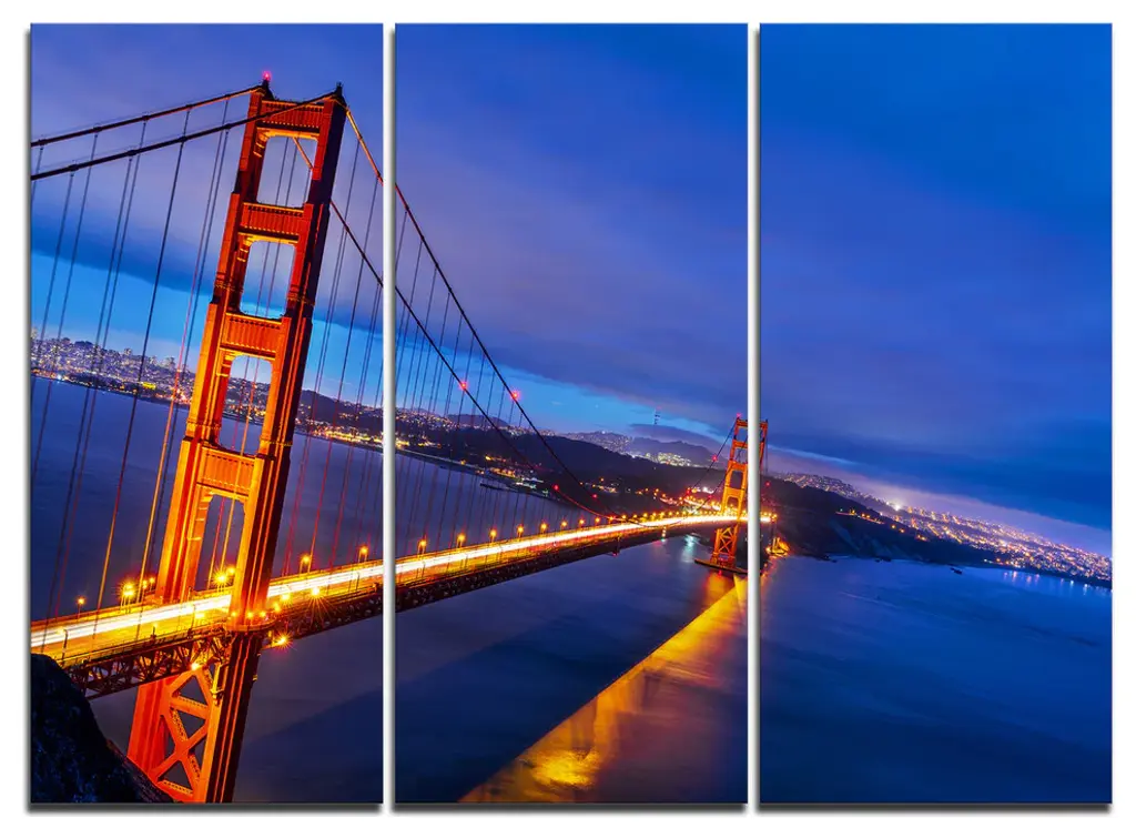 "Golden Gate In Blue Background" Sea Bridge Metal Wall Art, 3 Panels, 36"x28"