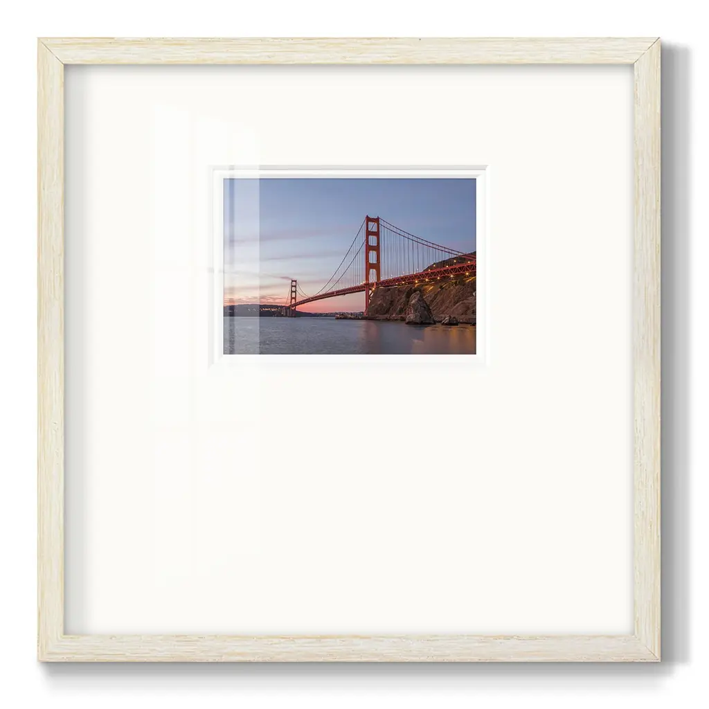 Golden Gate SpanPremium Framed Print A framed cold pressed paper print featuring superior double matting and quality frame. 2 SIZES AVAILABLE 16''X16''' - Overall Size 20''X20''' - Overall Size Each piece is made to order. Each piece comes with hanging hardware. Made in the USA Ready to Hang Giclee Paper Print Plexiglass Beveled Matt Board Double Matte Board