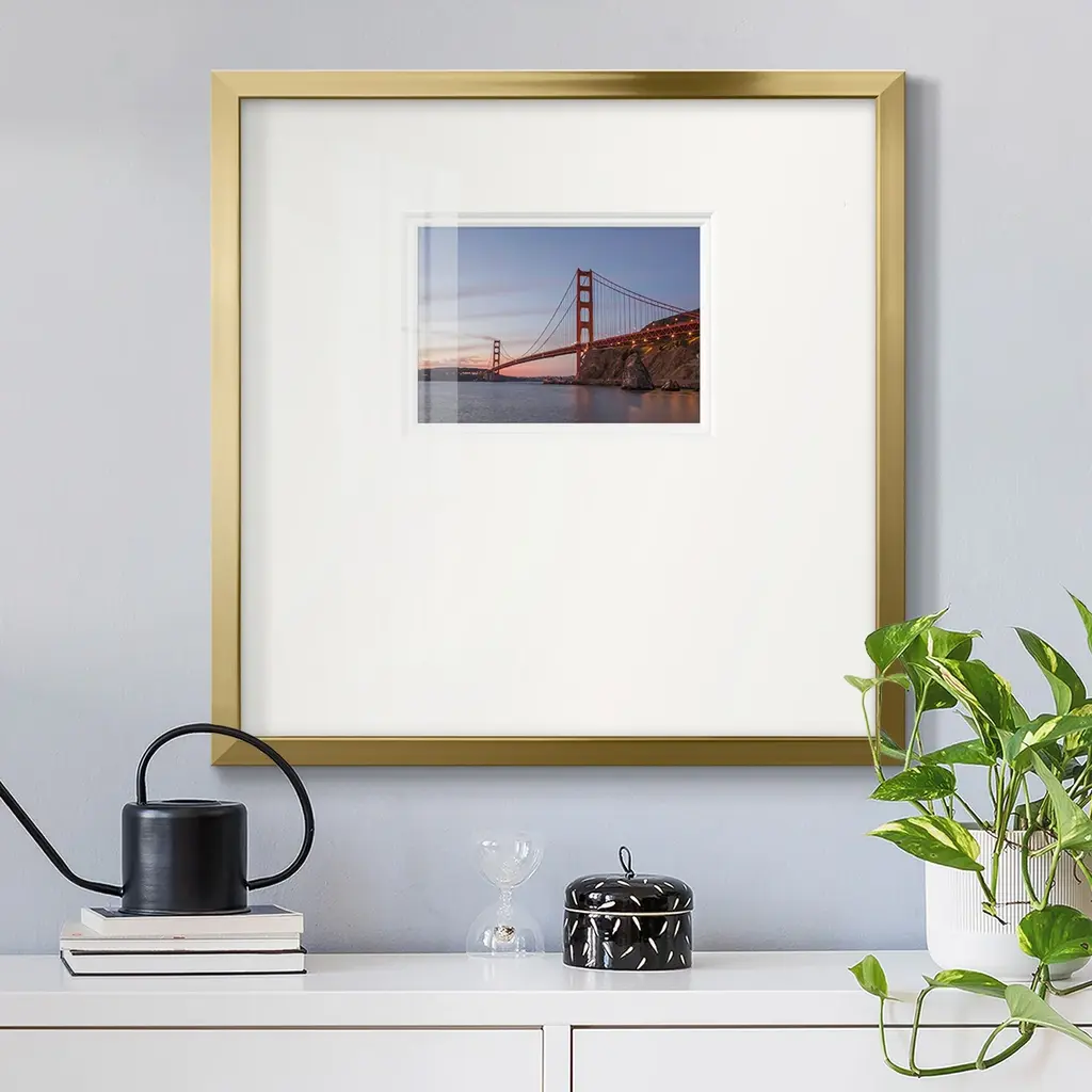 Golden Gate SpanPremium Framed Print A framed cold pressed paper print featuring superior double matting and quality frame. 2 SIZES AVAILABLE 16''X16''' - Overall Size 20''X20''' - Overall Size Each piece is made to order. Each piece comes with hanging hardware. Made in the USA Ready to Hang Giclee Paper Print Plexiglass Beveled Matt Board Double Matte Board