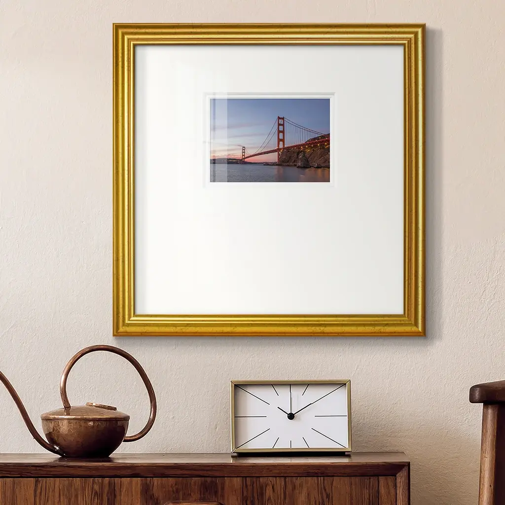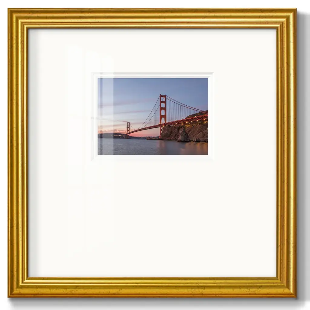 Golden Gate SpanPremium Framed Print A framed cold pressed paper print featuring superior double matting and quality frame. 2 SIZES AVAILABLE 16''X16''' - Overall Size 20''X20''' - Overall Size Each piece is made to order. Each piece comes with hanging hardware. Made in the USA Ready to Hang Giclee Paper Print Plexiglass Beveled Matt Board Double Matte Board