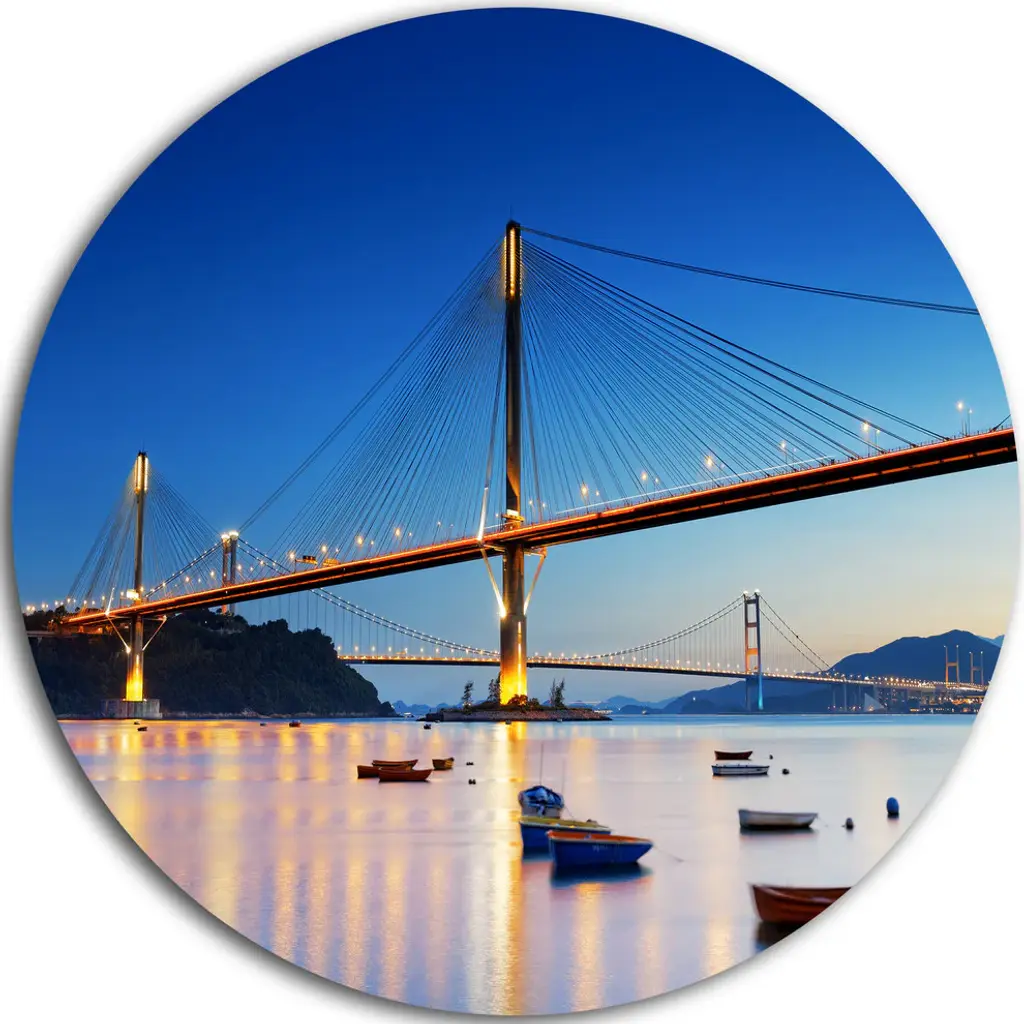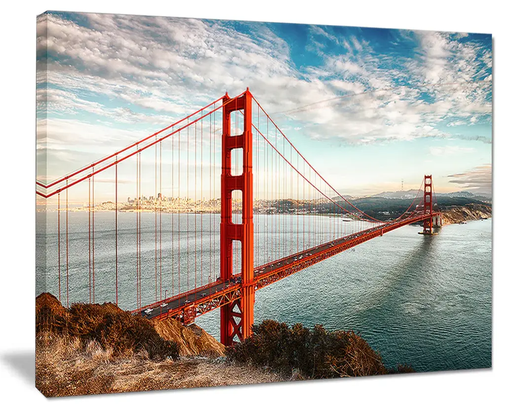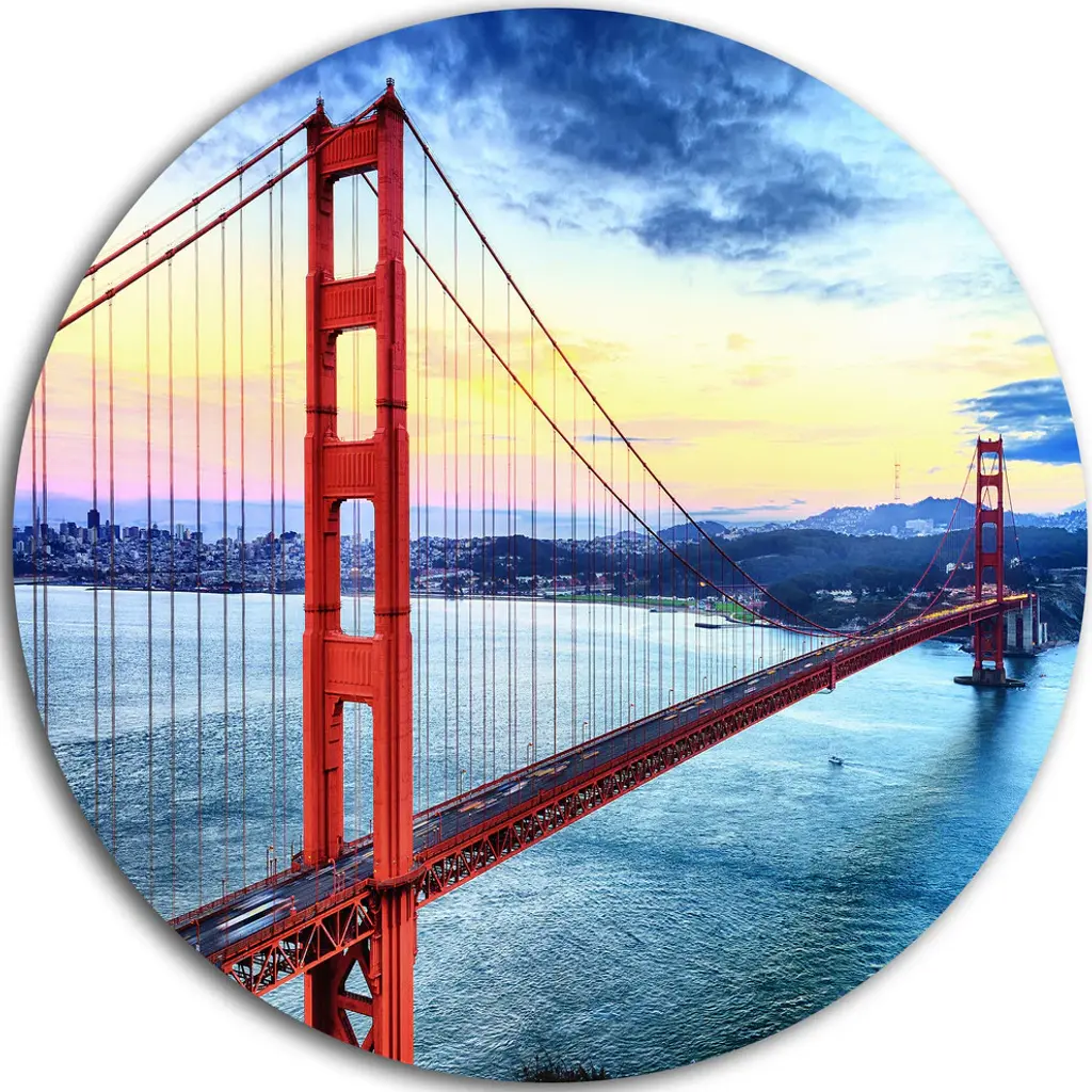 Bring Contemporary Abstraction to your home with this large Circle Metal wall art. This Golden Gate under Cloudy Sky Metal Artwork makes it the focal point of any room or office. - White Gloss Coating ensures colors are extra vibrant with light reflection.- Aluminum grade Sheet Metal with 1 inch mounting frame on the back giving the illusion that the artwork is floating on the wall..- Mounting Brackets are included along with instructions.- High Quality Digital images are created directly into a glossy aluminum panel producing a stunning and captivating print into the glossy finish of the metal.- Water, Fire and Scratch resistant HD Aluminum panels.- Looks better than any photo paper and guaranteed to last at least 20 years- Easy to clean with a microfiber cloth. Colors are far superior to regular Canvas Art. - Easy to Hang