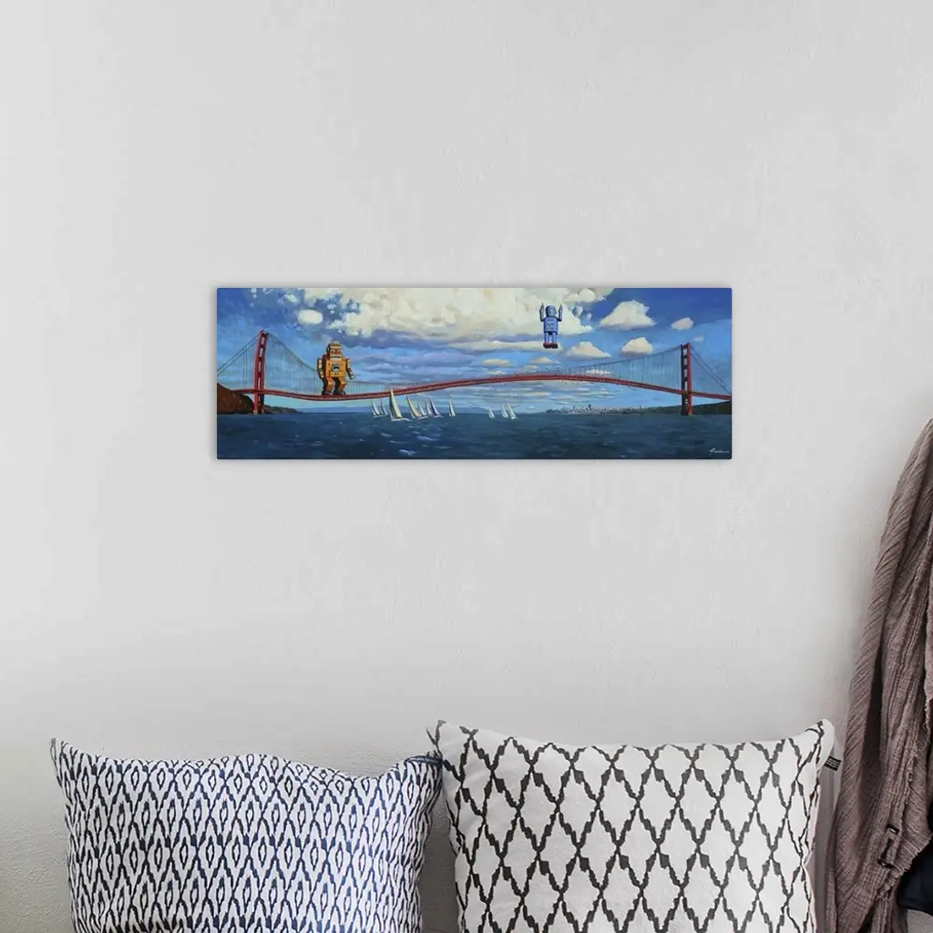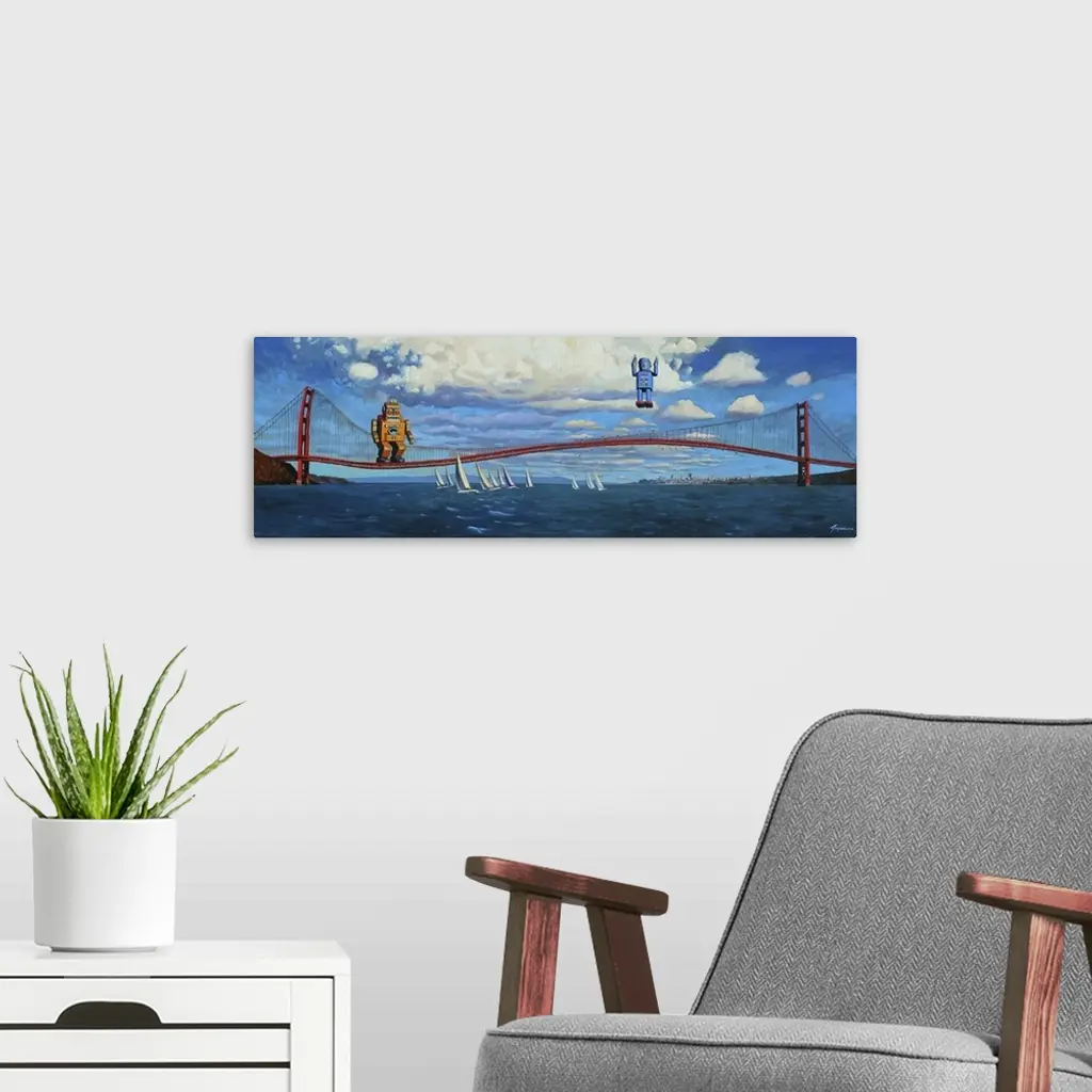 A contemporary painting of two retro toy robots using the Golden Gate Bridge to jump and bounce into the air.