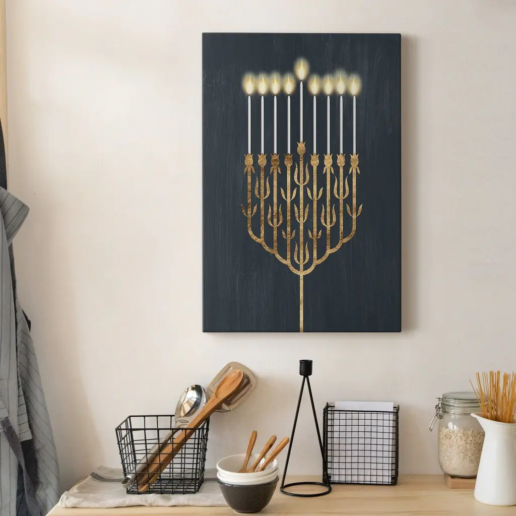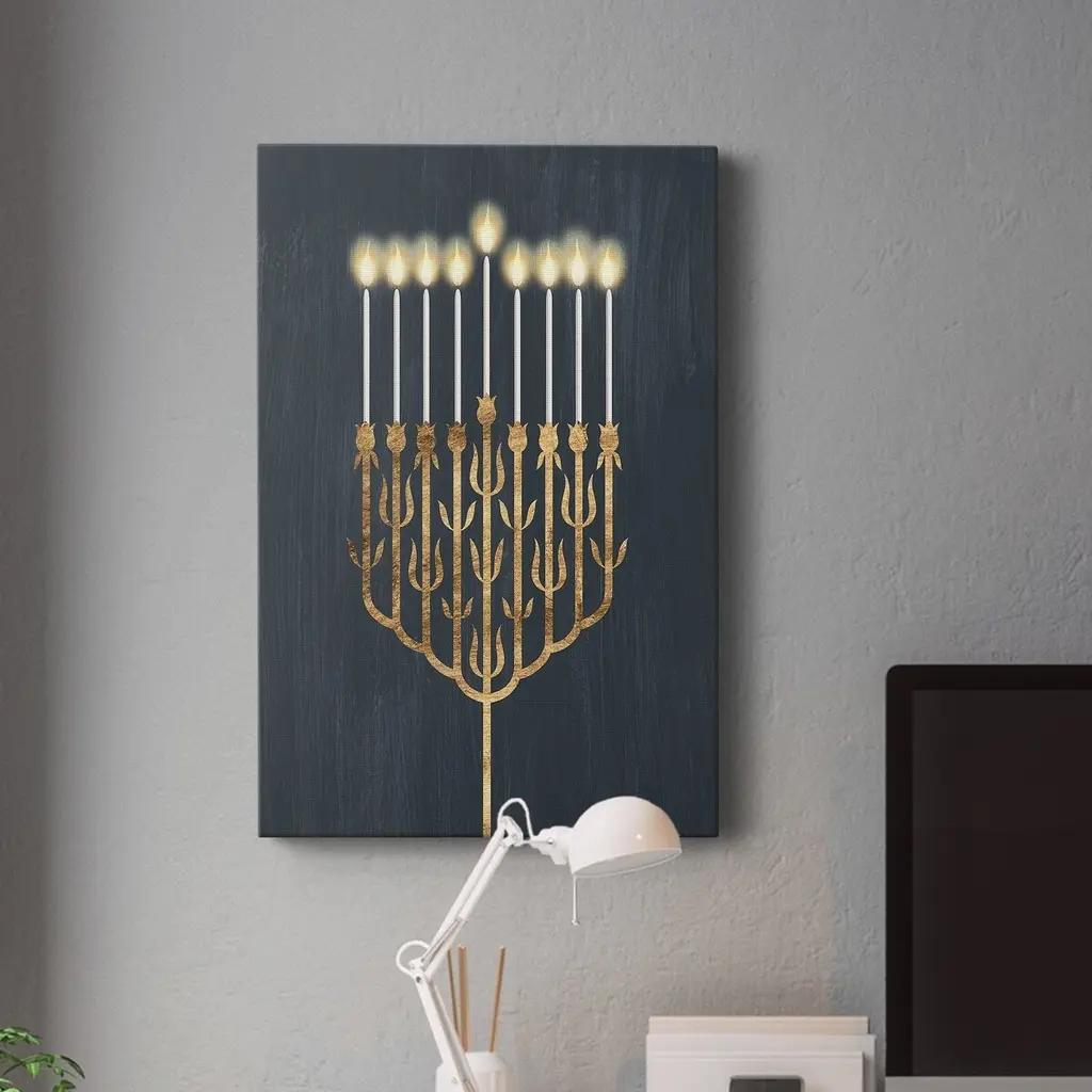 Golden Hanukkah II Premium Gallery Wrapped Canvas - Ready to Hang A premium hand stretched gallery wrapped canvas print created to last. Featuring a beveled a solid wood stretcher bar, each piece comes ready to hand 5 SIZES AVAILABLE 8''X12'' - Overall Size 16'X20'' - Overall Size 24''x32'' - Overall Size 30''x40'' - Overall Size 36''x48'' - Overall Size Each piece is made to order. Built to Last Each piece comes ready to hang Solid wood stretcher Fade and Water resistant Made domestically