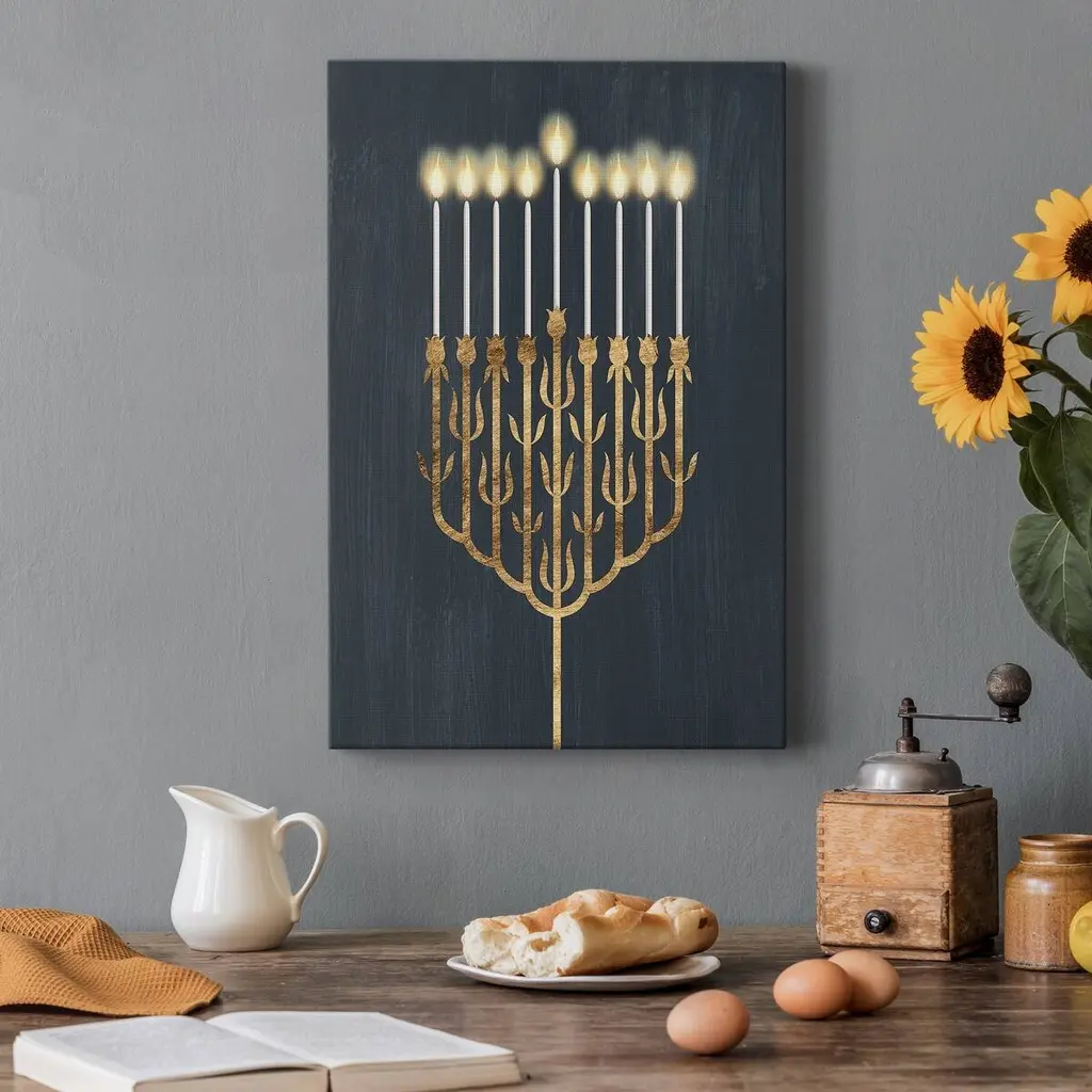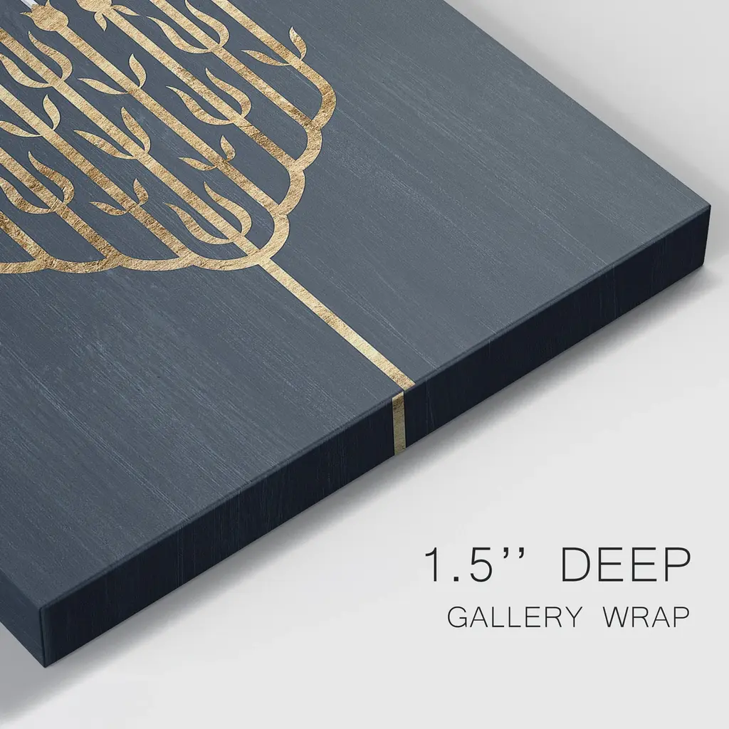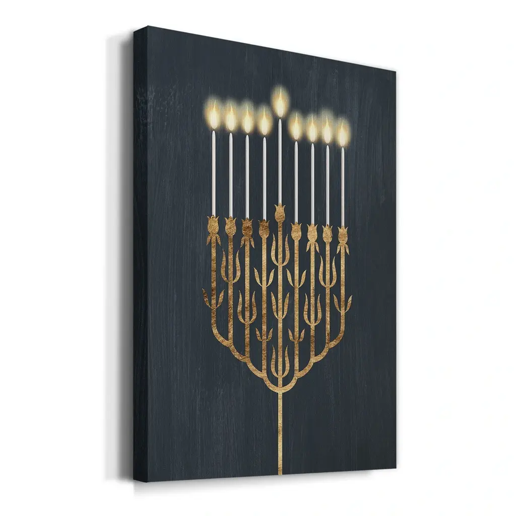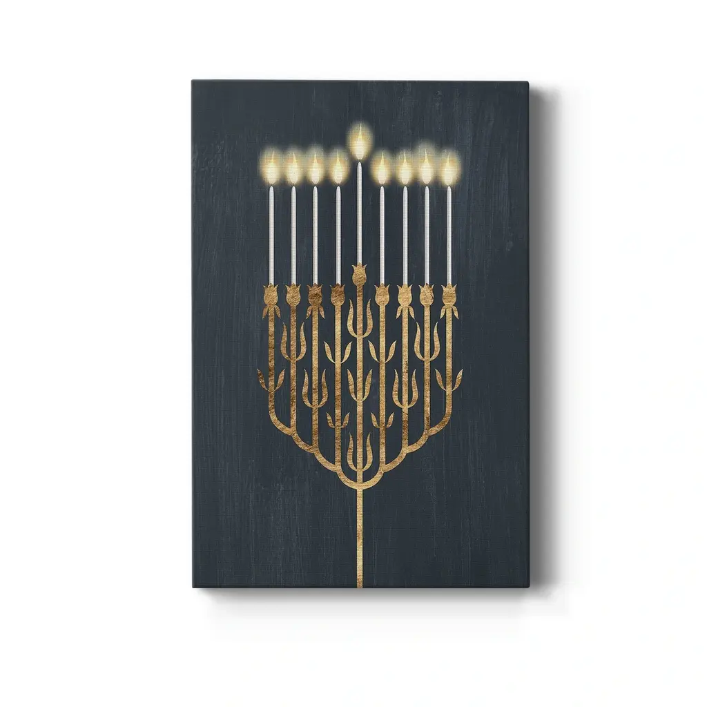 Golden Hanukkah II Premium Gallery Wrapped Canvas - Ready to Hang A premium hand stretched gallery wrapped canvas print created to last. Featuring a beveled a solid wood stretcher bar, each piece comes ready to hand 5 SIZES AVAILABLE 8''X12'' - Overall Size 16'X20'' - Overall Size 24''x32'' - Overall Size 30''x40'' - Overall Size 36''x48'' - Overall Size Each piece is made to order. Built to Last Each piece comes ready to hang Solid wood stretcher Fade and Water resistant Made domestically