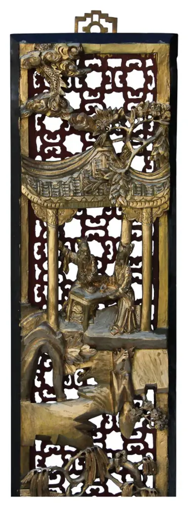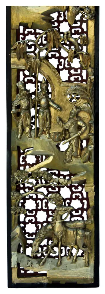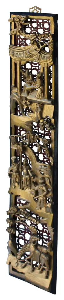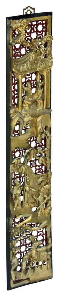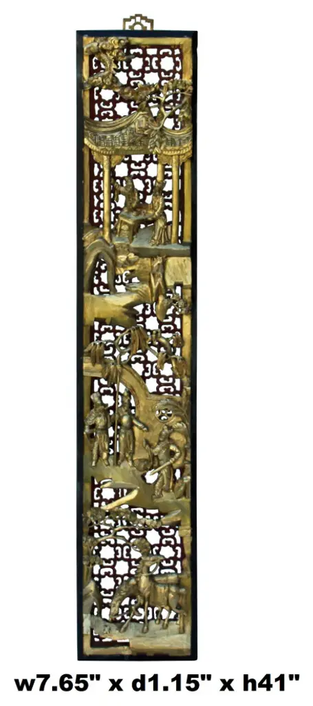 Chaozhou is also called Teochew, famous for its wood carving. This wall panel is carved with an ancient warriors statue with the golden lacquer color painting. it was restored from an old panel to its original condition by the skillful master. Unique with character, beautiful wall decor for home and office. Dimension: w7.65" x d1.15" x h41"Origin: Chaozhou (Teochew) ChinaPeriod: recent madeCondition: Handmade, good condition