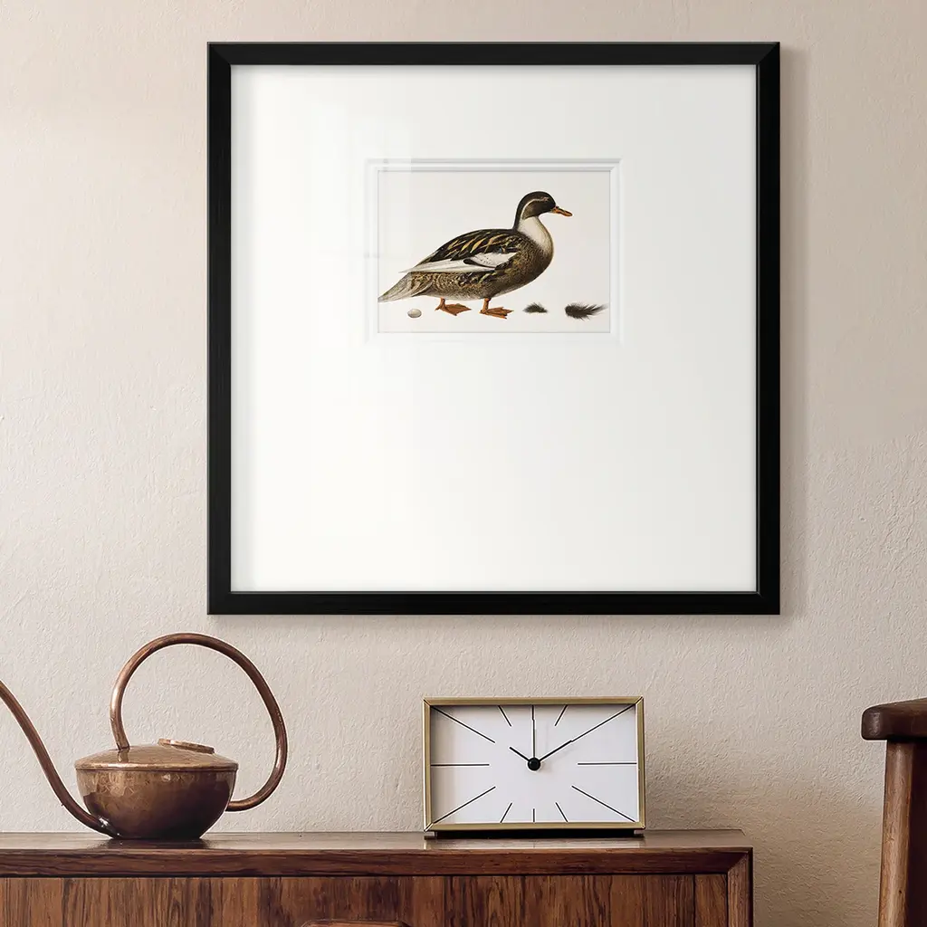 Golden MallardPremium Framed Print A framed cold pressed paper print featuring superior double matting and quality frame. 2 SIZES AVAILABLE 16''X16''' - Overall Size 20''X20''' - Overall Size Each piece is made to order. Each piece comes with hanging hardware. Made in the USA Ready to Hang Giclee Paper Print Plexiglass Beveled Matt Board Double Matte Board