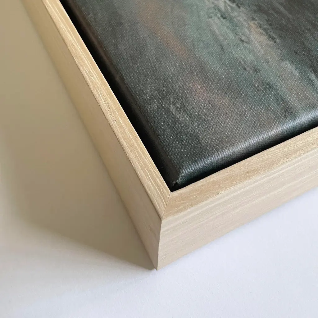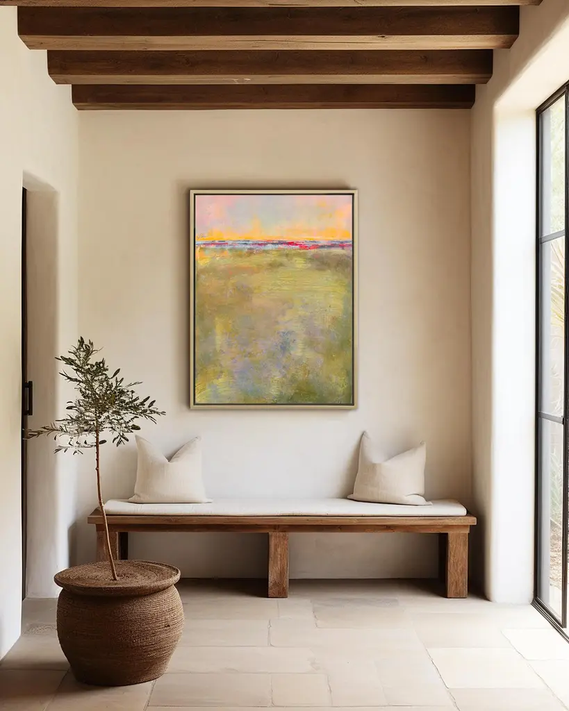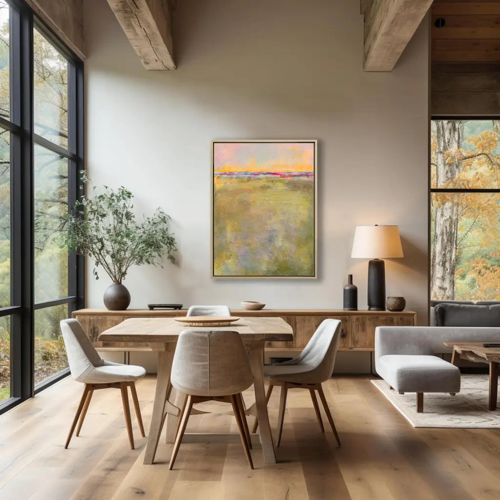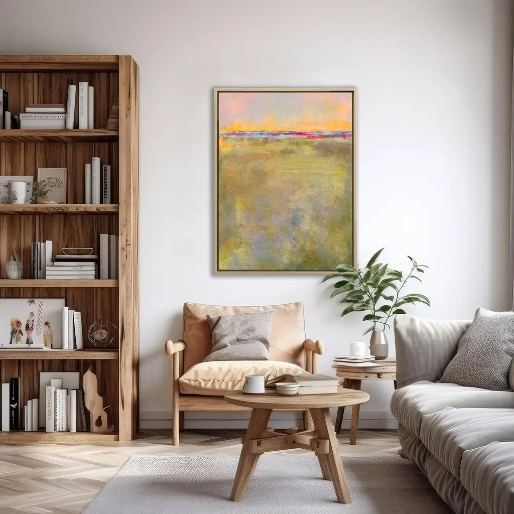 "Golden Moment" radiates serene beauty with textured earth tones of green and brown, evoking fertile land. Vibrant reds hint at a distant horizon, while a peach and yellow sky fosters tranquility and reflection. Inspired by natural landscapes, this piece seamlessly blends intimacy with expansiveness, bringing a calming and elegant presence to any space. • Archival giclée print on stretched canvas, with the image wrapping seamlessly around the edges for a clean, gallery‑style finish • Slim, simple natural wood frame option adds subtle warmth without distracting from the artwork • Ships free and arrives wired, ready to elevate your space with style