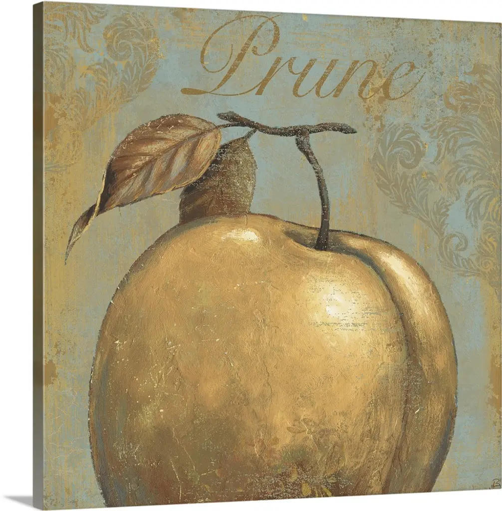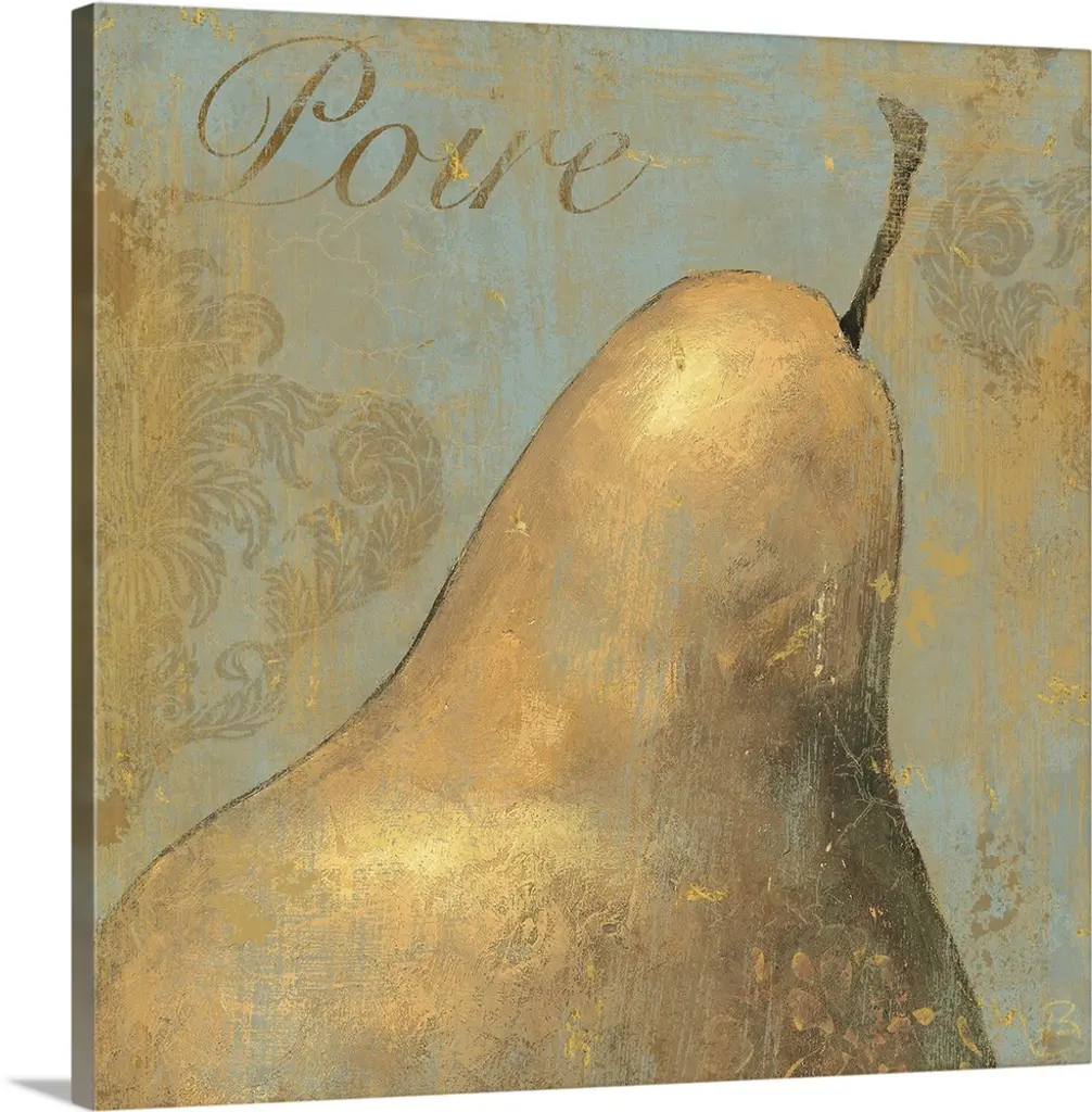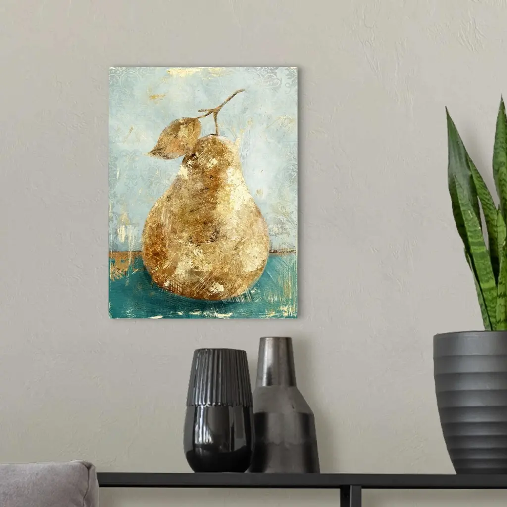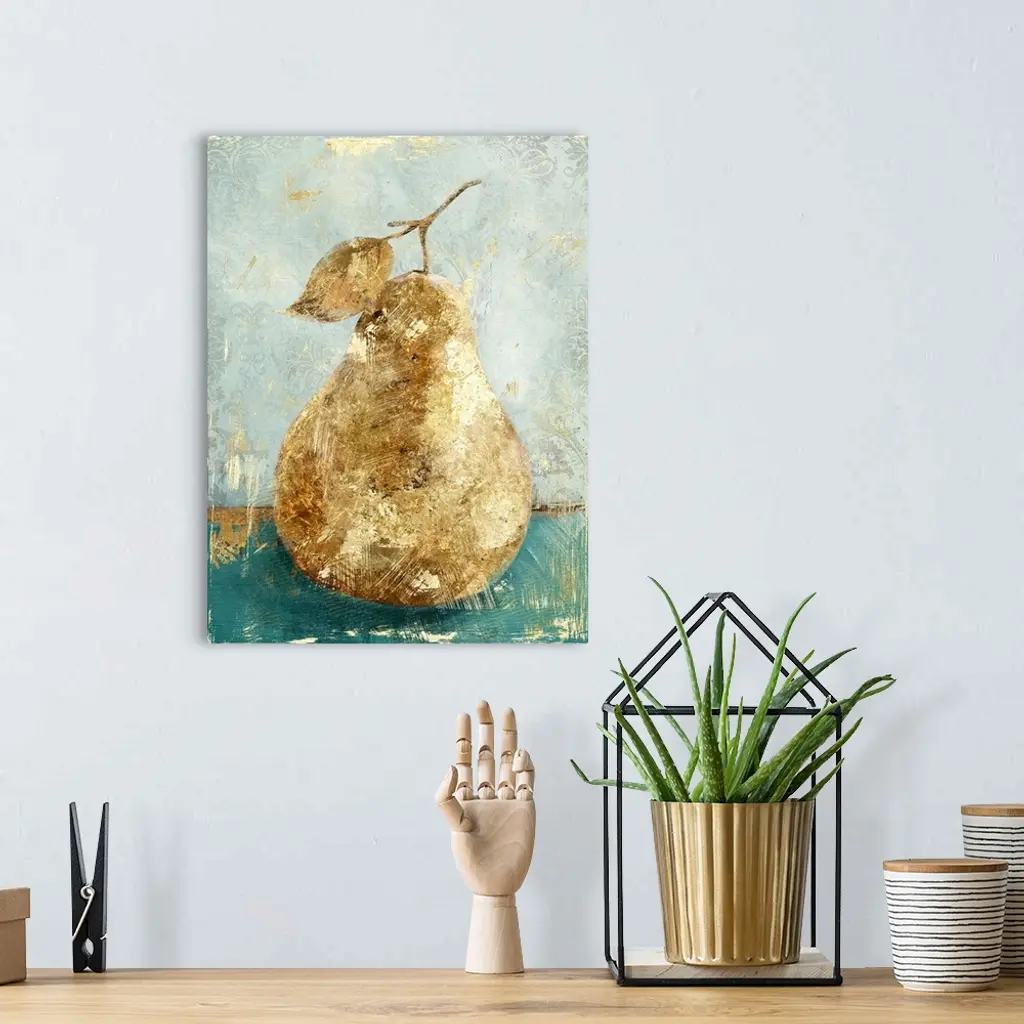 A still life painting of a golden pear on a teal and gray floral background with a distressed appearance of gold scratches.