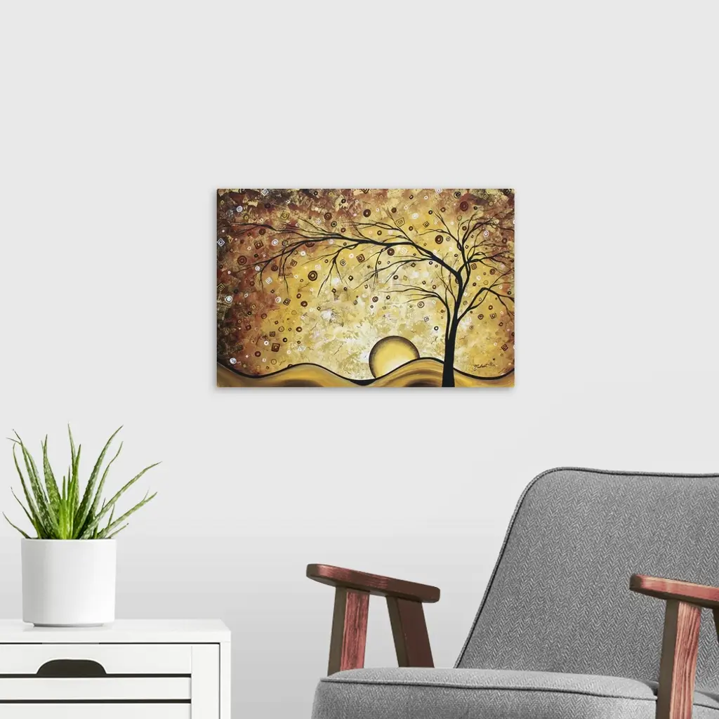 Contemporary art piece of a giant, leafless tree on rolling hills with the sun setting and star shapes twinkling in the sky.